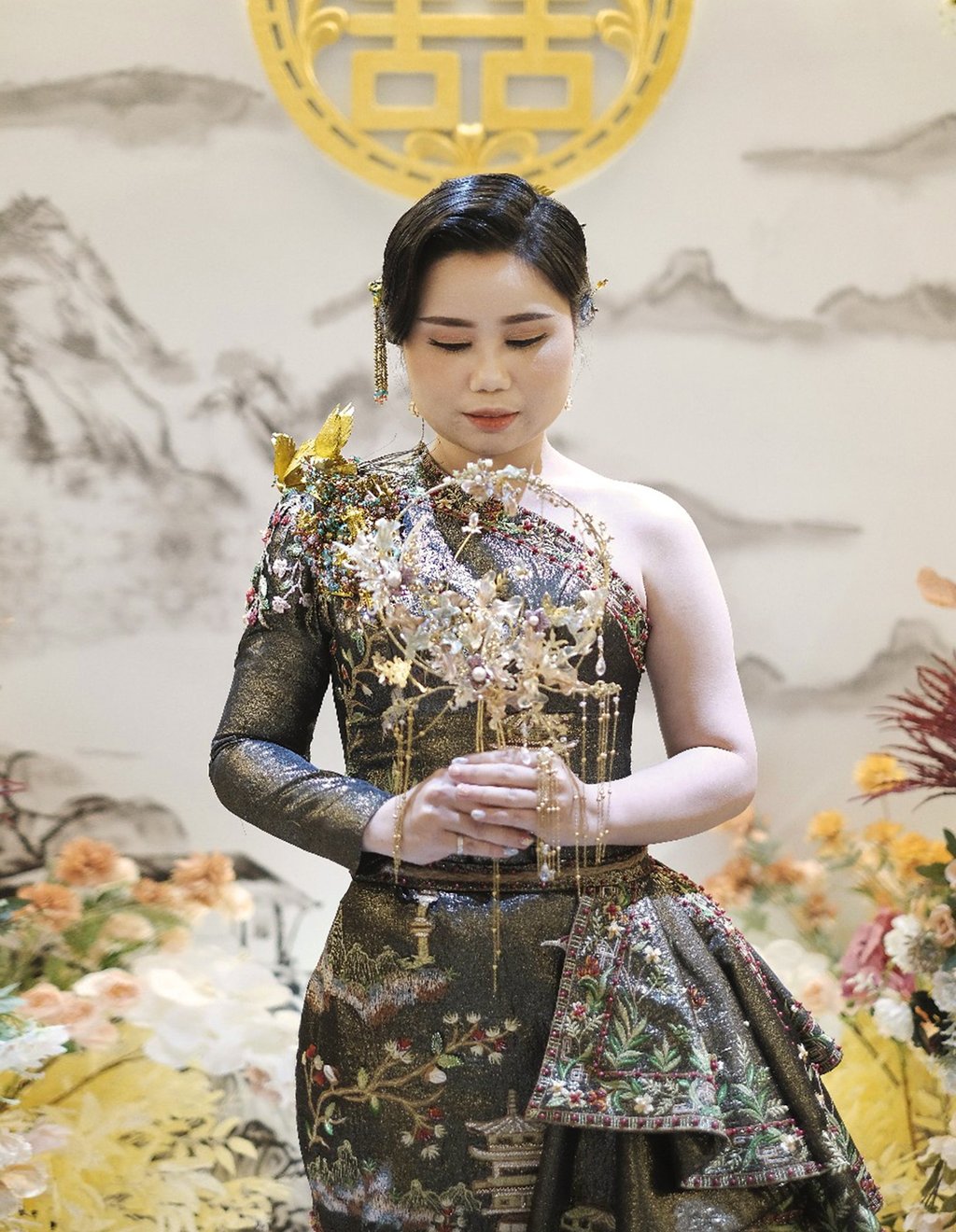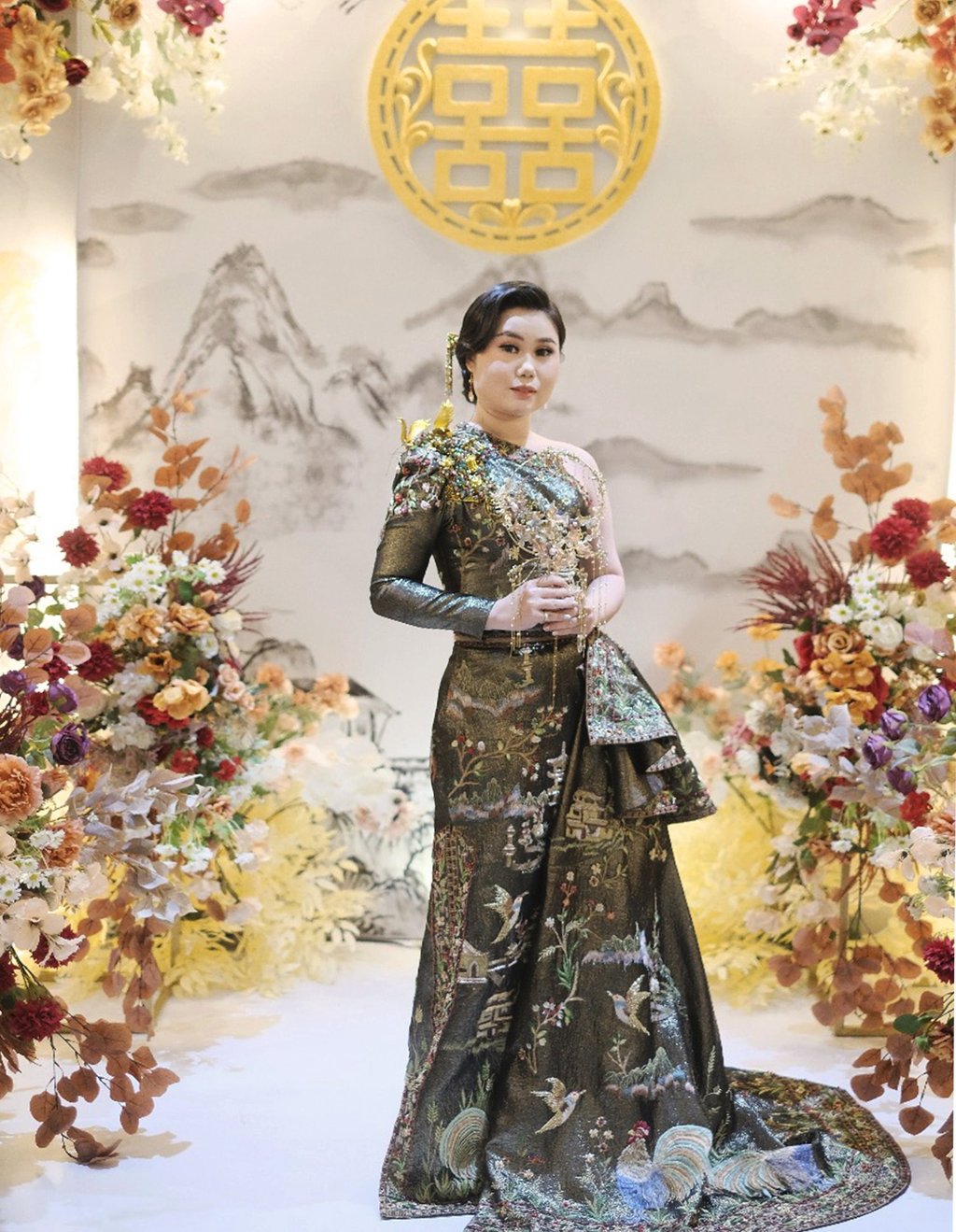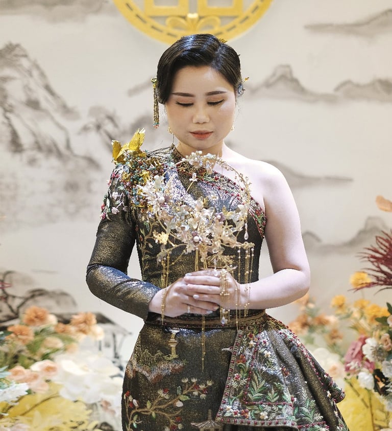 Drenched in opulence, this handcrafted champagne gown is a poetic tribute to Eastern elegance. Lavished with intricate embroidery of cranes, lotus blossoms, and gilded pagodas, each motif tells a timeless story of harmony and heritage. champagne gold lace and an embroidered outer, inspired by the serene beauty of a Kyoto crane garden. The crane, a symbol of longevity, peace, and harmony, mirrors the wearer’s refined yet graceful spirit, harmonious colors embody balance and tranquility.