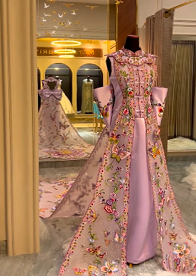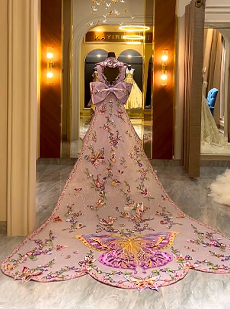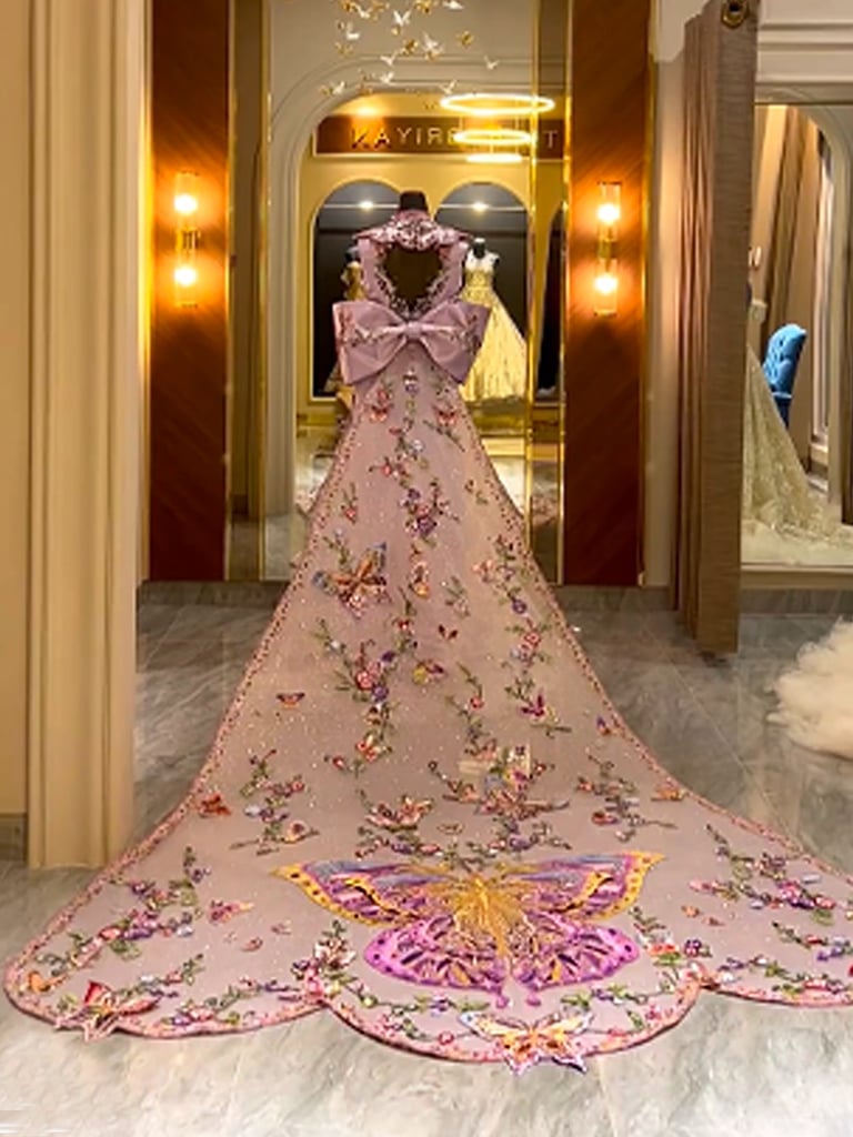 Adorned with delicate embroidery of butterflies and blooming florals, this ethereal lilac gown unfurls like a fairytale in motion, regal silhouette, cascading train, and whimsical bow detail blend of grace with fantasy elegance.