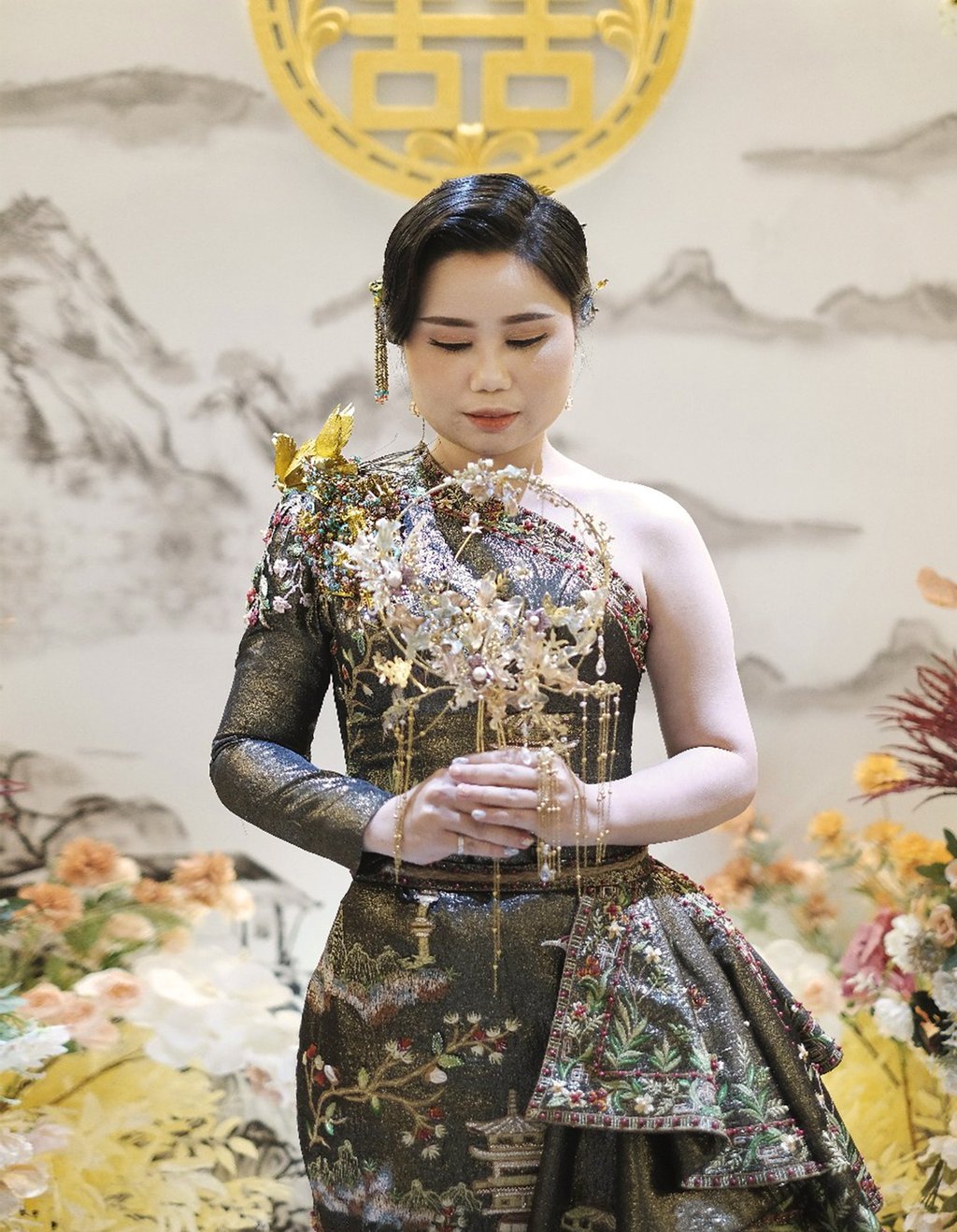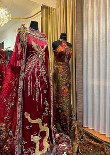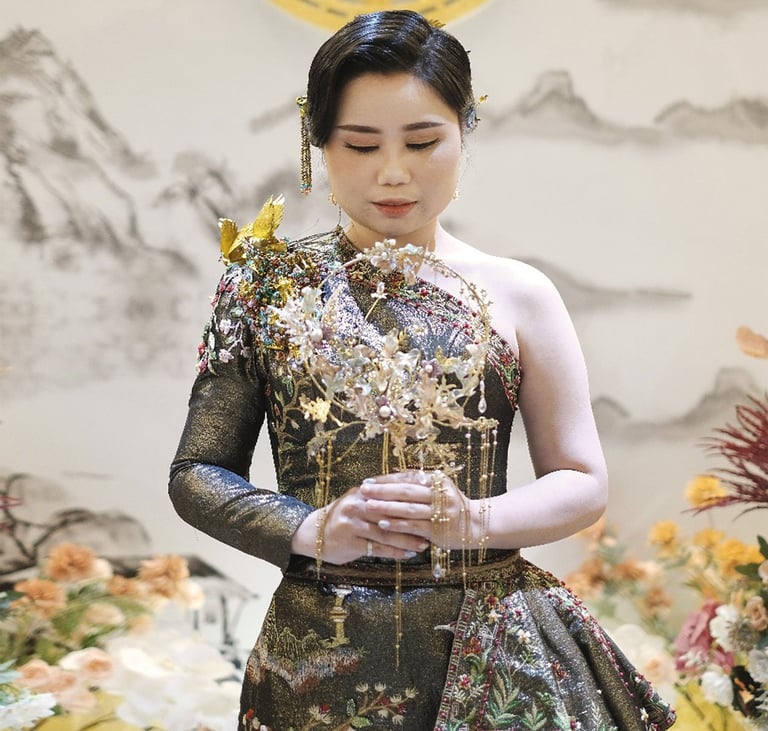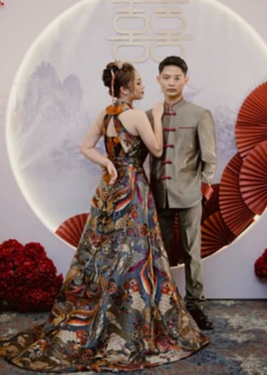 In a bold reinterpretation of tradition, The Dawn Herald is a modern asymmetric cheongsam that defies symmetry in favor of expressive freedom. Crafted from shimmering, textured jacquard in deep olive green, the gown evokes the richness of fertile earth kissed by morning light. Its long sleeves and uneven chest-shoulder silhouette create intentional imbalance—symbolizing the beauty found in imperfection and the courage to stand apart.