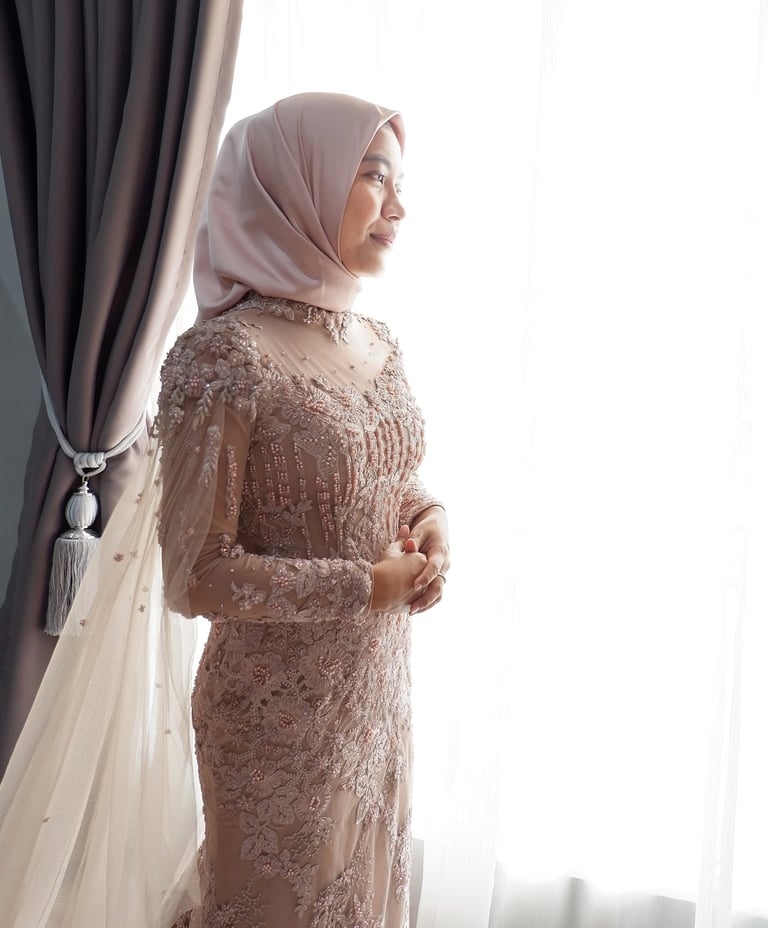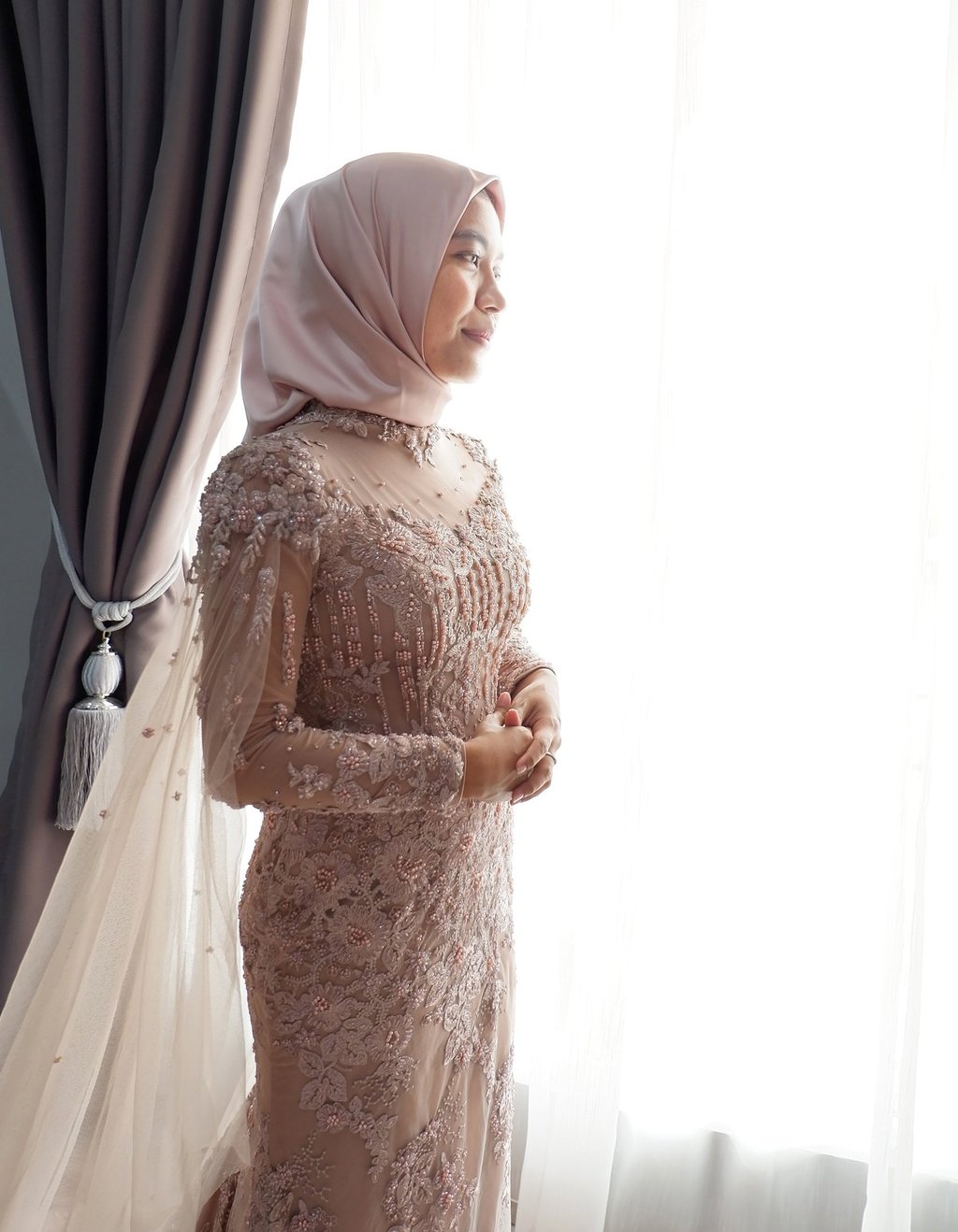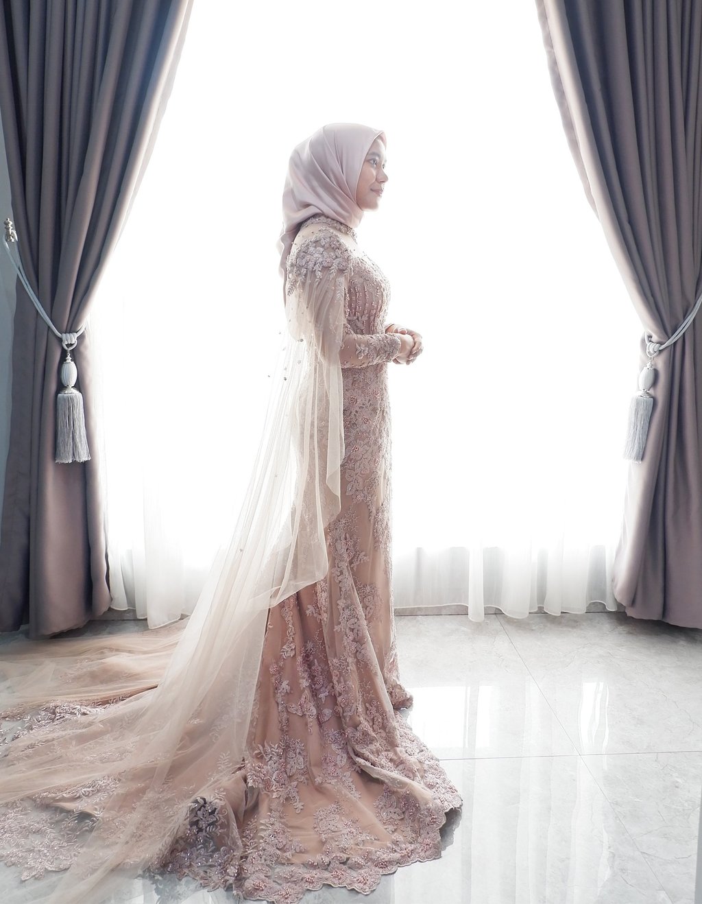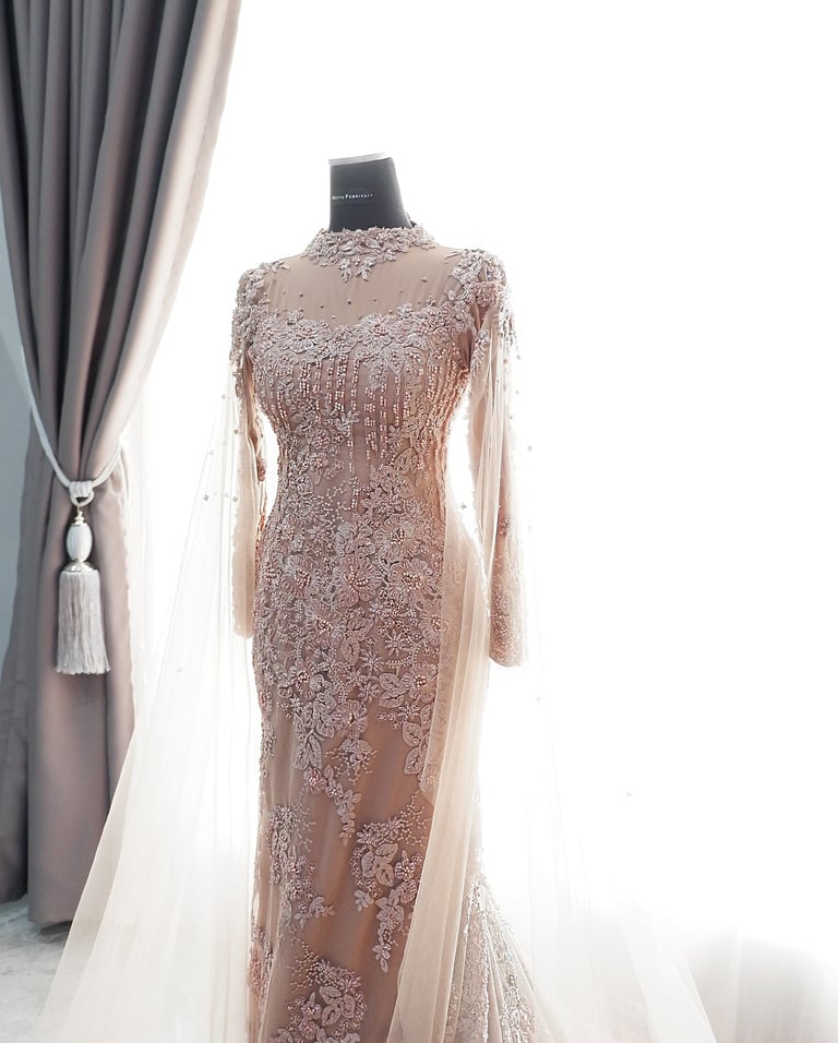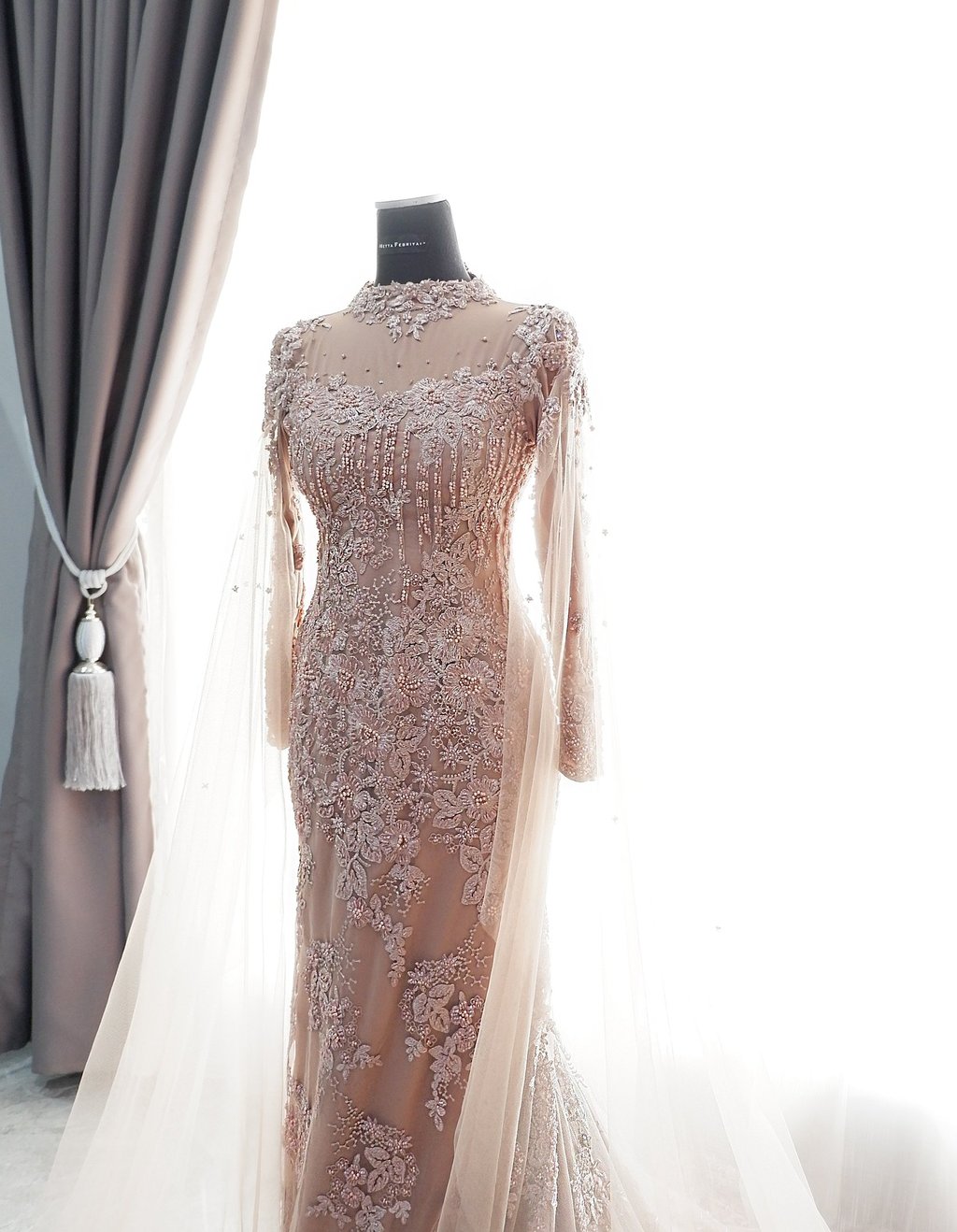 Draped in the hush of dusty lavender, elegance and grace in every fold, devotion in every thread. This modest ensemble shimmers with delicate lace, cascading pearls, and full-beadwork detailing. A quiet radiance for those who carry stillness with strength, where every detail reflects timeless poise and gentle strength. Evokes elegance and spiritual peace through clothing.