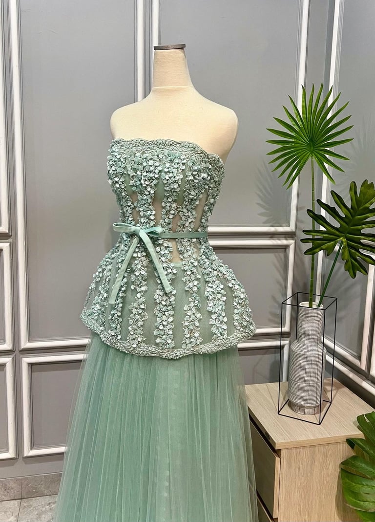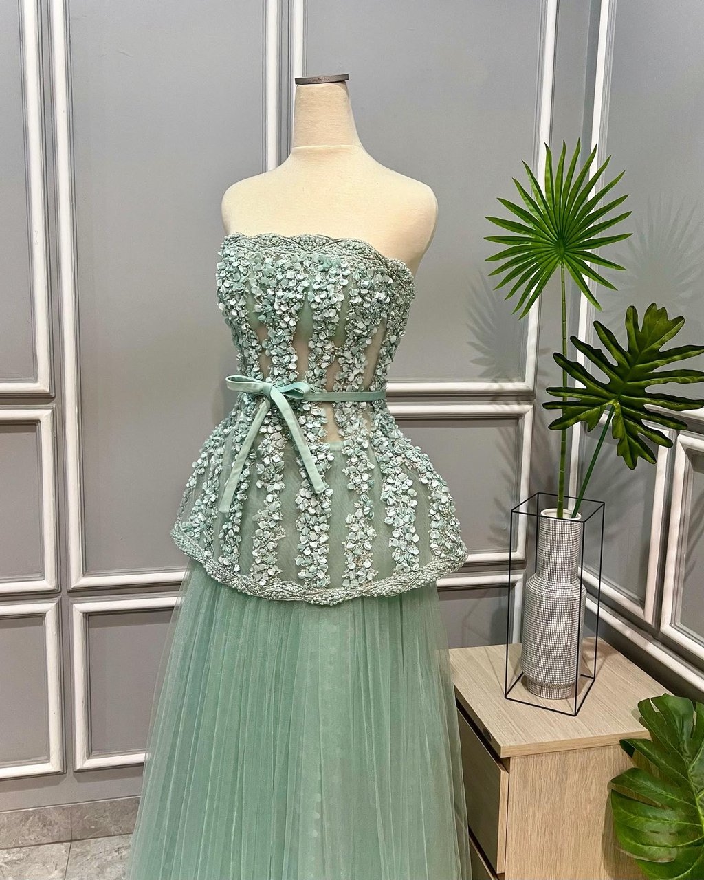 Soft as a breeze and blooming with grace, subtle sage green gown features a delicately appliquéd floral top paired with a flowing tulle skirt. Effortlessly romantic and quietly enchanting.