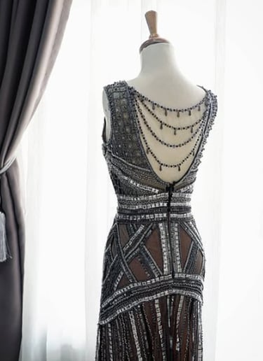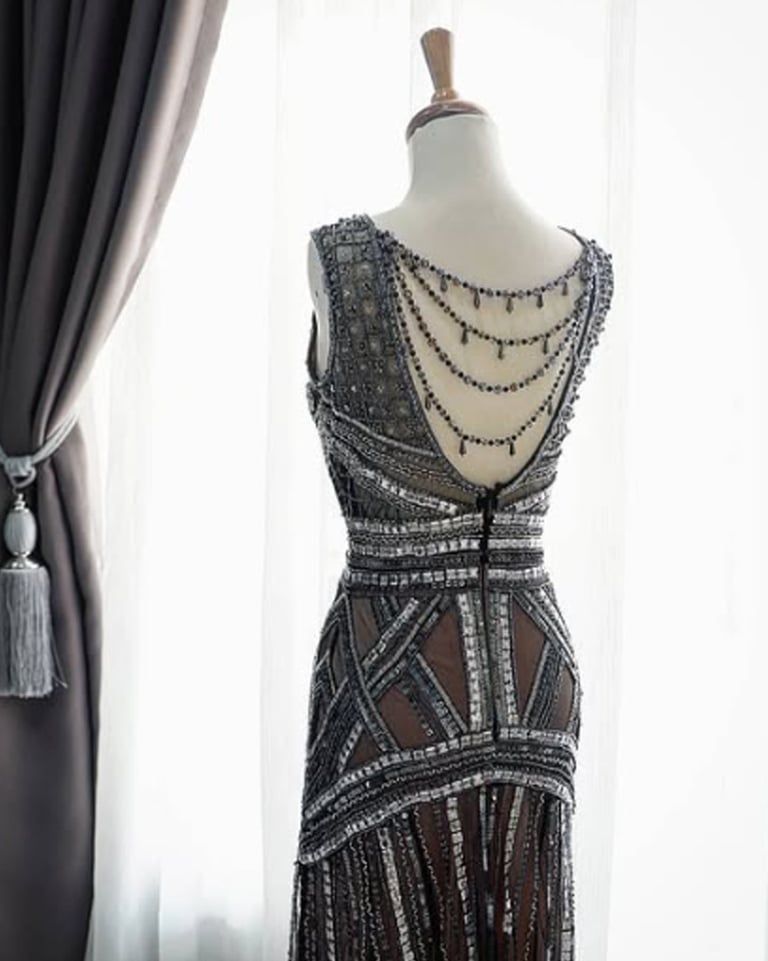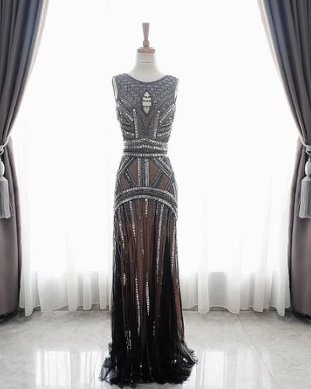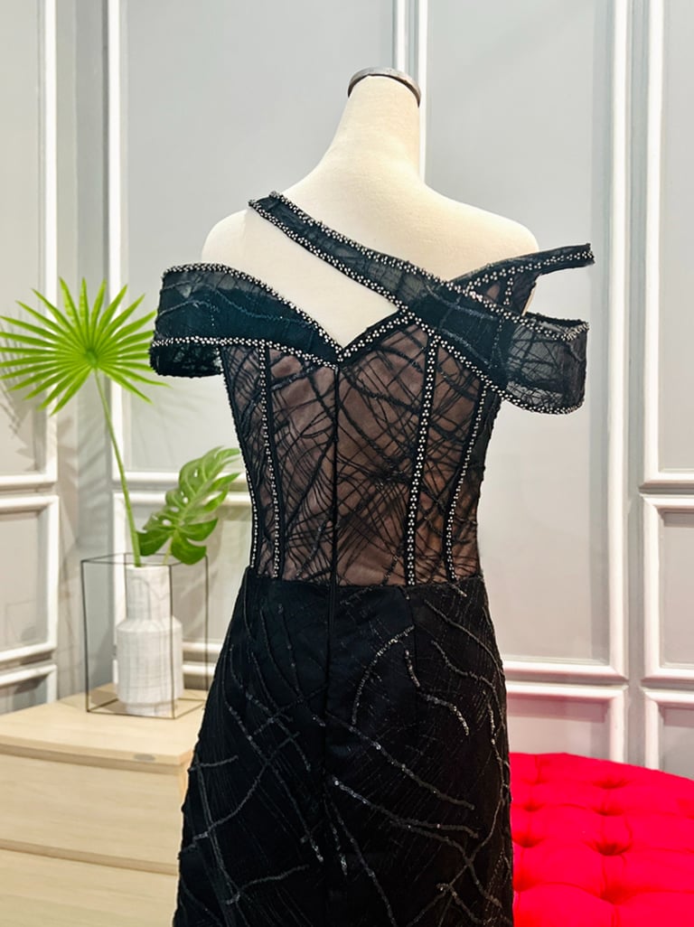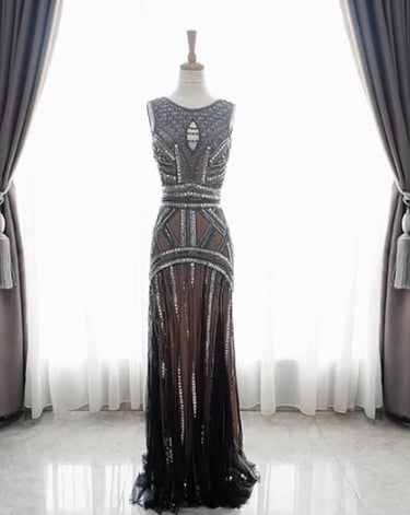 black and nude evening gown is drenched in contemporary sequins and intricate beadwork, sculpting light with every step. A symphony of contrast and texture, it’s designed to command attention from every angle.