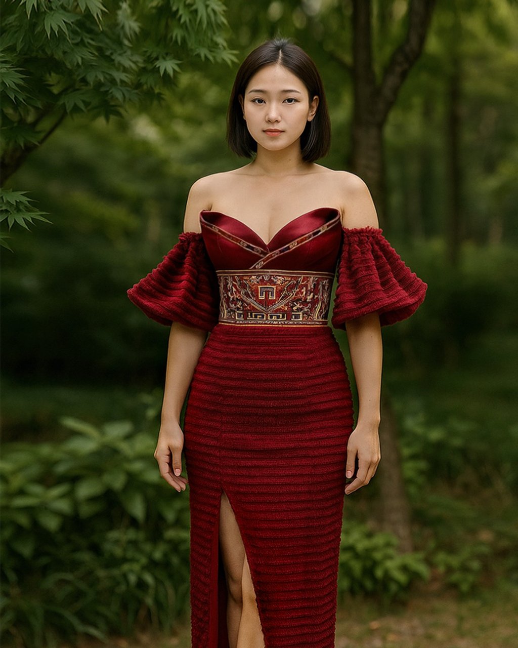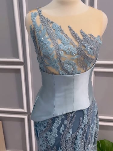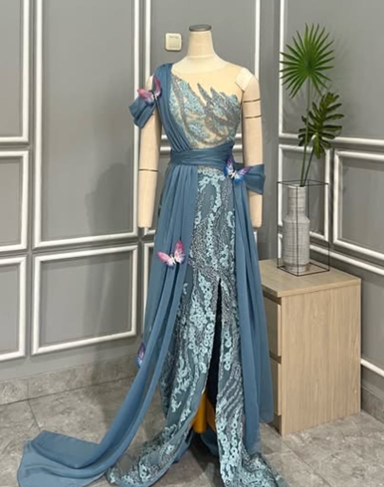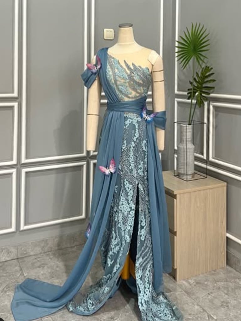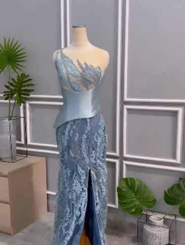 Inspired by the rhythm of water, this aqua blue gown flows with lace that mimics gentle waves in motion. A tasteful slit adds fluid movement, while the structured obi belt cinches the waist with elegant contrast. Serene yet strong