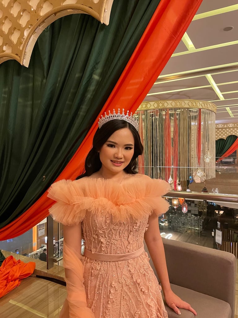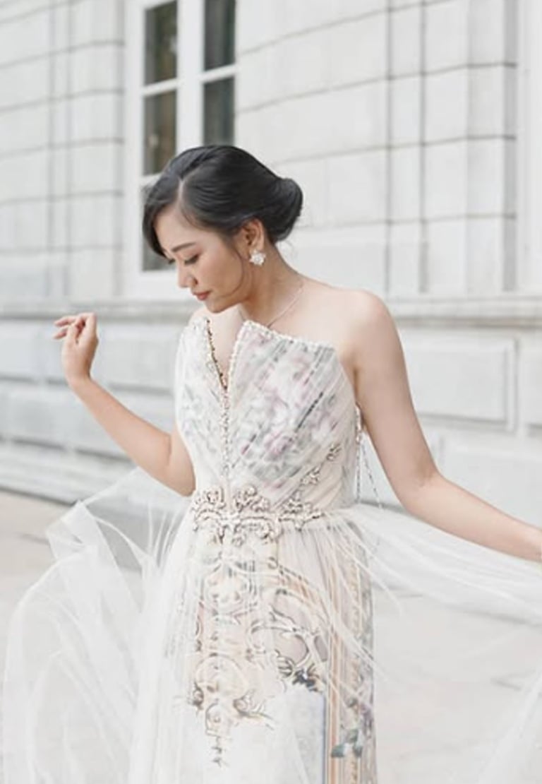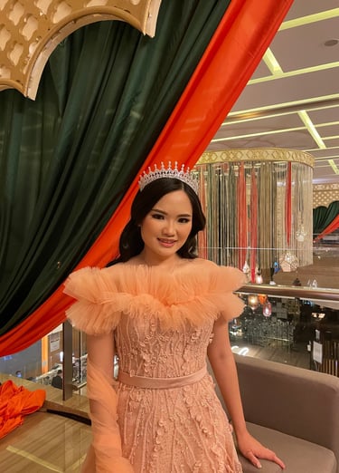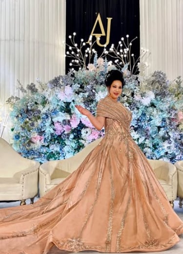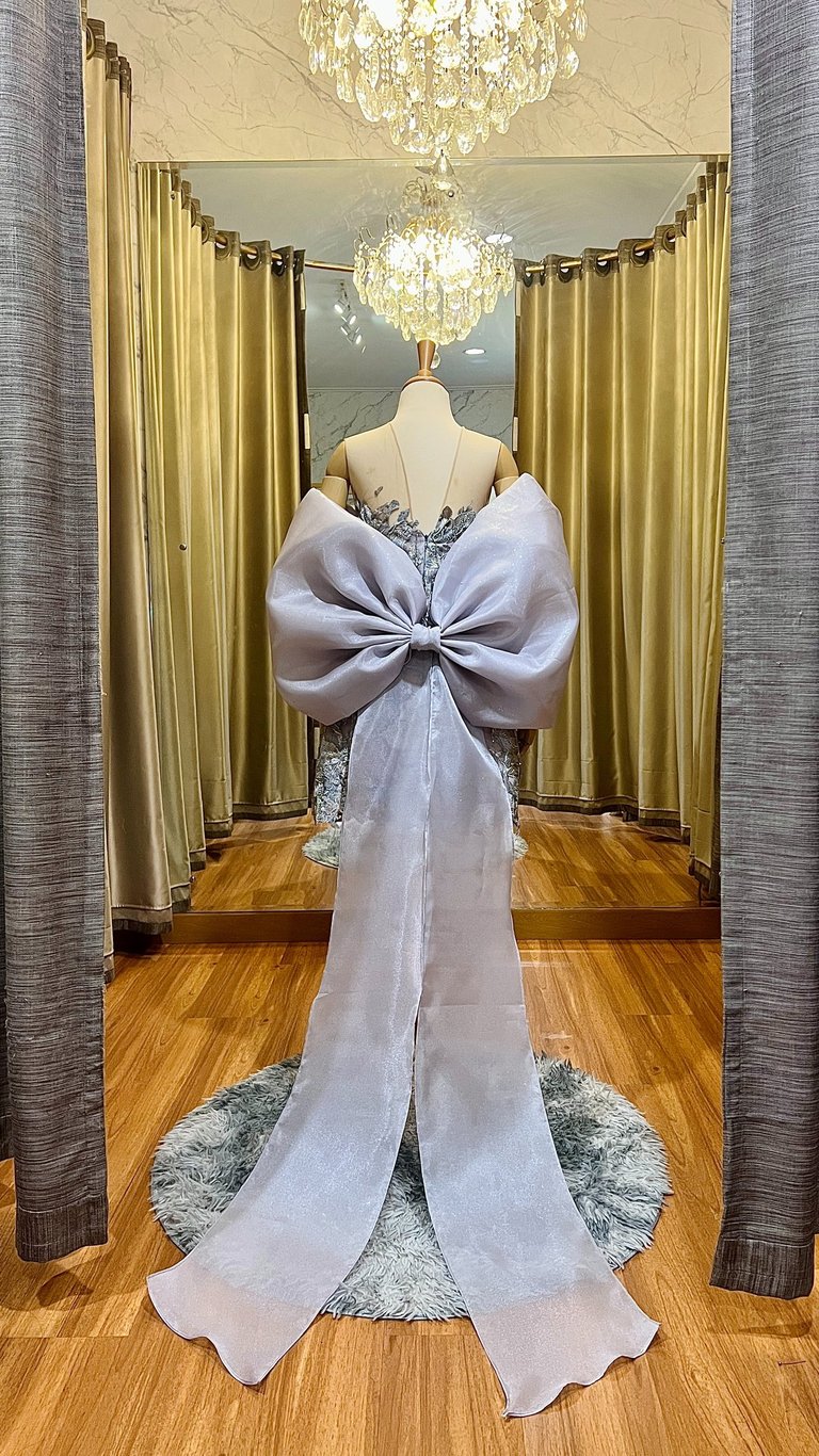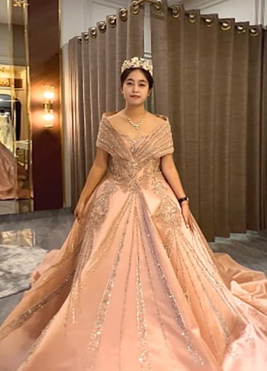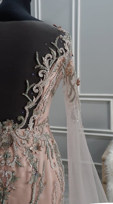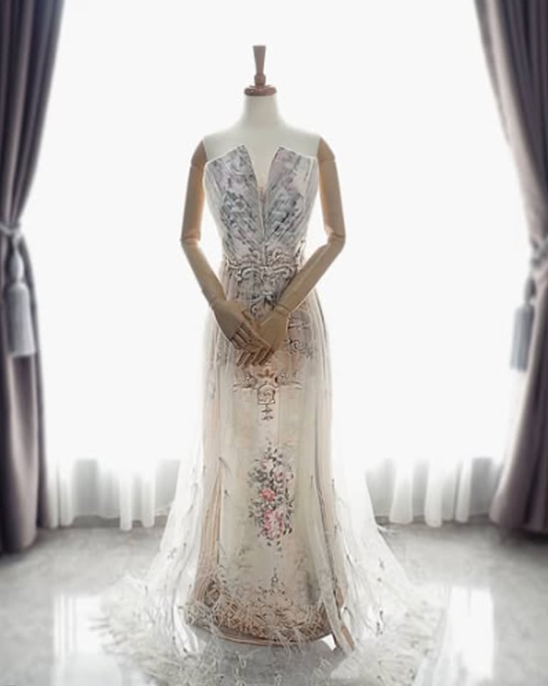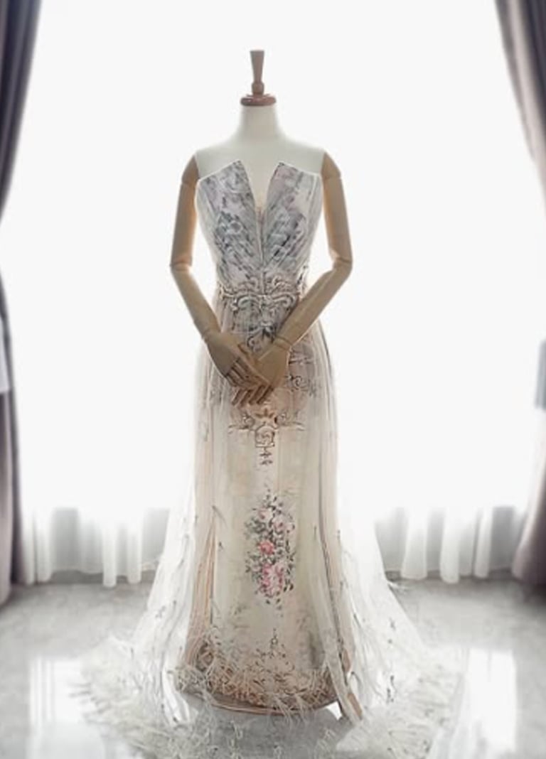 A celebration of serenity and prosperity. Its blush base, intricately detailed, is veiled by an ethereal overlay adorned with vibrant hand-embroidered koi fish and lotus blossoms, evoking the tranquil beauty of a water garden. A grand back bow adds a touch of elegance, while the twin train panels, featuring serene blue water elements and playful tassels, ensure a breathtaking departure. It's a garment designed for moments of grace and new beginnings.
