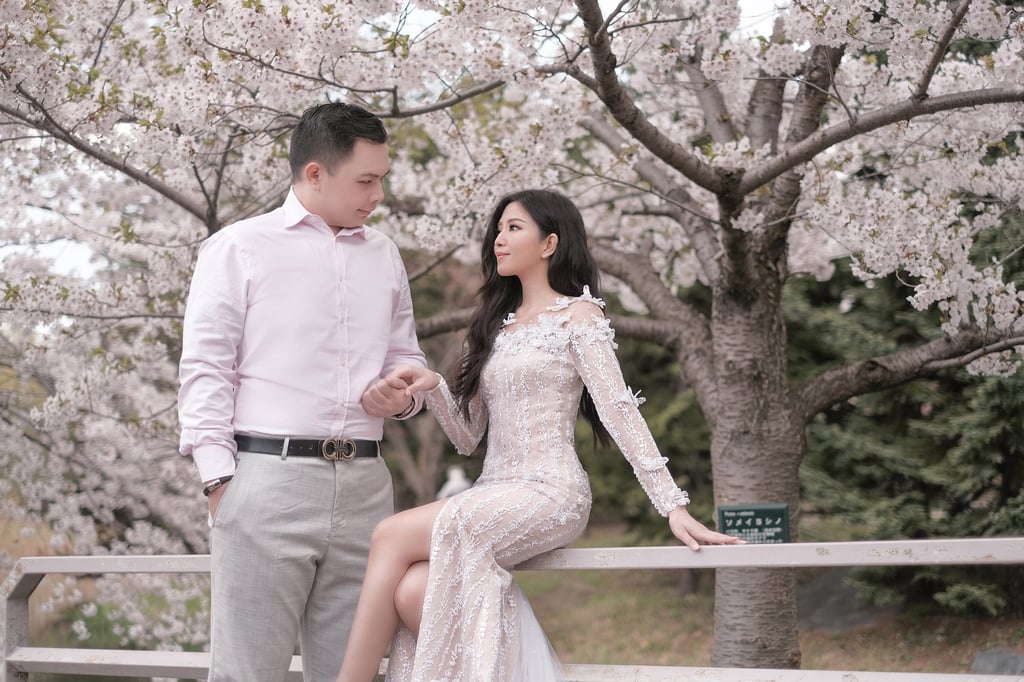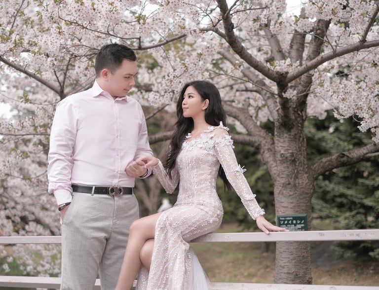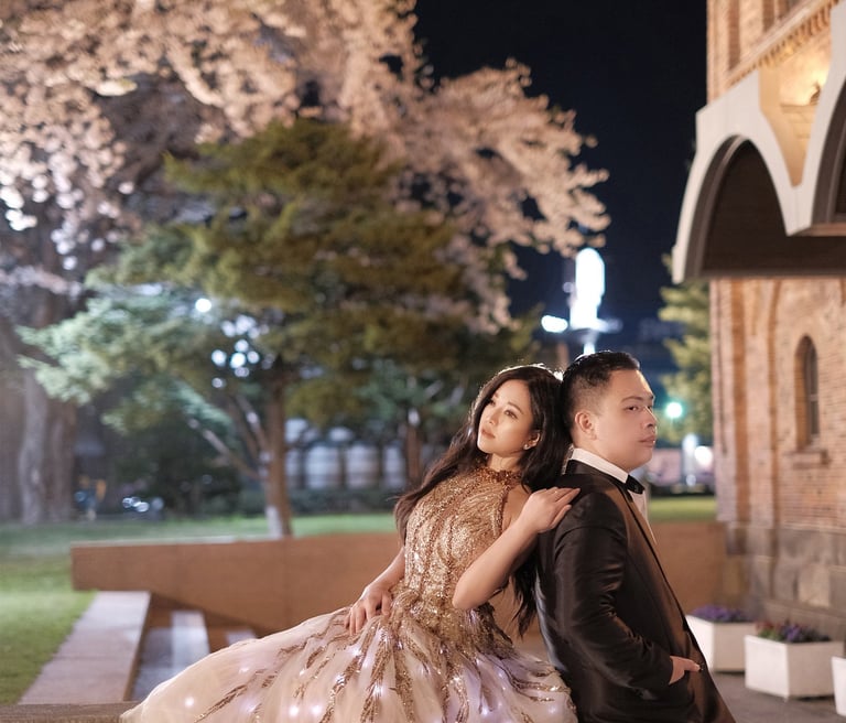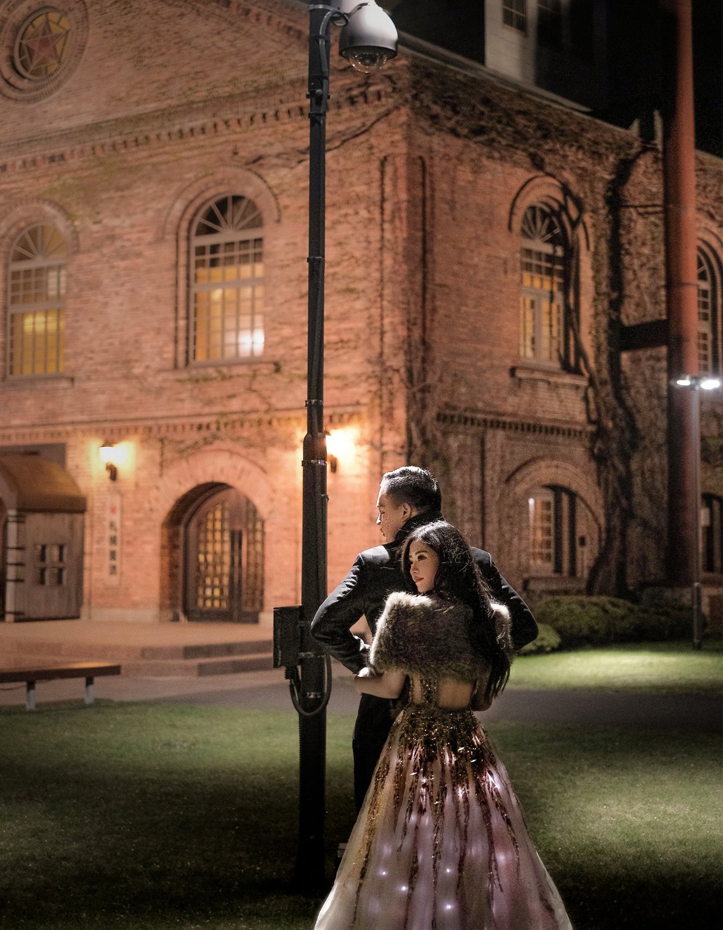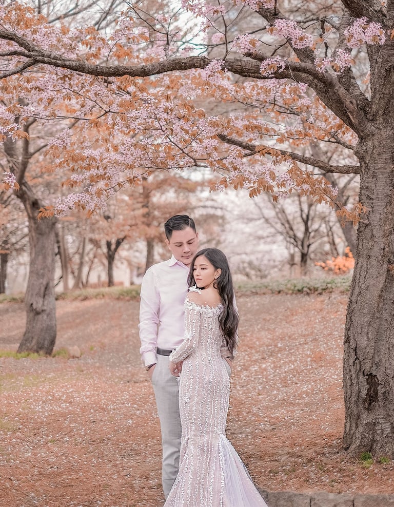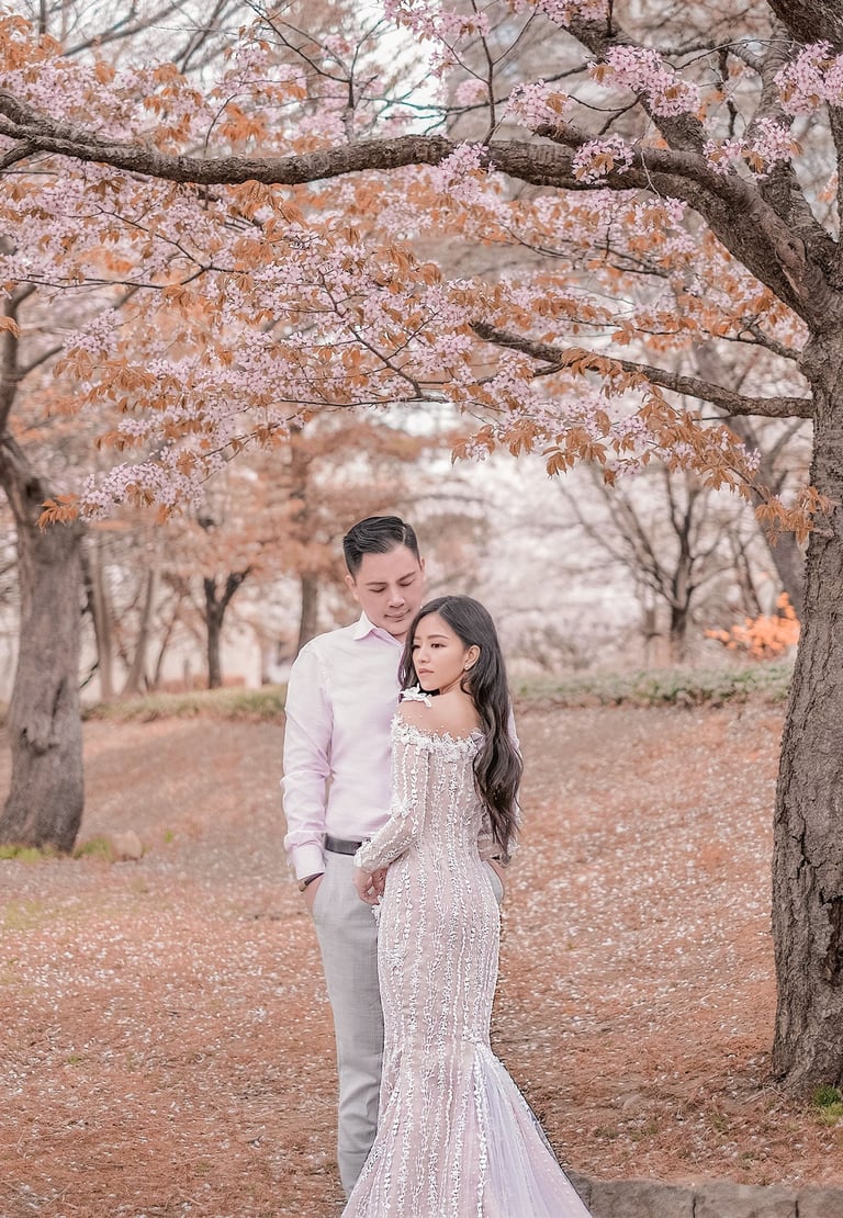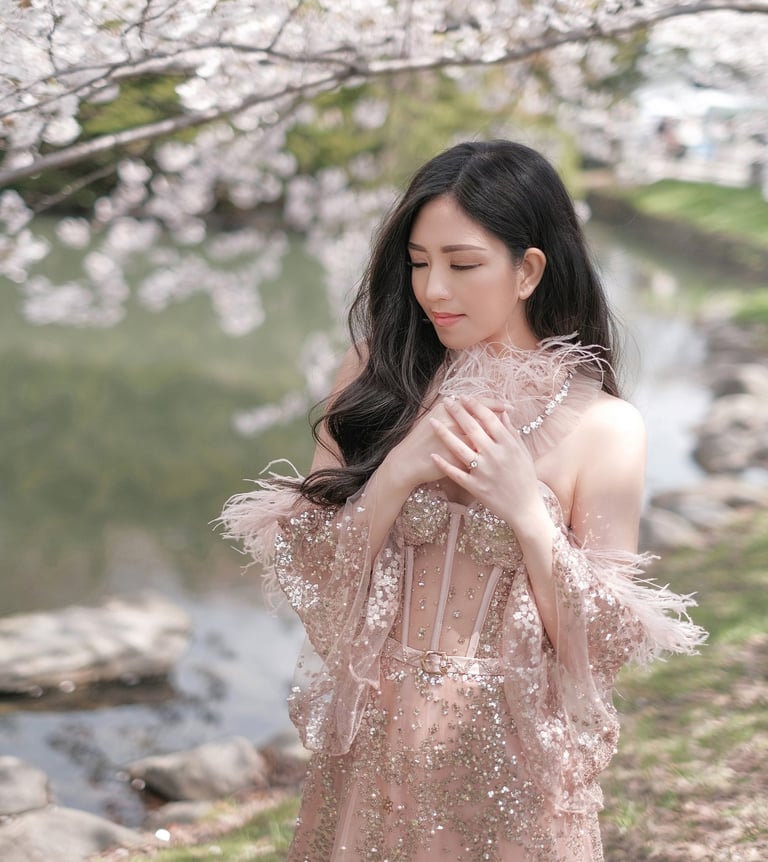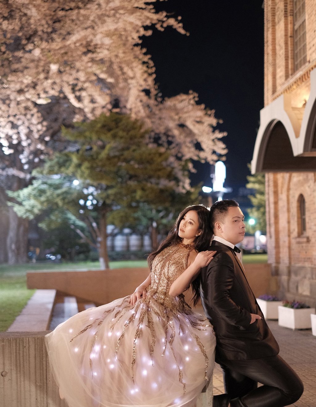 A celebration of serenity and prosperity. Its blush base, intricately detailed, is veiled by an ethereal overlay adorned with vibrant hand-embroidered koi fish and lotus blossoms, evoking the tranquil beauty of a water garden. A grand back bow adds a touch of elegance, while the twin train panels, featuring serene blue water elements and playful tassels, ensure a breathtaking departure. It's a garment designed for moments of grace and new beginnings.