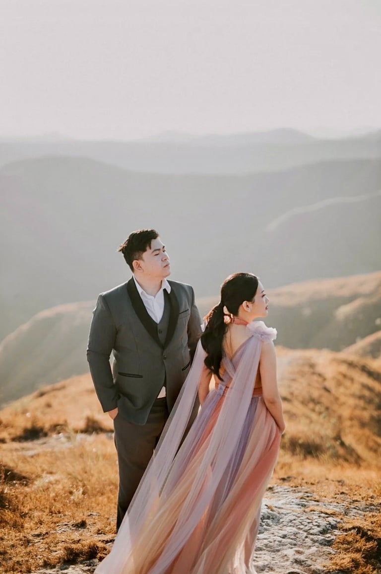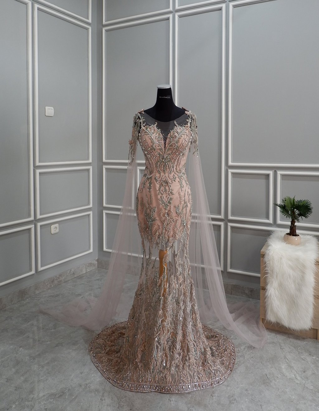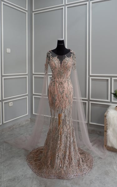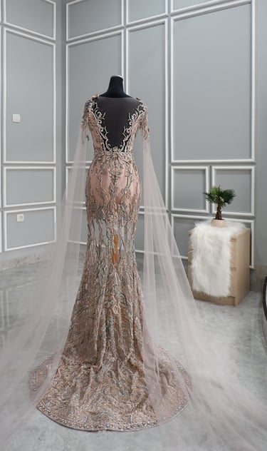 Glowing from peach to rosegold, this enchanting ballgown captures the soft light of a sunset sky. The off-shoulder cape drapes like a gentle breeze, adding a touch of ethereal grace to its regal silhouette. A dream woven in warmth and elegance