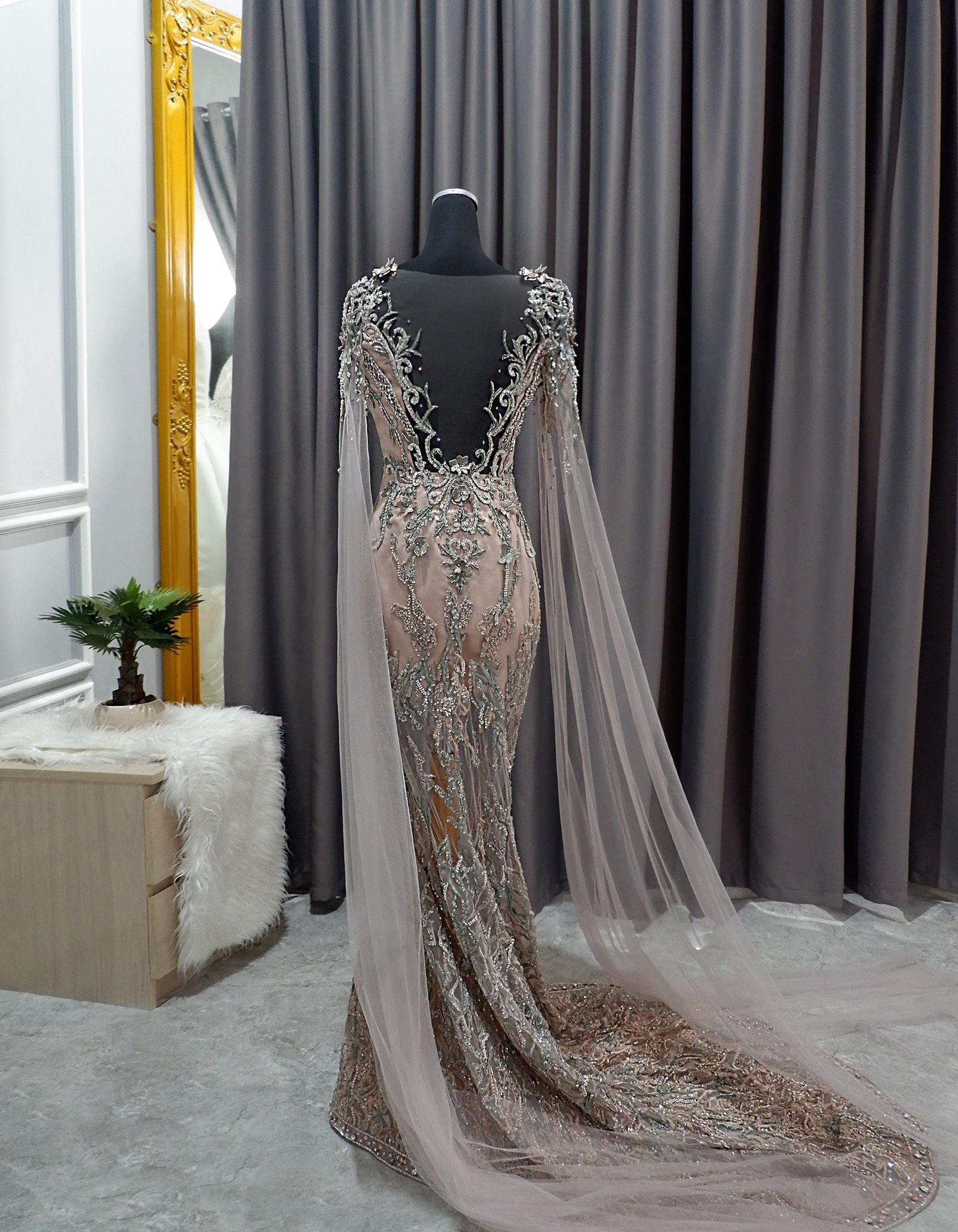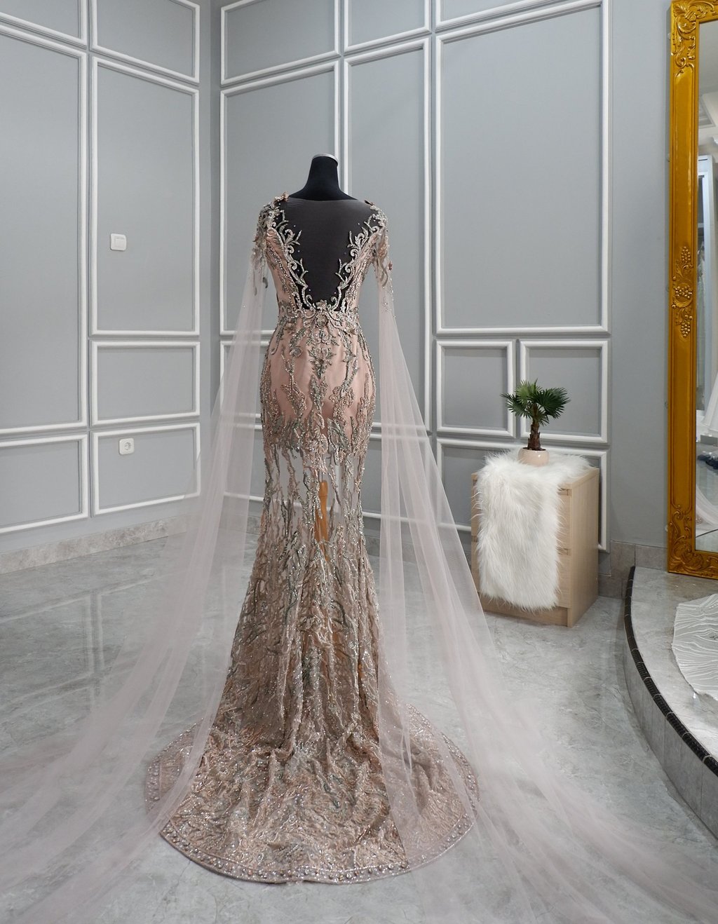 Golden Monarch: Champagne Beaded Mermaid Gown with Royal Cape