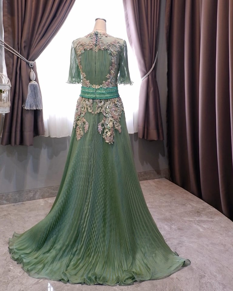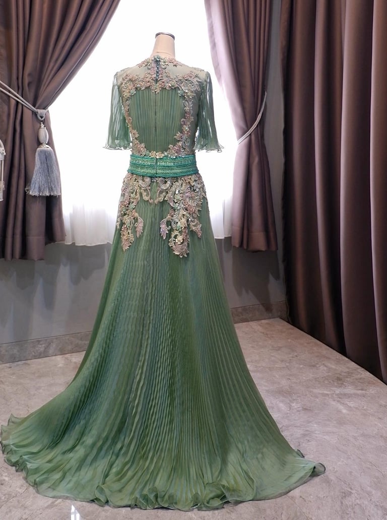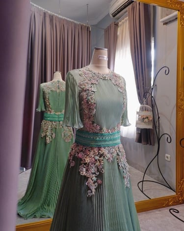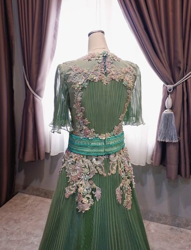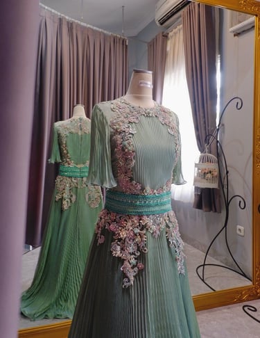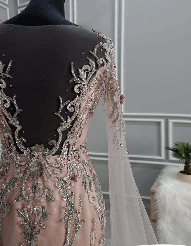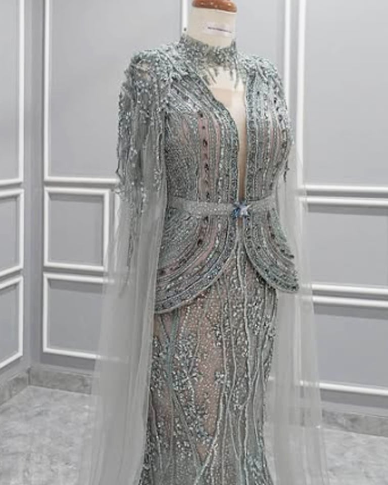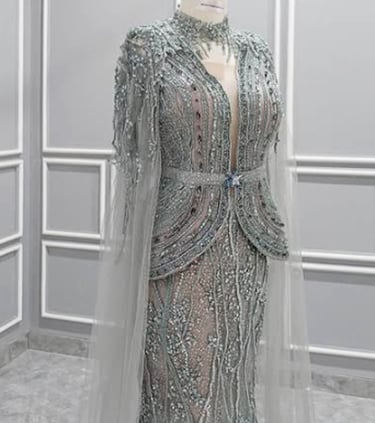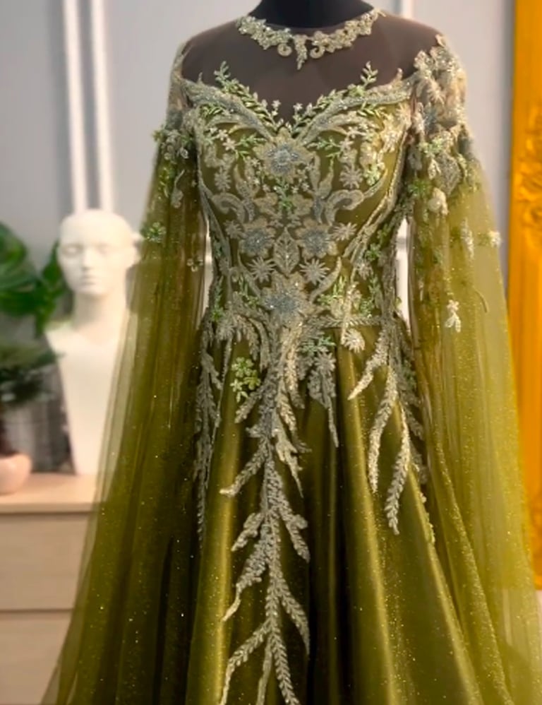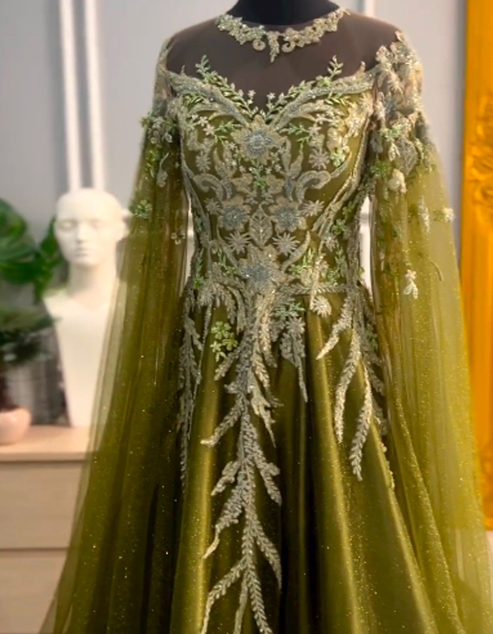 sage green dress with intricate beadwork, exuding grace in every detail. Comprising a delicately beaded top, skirt, and a cape, this ensemble embodies timeless sophistication with a modern twist.