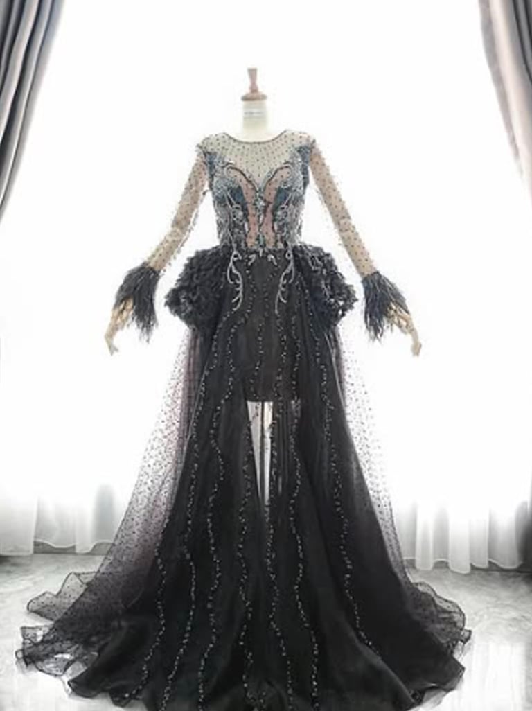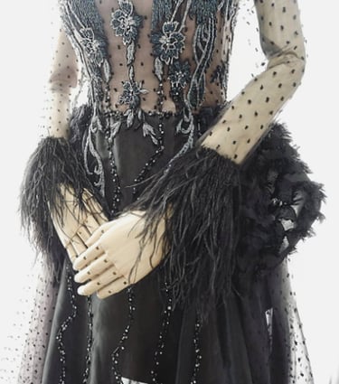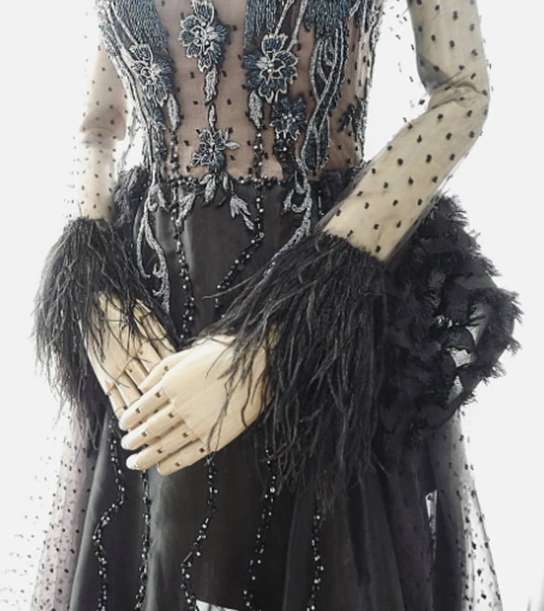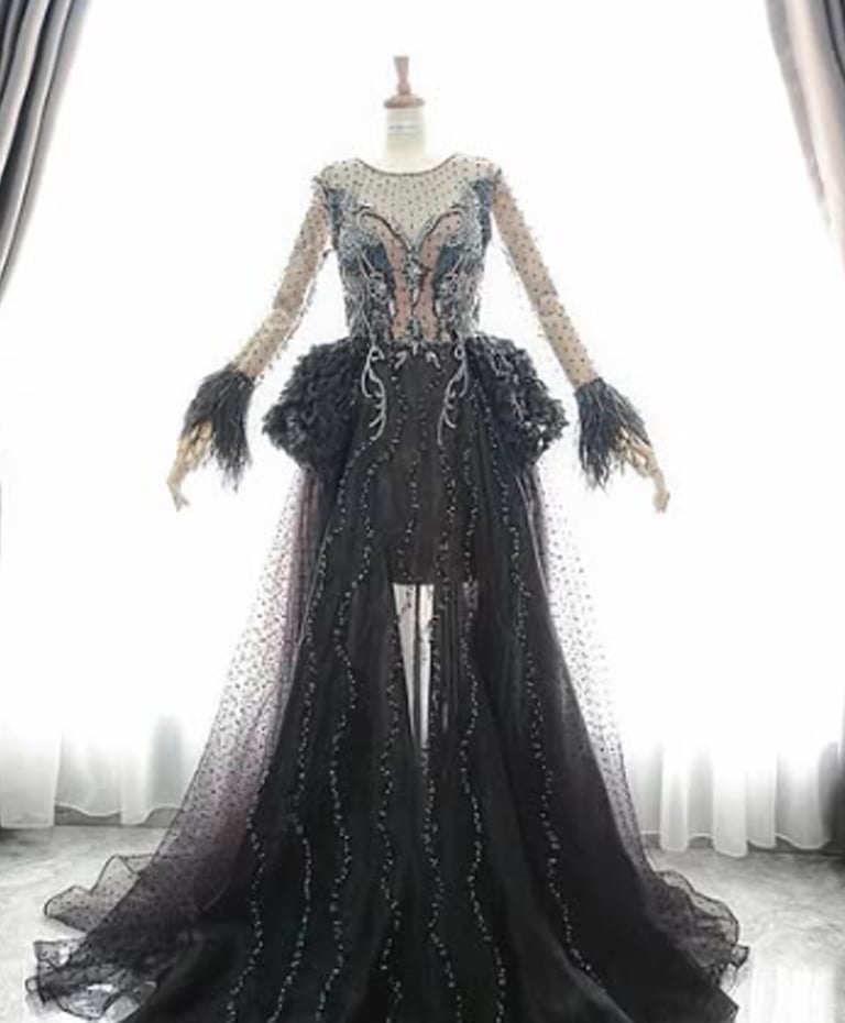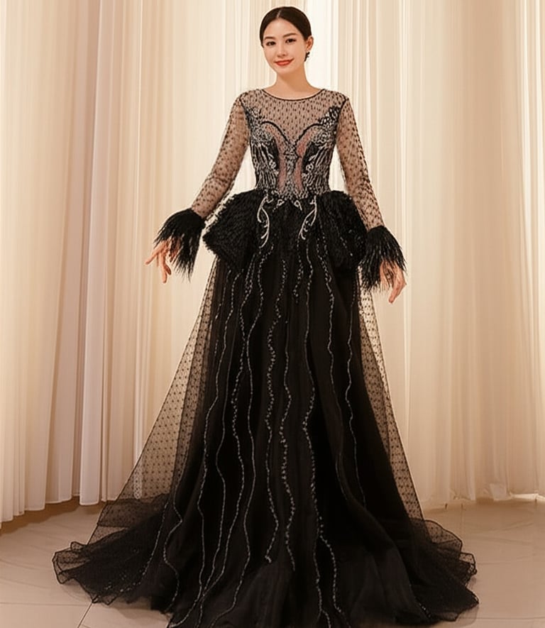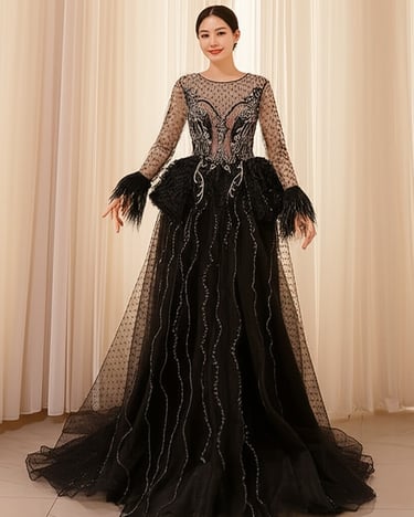 Grace meets enigma in black A-line gown, swan embroidery and feathered detailing evoke the beauty of the Black Swan. With a silhouette that mimics wings in motion, it captures the art of transformation, poised, powerful, and unapologetically bold.