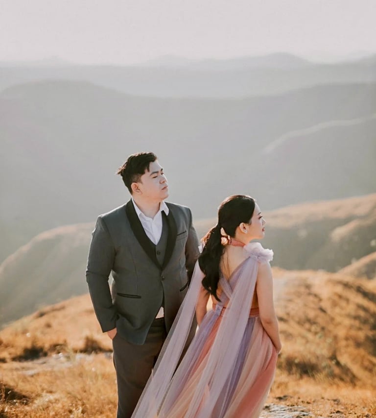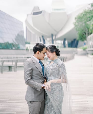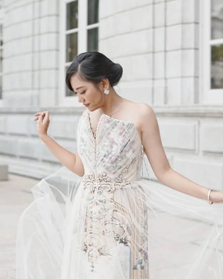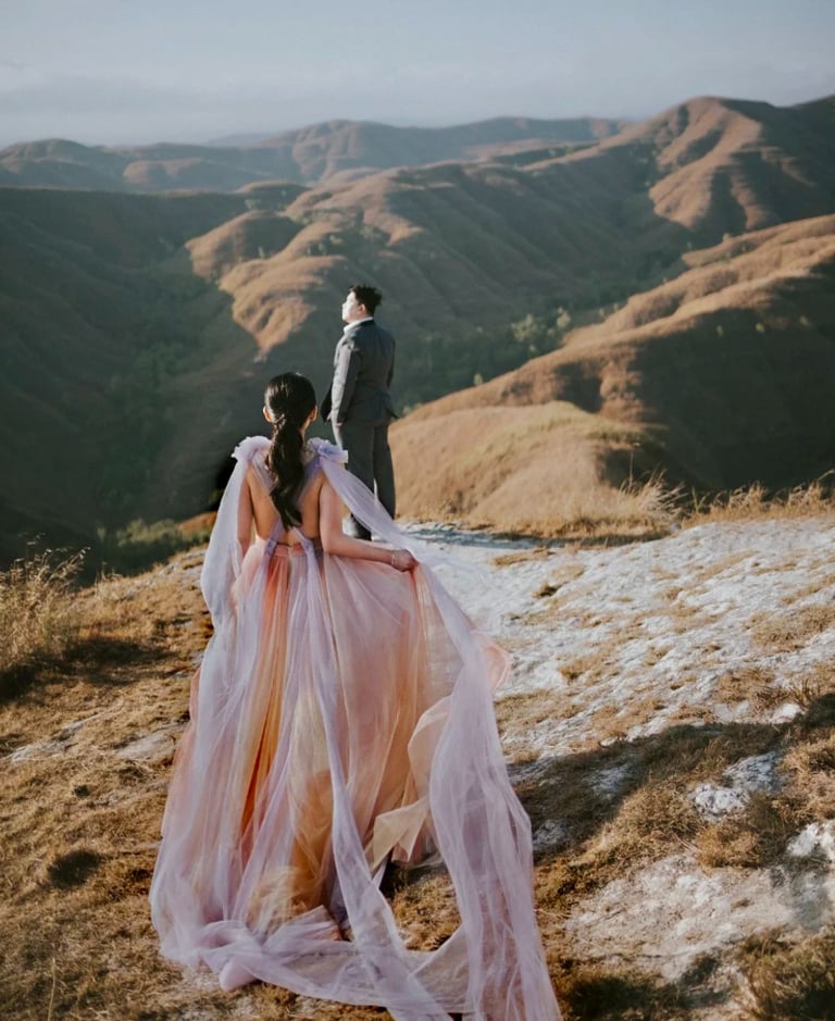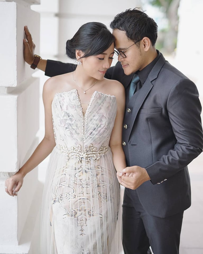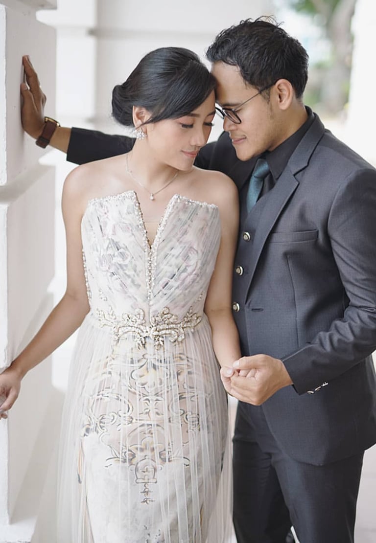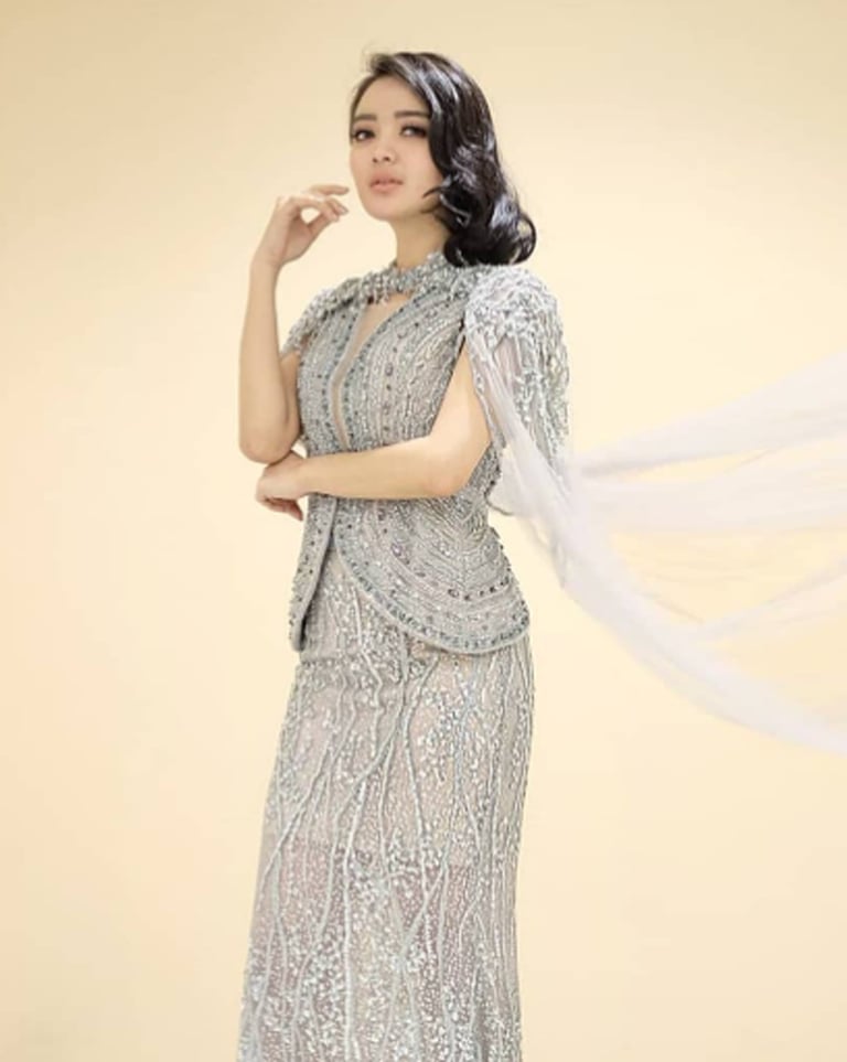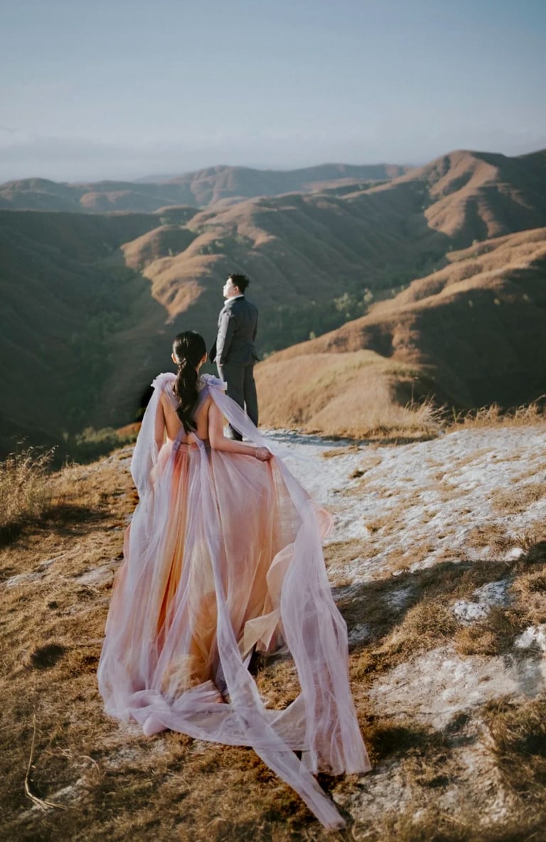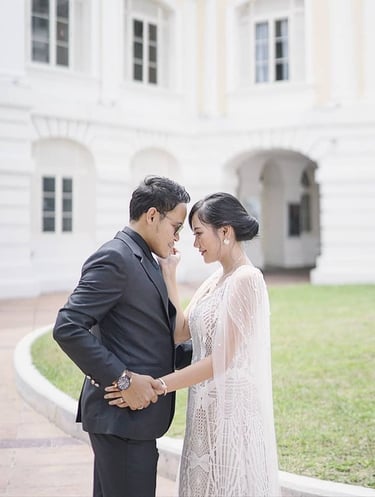 Nude-base A-line gown features intricate geometric lacework and a soft, flowing cape for a touch of ethereal grace. Its versatile elegance makes it perfect for both wedding and prewedding photoshoot.
