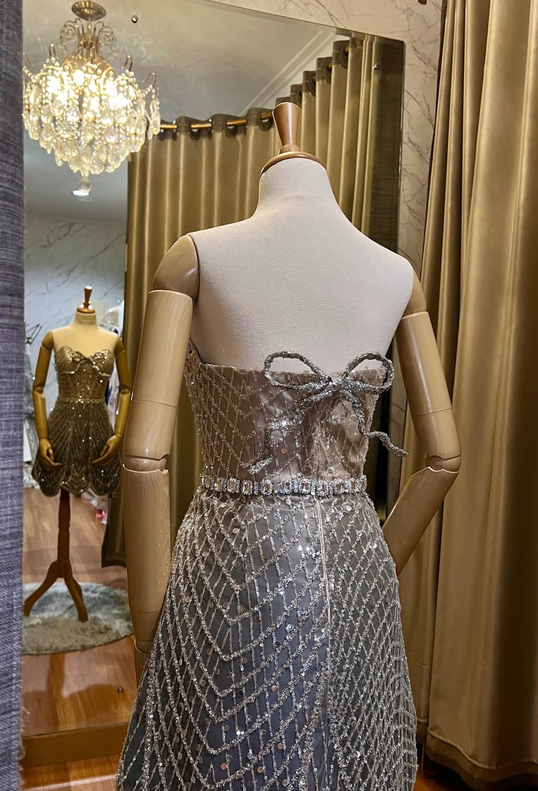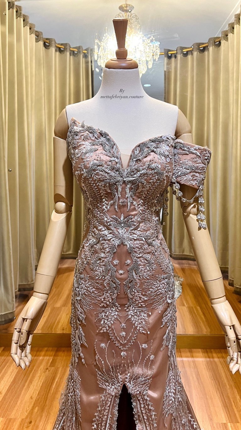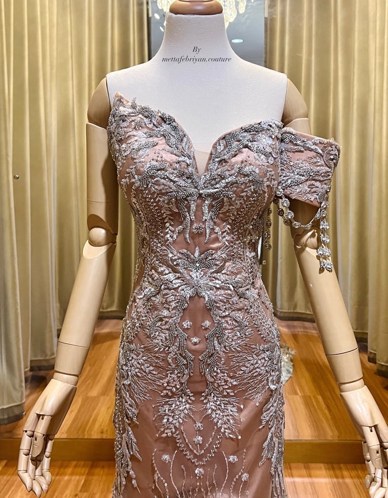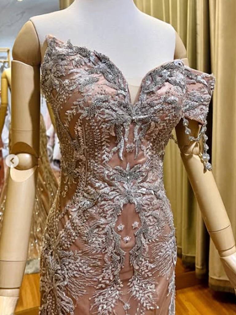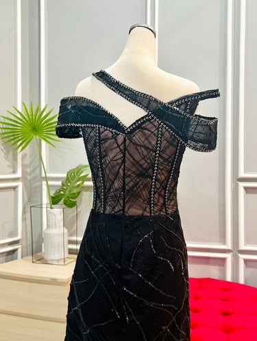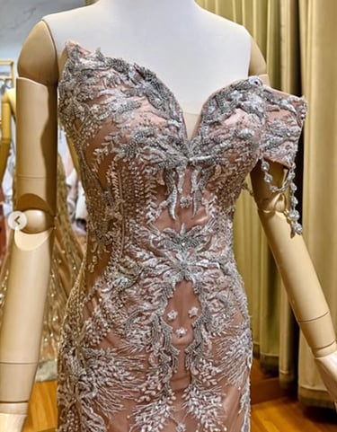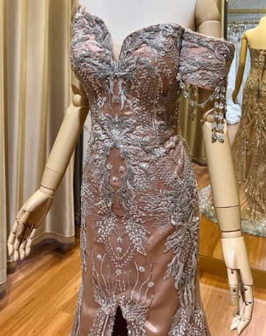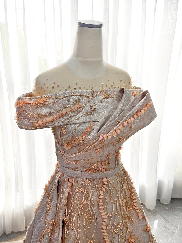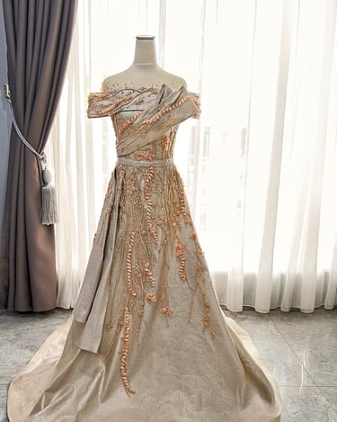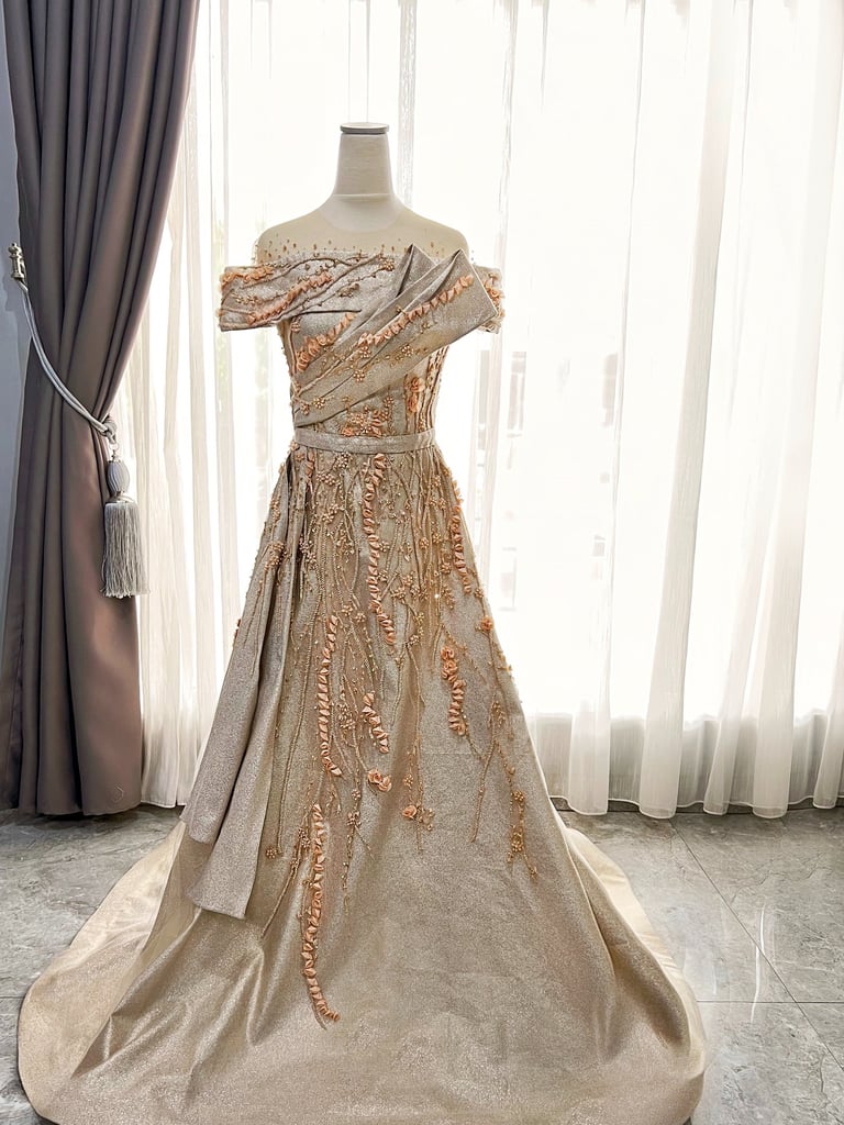 This champagne gold evening gown is where sophistication meets structure. With an off-shoulder mermaid silhouette that contours like a second skin, it sparkles with every step. A transparent, beaded obi belt adds architectural flair