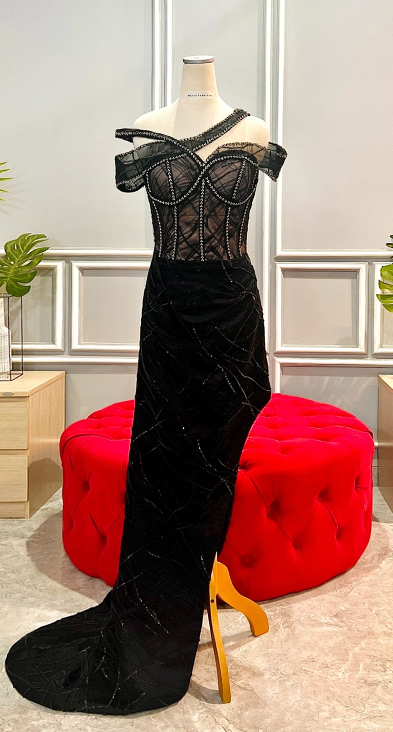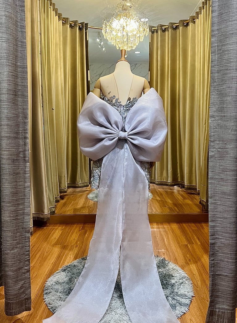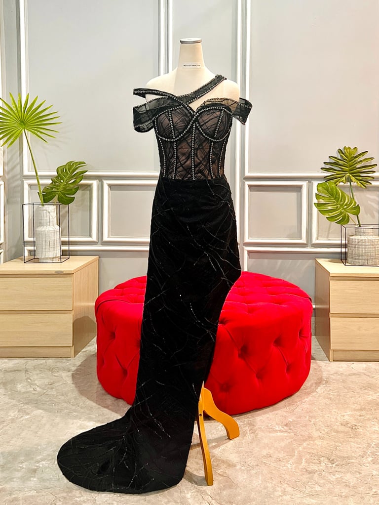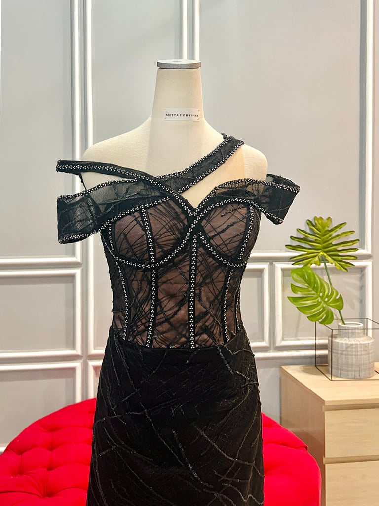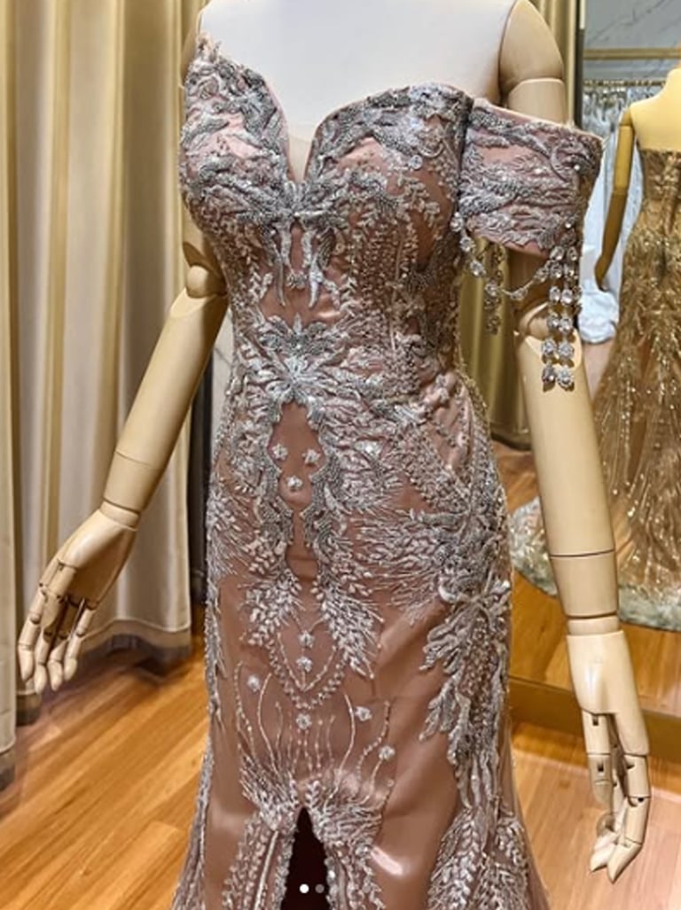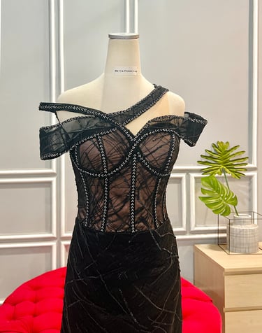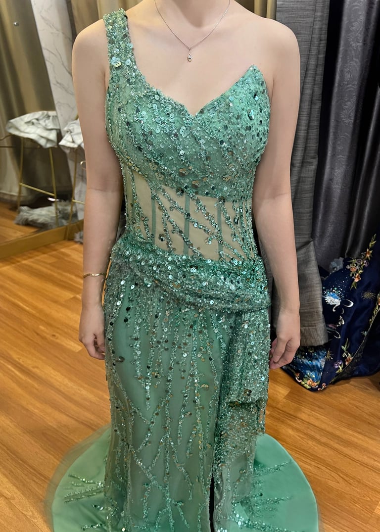 This champagne gold evening gown is where sophistication meets structure. With an off-shoulder mermaid silhouette that contours like a second skin, it sparkles with every step. A transparent, beaded obi belt adds architectural flair