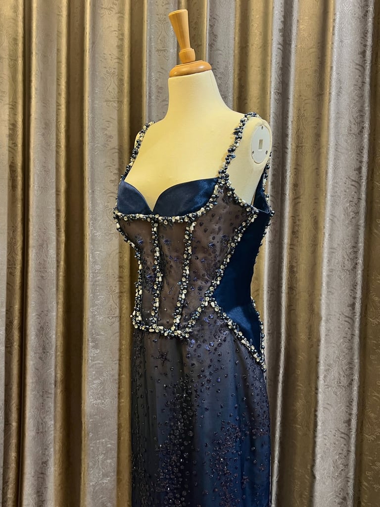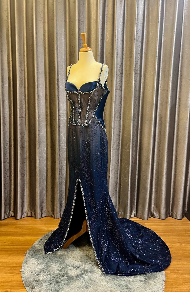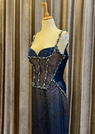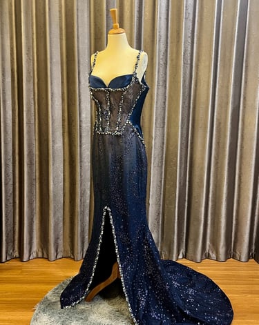 A cosmic masterpiece—this sparkling ombré gown fades from nude to deep navy, mirroring the enchanting transition of twilight. Adorned with shimmering beads that reflect the brilliance of a starlit sky.