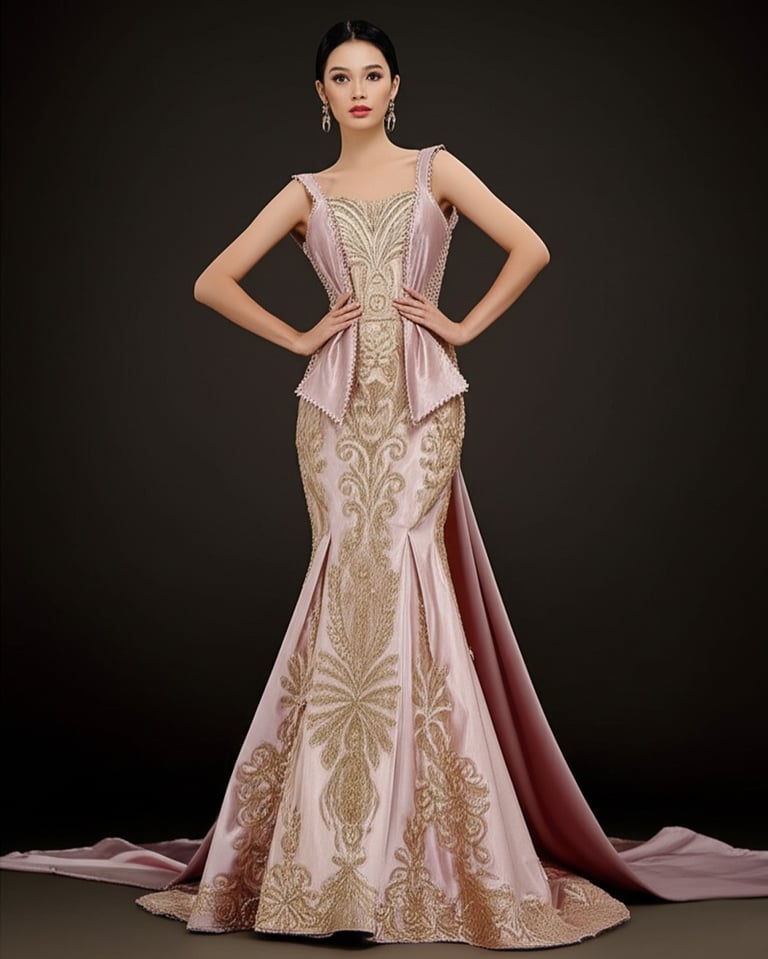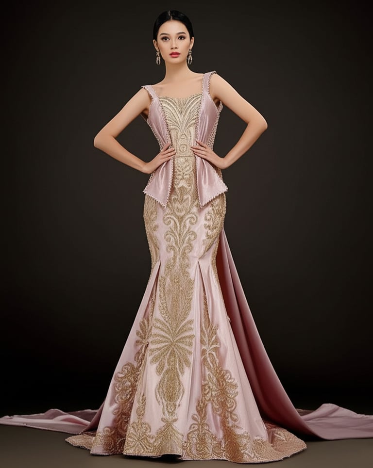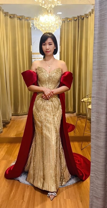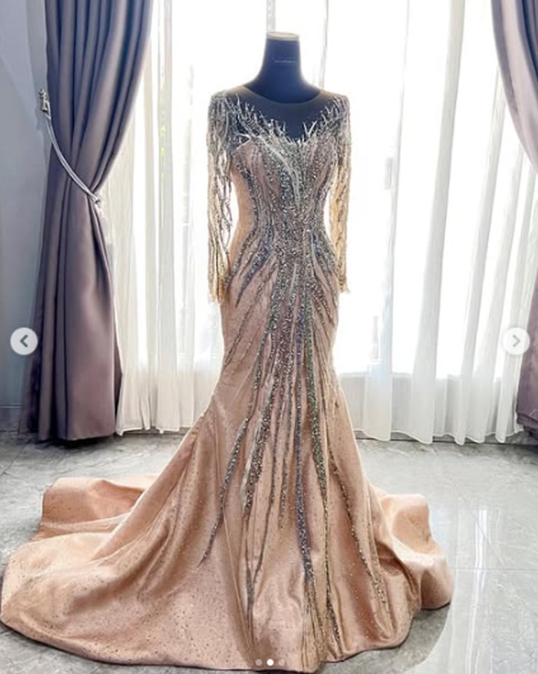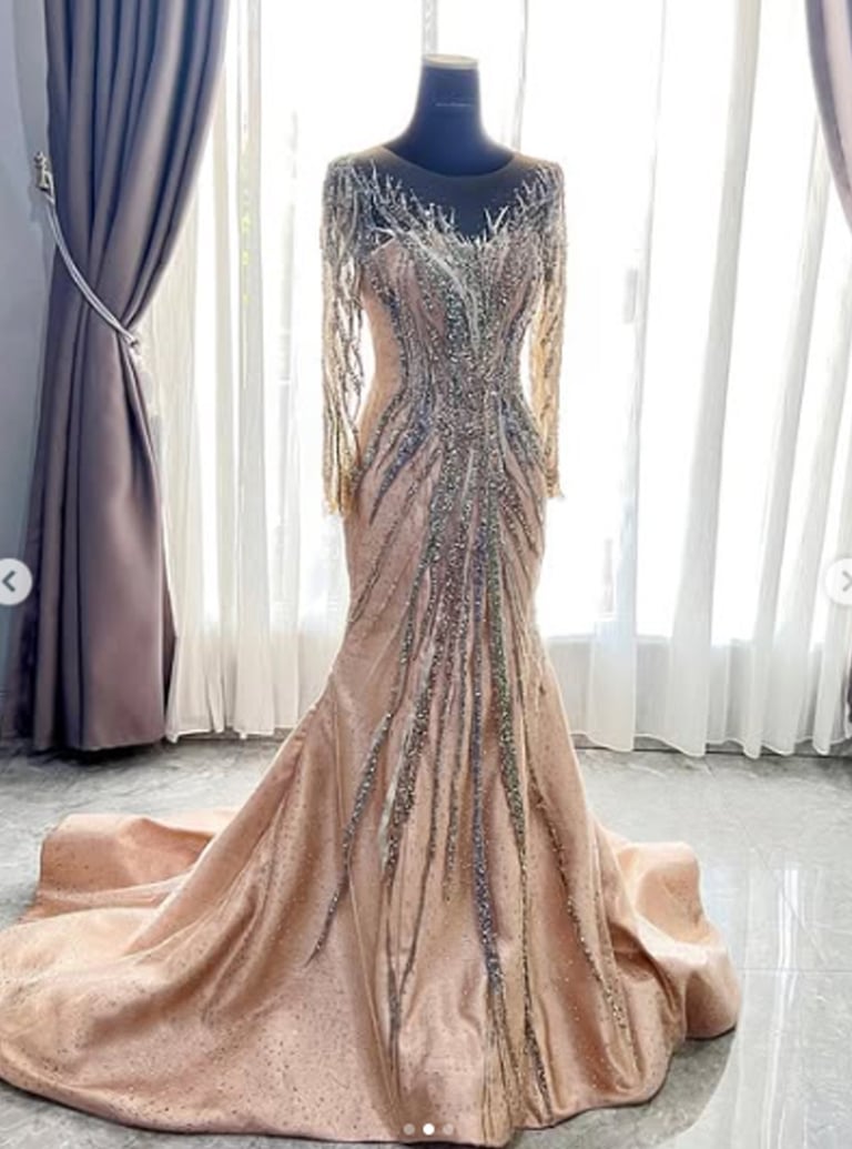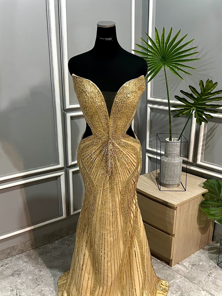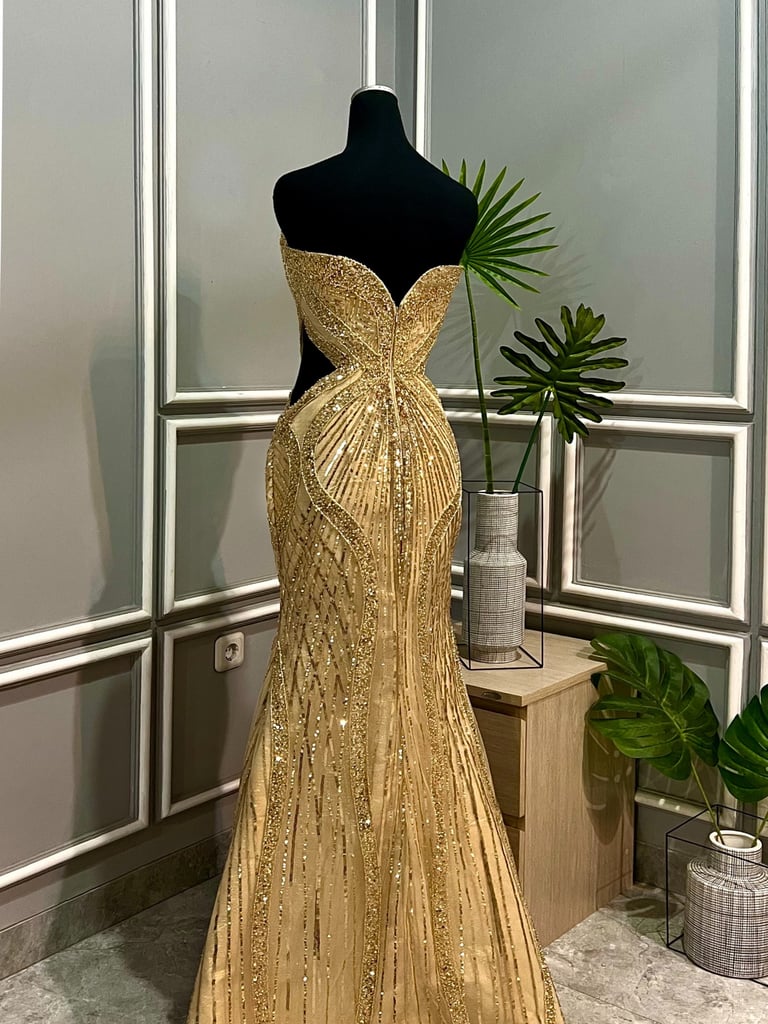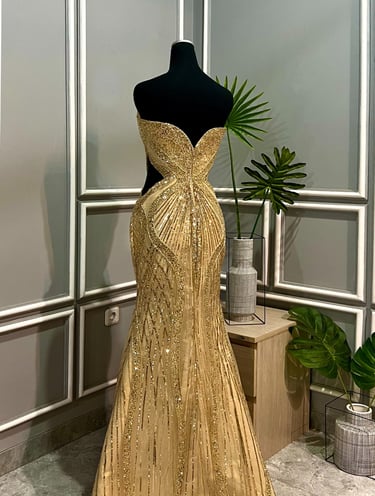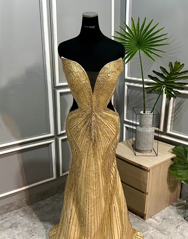 Drenched in champagne gold and shimmering with delicate beads, this mermaid silhouette hugs every curve like liquid light. Designed to dazzle under evening lights, it’s elegance in motion sophisticated, radiant, and unforgettable.