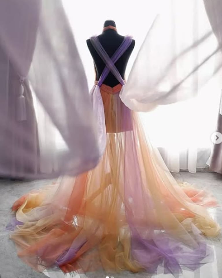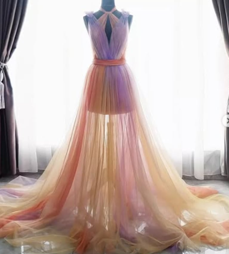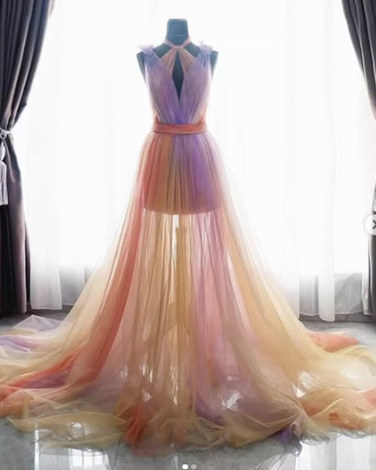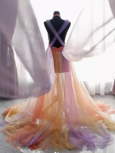 A flutter of light, this sheer ombré tulle gown melts lilac, yellow, and orange into a cotton candy fantasy. Weightless and luminous, it flares with every movement, making it the perfect piece for a photoshoot
