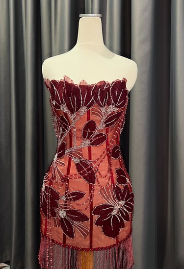 Inspired by sculpted petals of Red Calla Lily, made as convertible silhouette. Detachable petal skirt reveals a hand-beaded mini dress beneath, giving you two looks in one masterpiece. Suitable fot photoshoot, party, and after party.