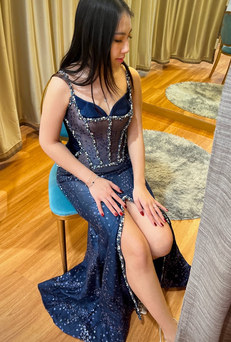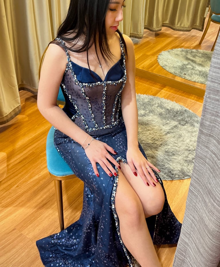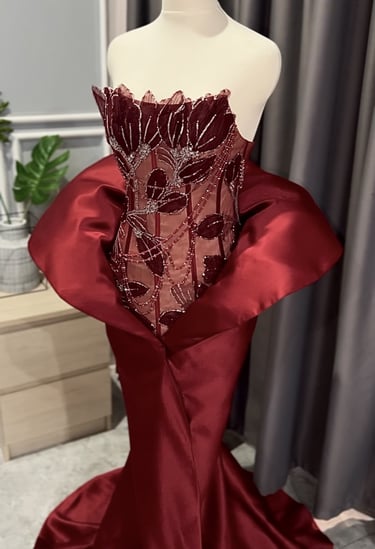 Body-fitted mermaid gown, where elegance meets bold allure. Backless with a shimmering crystal ornament, glistens with intricate Swarovski detailing and full embroidered lace. Transparent knee subtly reveal the legs as sensuality and refinement.
