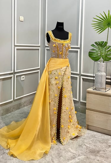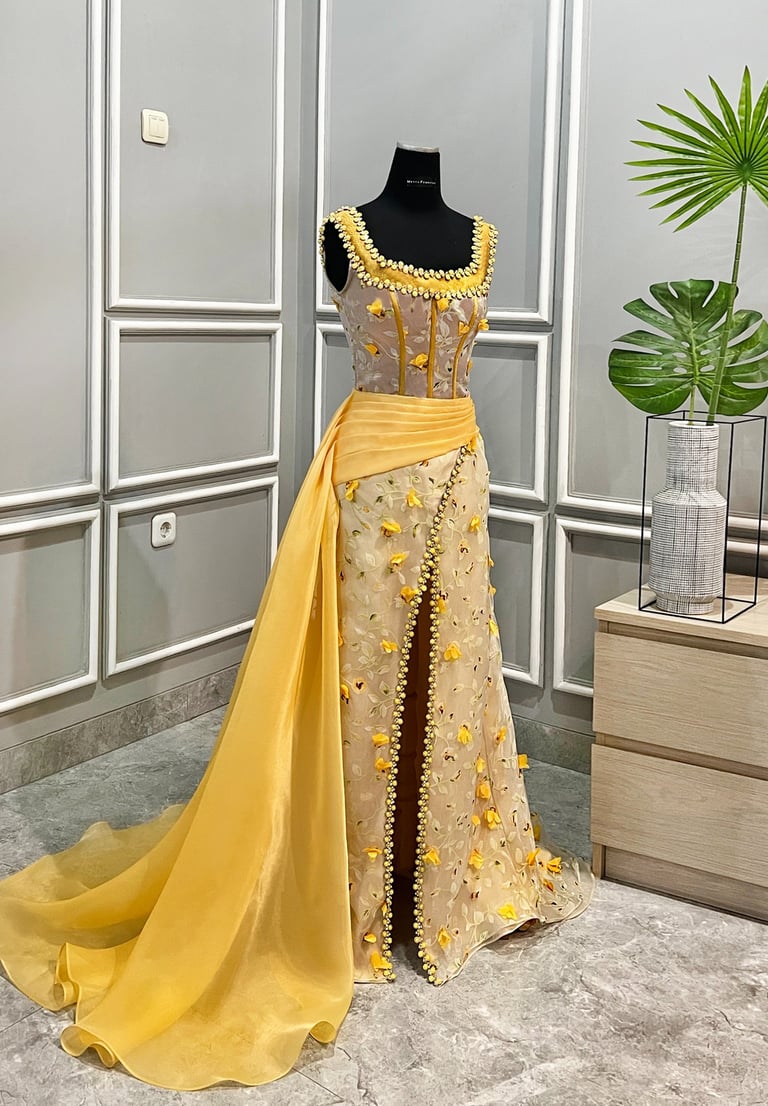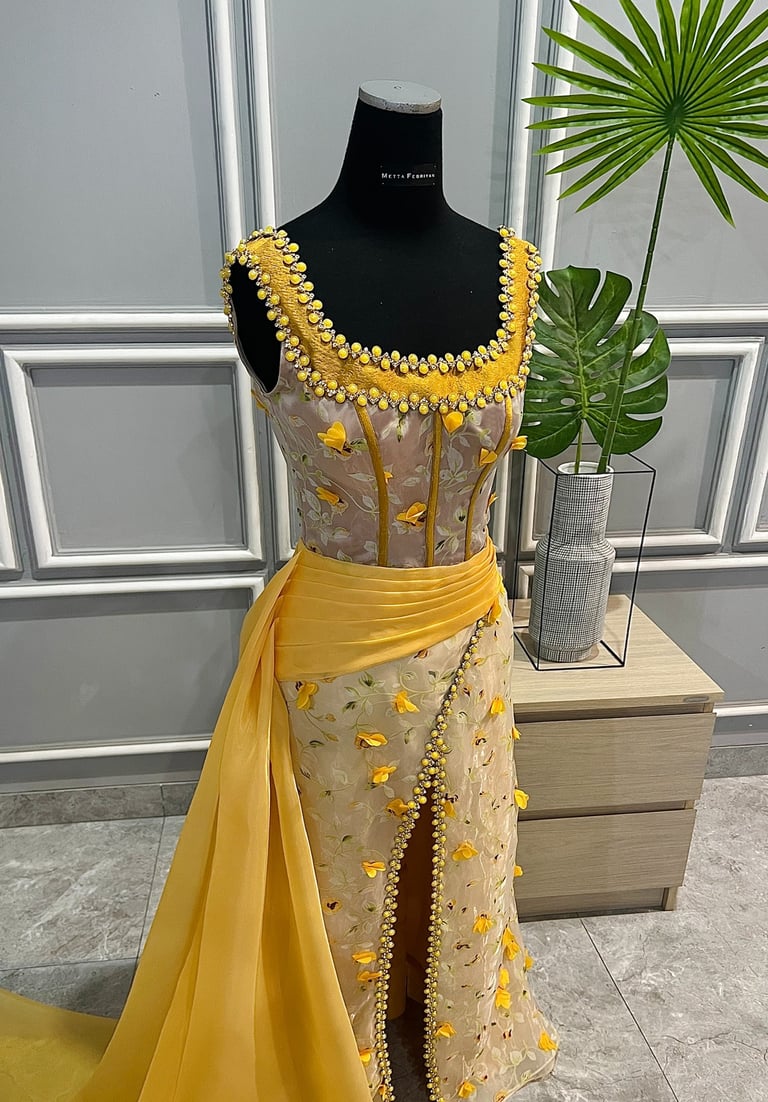Radiates grace with its sheer bodice, intricate 3D floral appliqués, and hand-embellished pearl neckline. Draped in soft yellow hues reminiscent of spring.