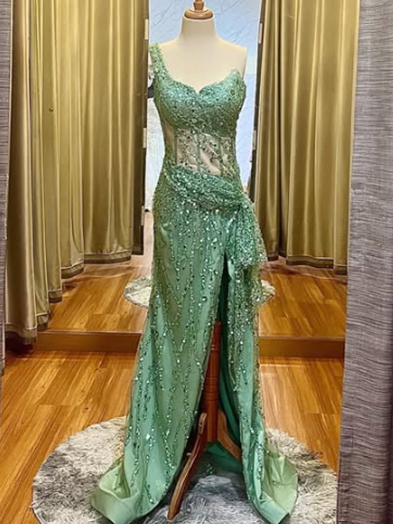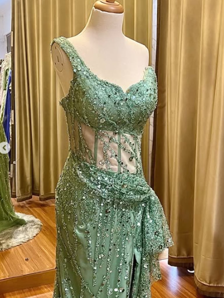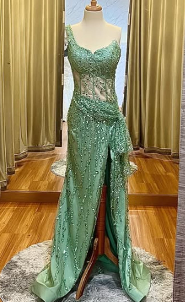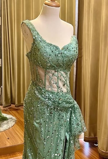 Sage green gown glimmers with intricate beadwork and reveals just the right touch of skin at the waist. The asymmetrical neckline adds sculptural intrigue, while a daring slit brings fluidity and allure.