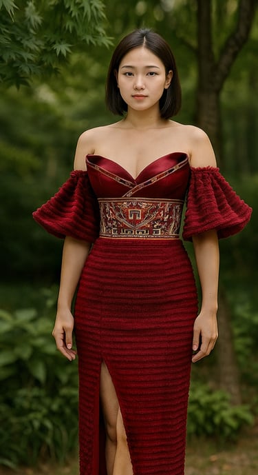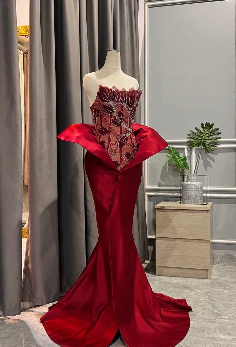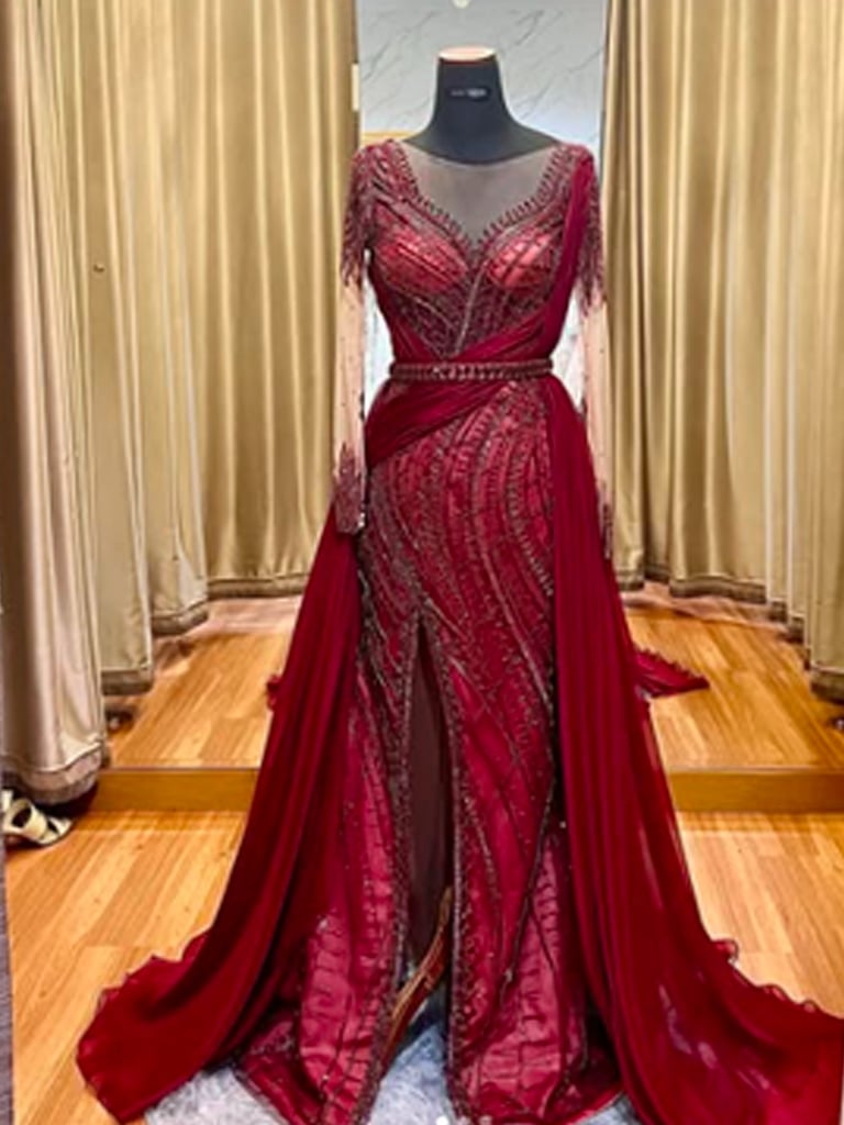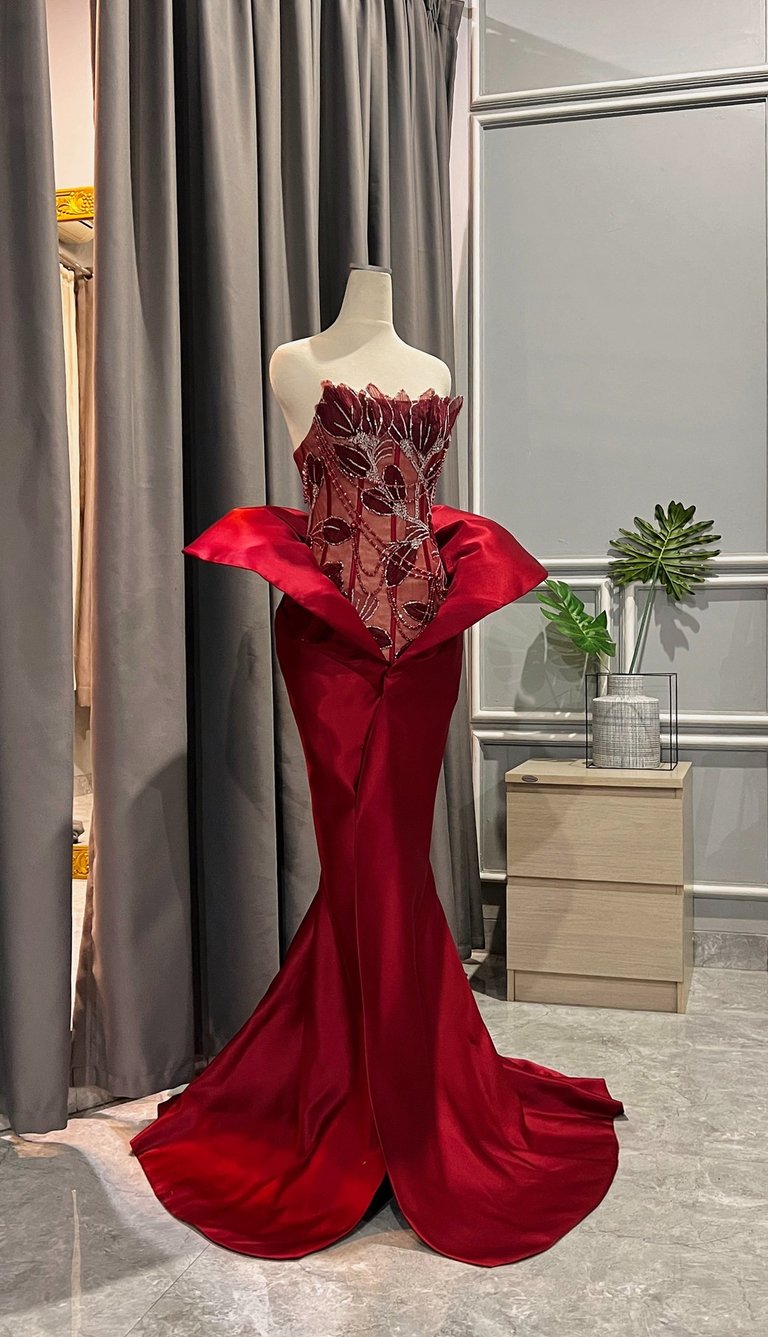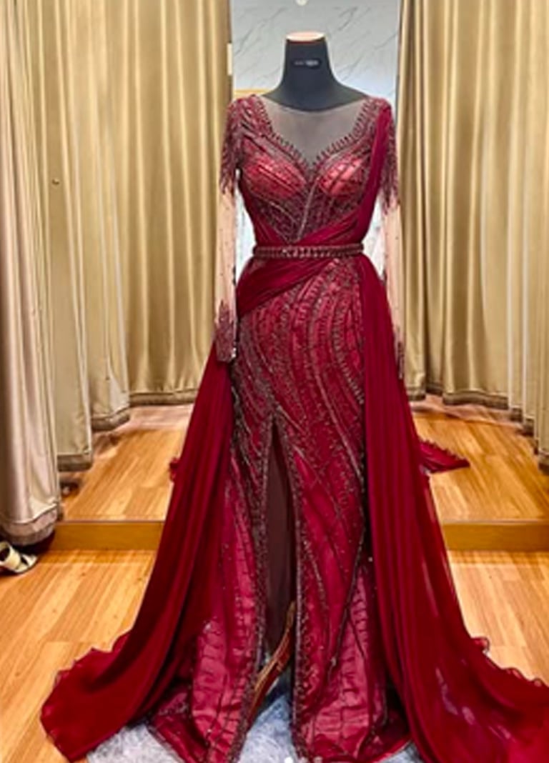 Velvet red gown, modern geometric beaded lace adorned with draped silk chiffon. A bold front slit outlined in intricate beadwork, captivating edge to the rich, textured design, making it a perfect harmony of structure and sensuality.