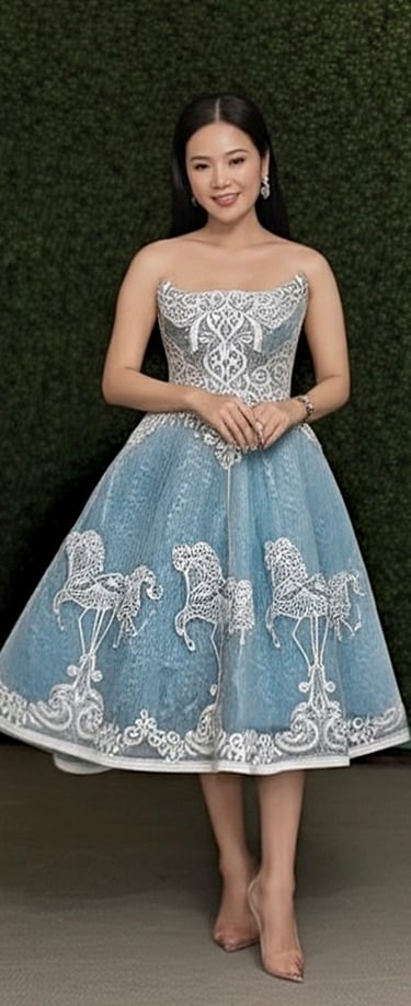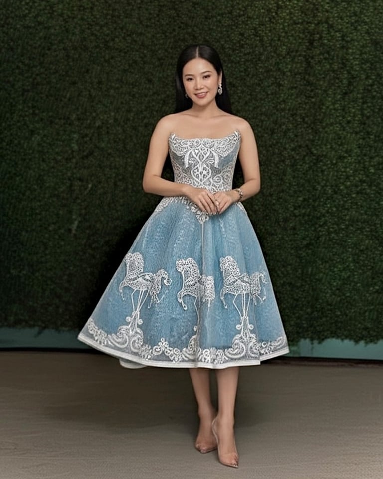 Step into a dreamscape with this mid-length A-line dress featuring a charming merry-go-round motif. The soft dusty blue outer layer dances over a sheer underdress, creating a layered ethereal look.