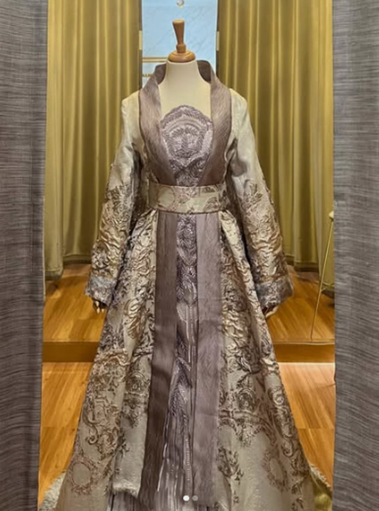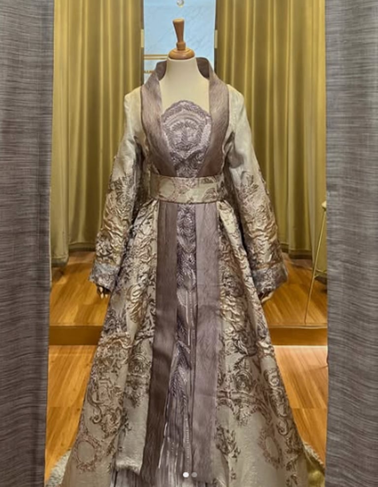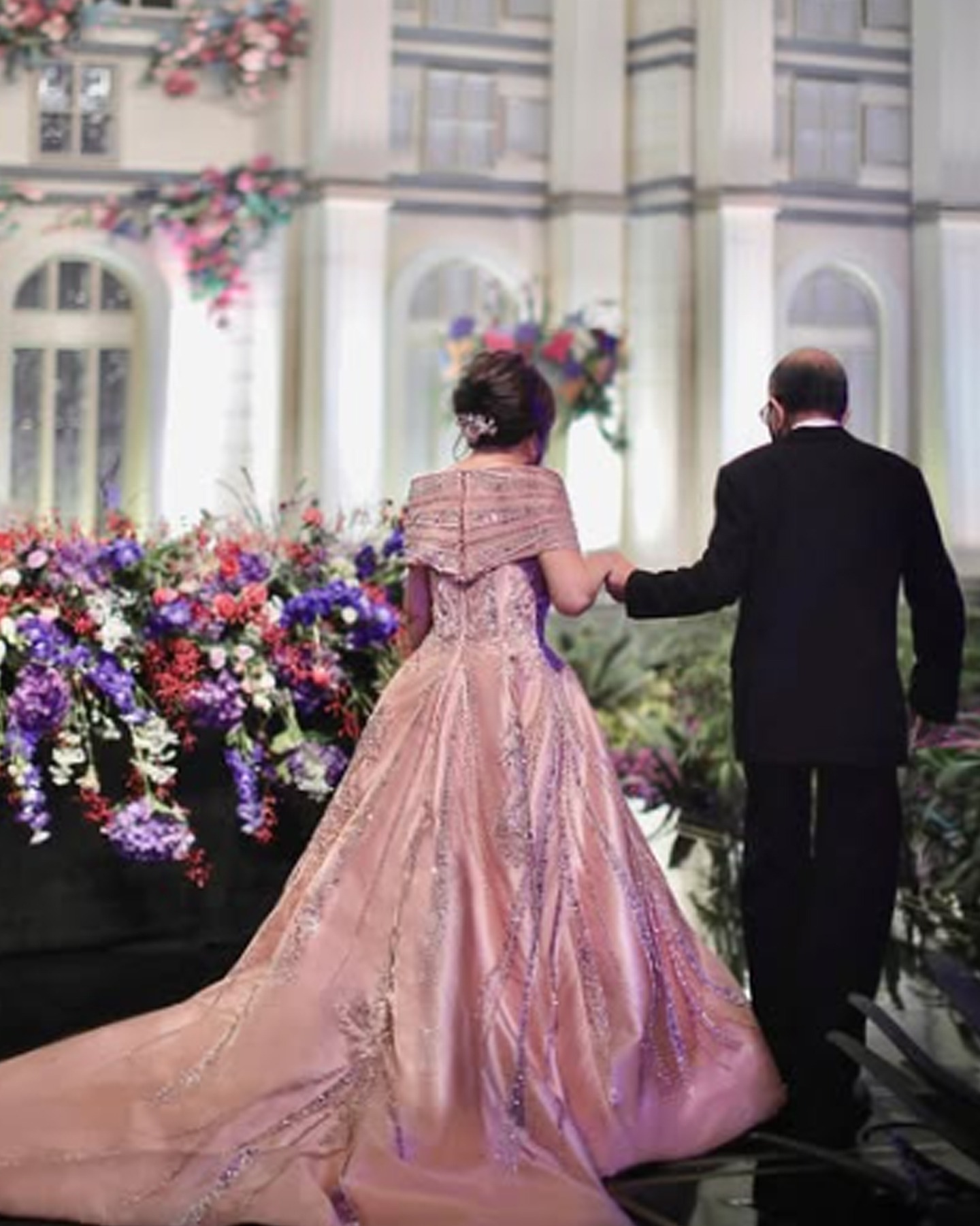 This grand gown brought to life through intricate embroidery in silver grey, peach, and soft blue. It’s a modern fairytale woven in color bold, elegant, and anything but ordinary.