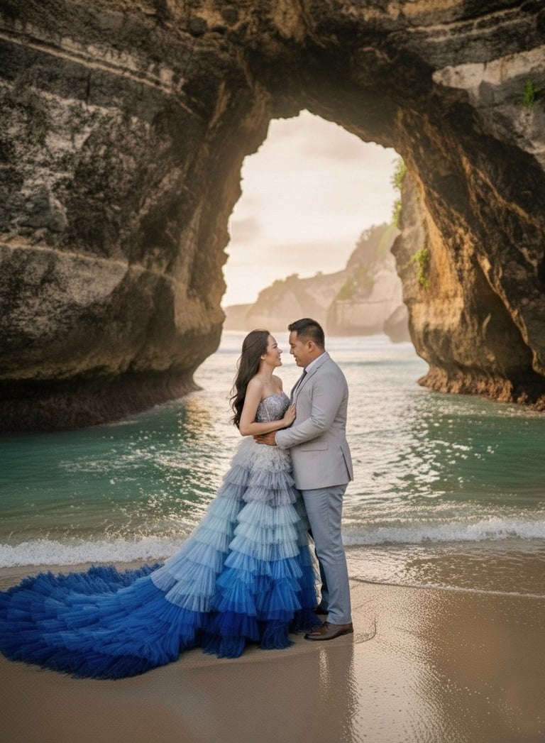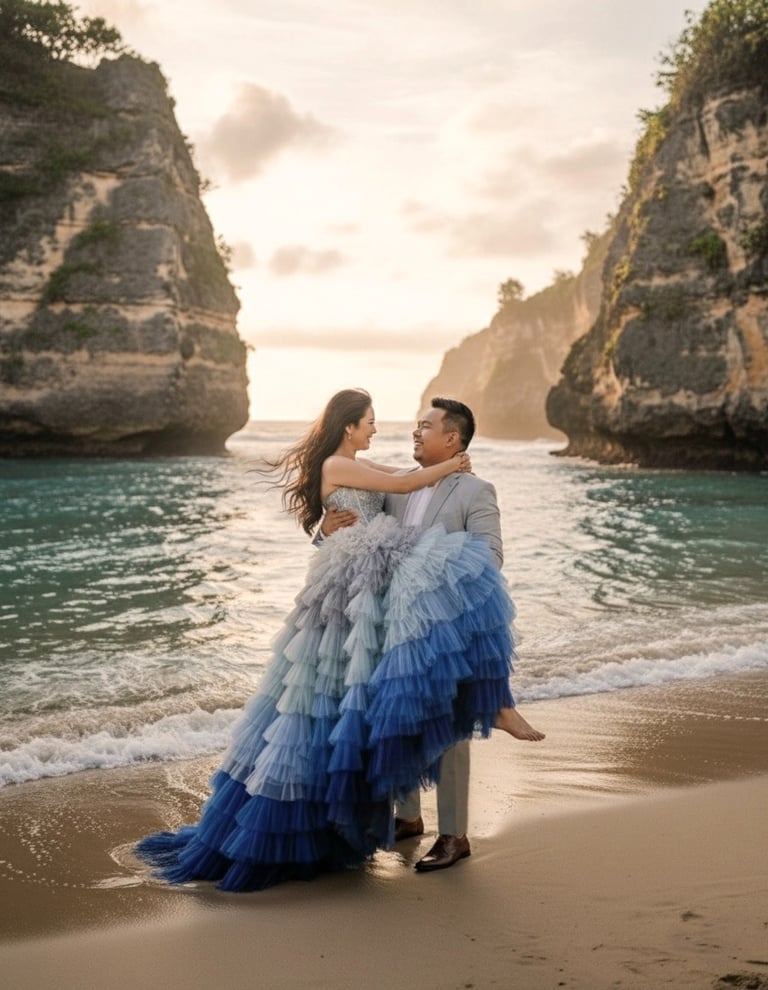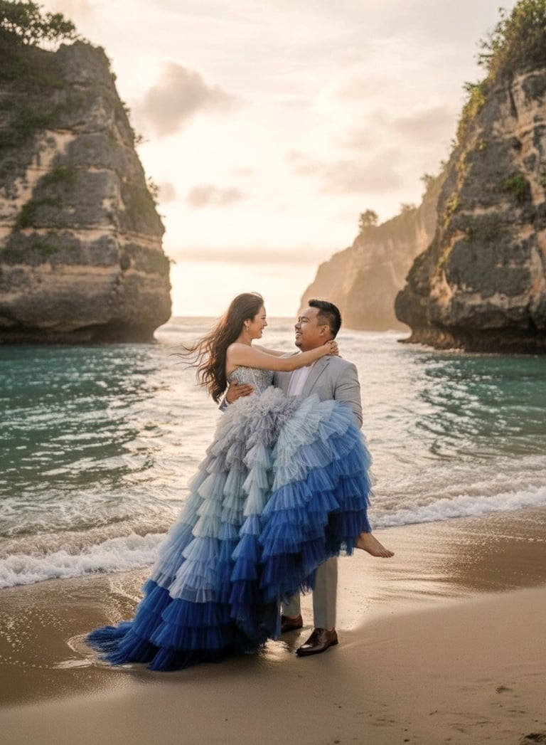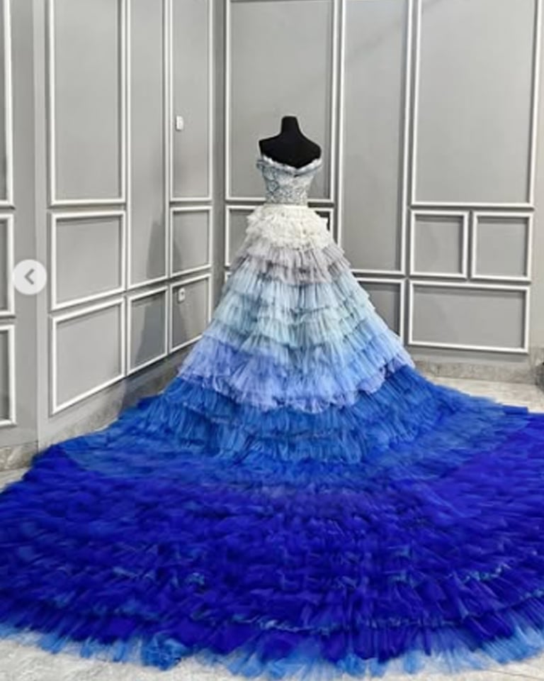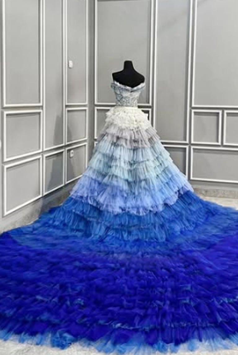 A breathtaking tide of tulle, this voluminous ballgown flows from pure white to the deepest ocean blue echoing the serene power of the sea. The gradient of waves crashing and calm horizons, a moving masterpiece of nature’s poetry. Dive into elegance.