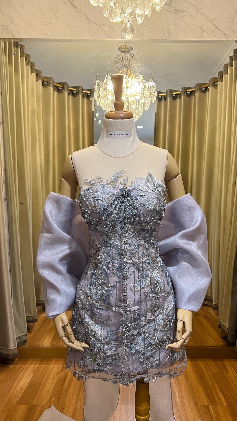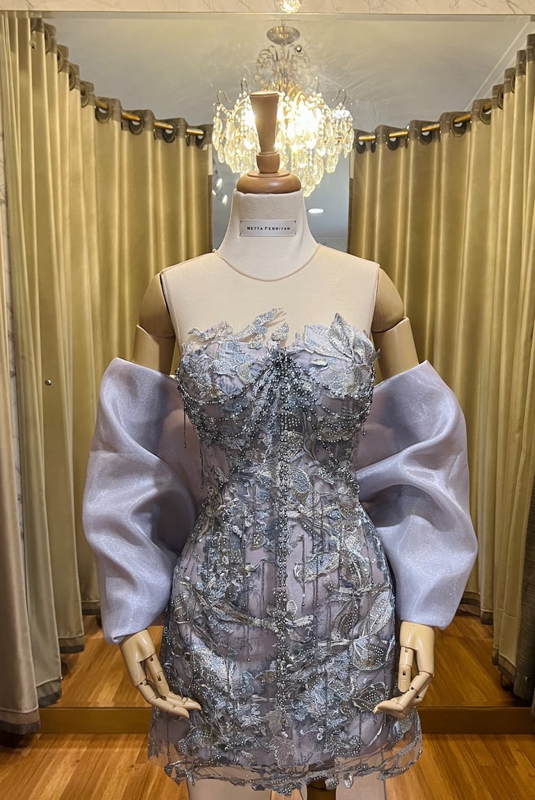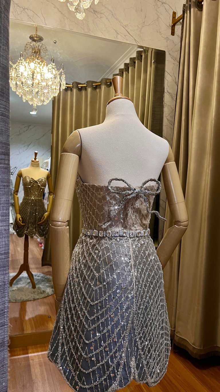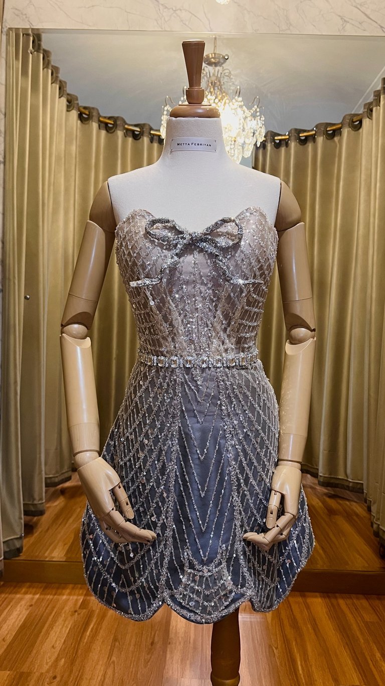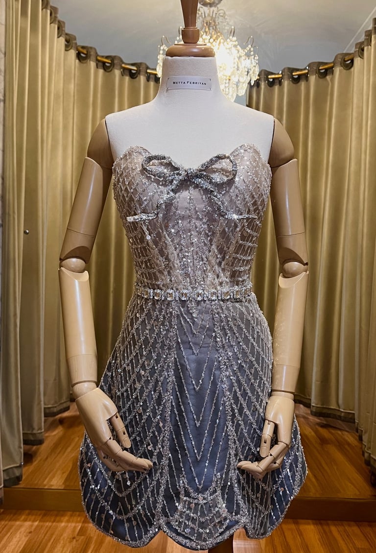 Sparkling ombre tones mini dress adorned with beadworks sculpted neckline and hem. Suitble for photoshoot, party and after party.
