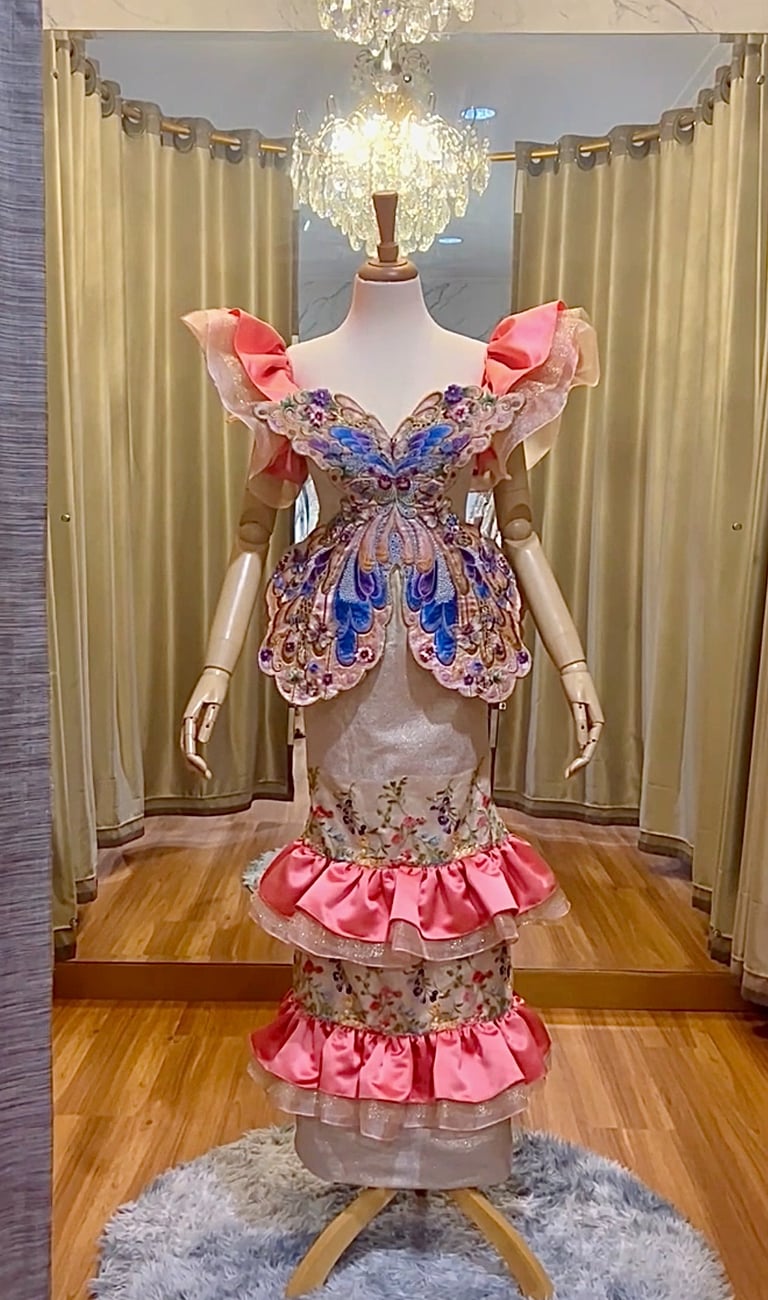 This enchanting dress captures the whimsical beauty of nature with its vibrant butterfly-inspired bodice and delicate floral embroidery. Accented by ruffles, evokes a fairytale charm.
