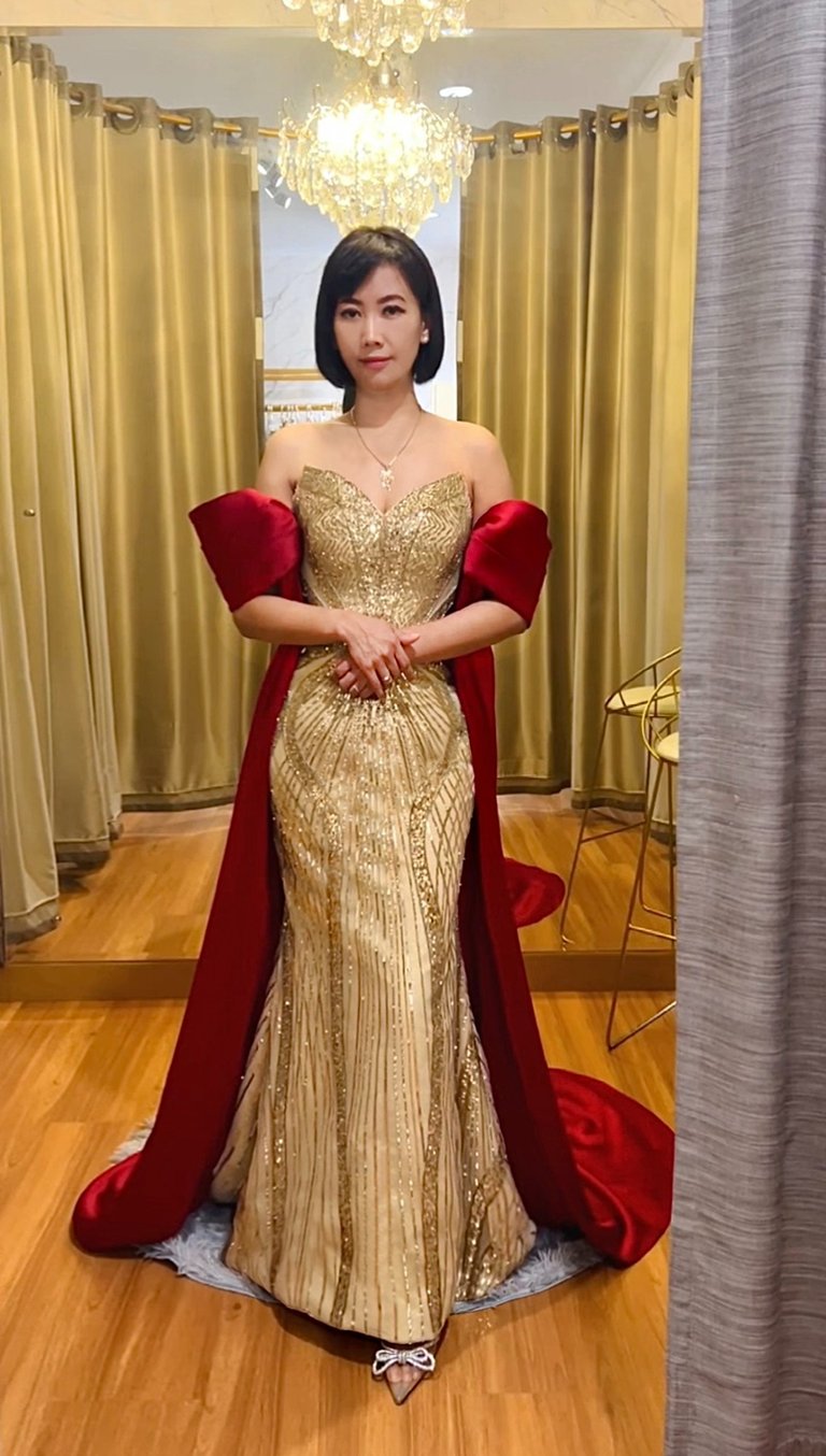 Radiate regal elegance in this champagne gold mermaid dress, adorned with intricate full-beadwork and a butterfly-silhouetted bodice. Topped with a bold red off-shoulder cape.