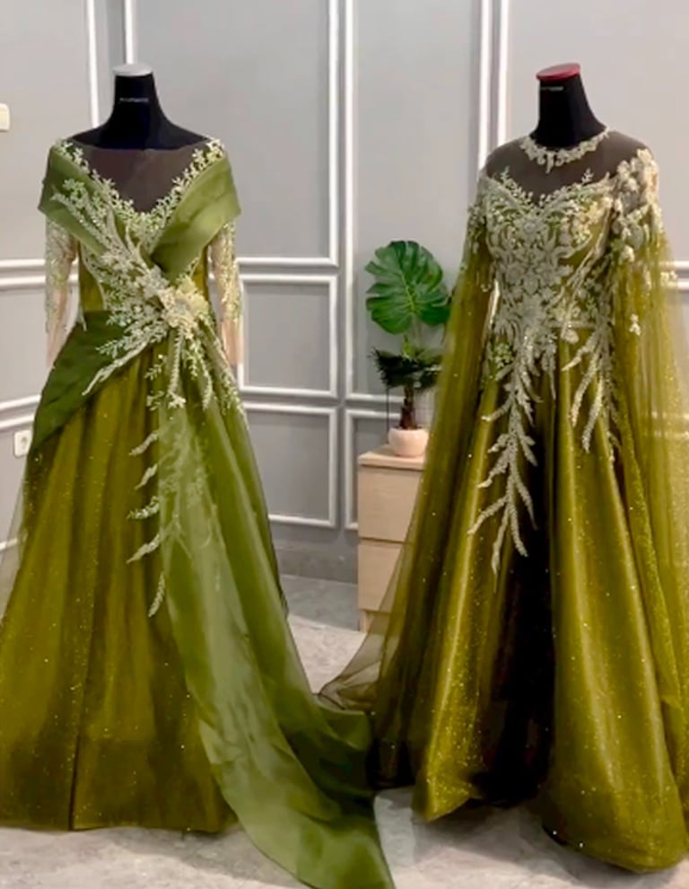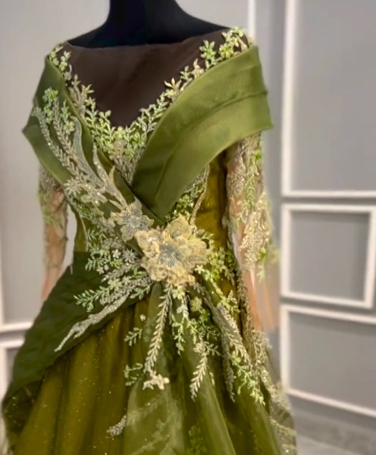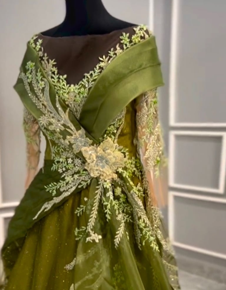 Olive Green Couture Gown with Detachable Off-Shoulder Organza Cape