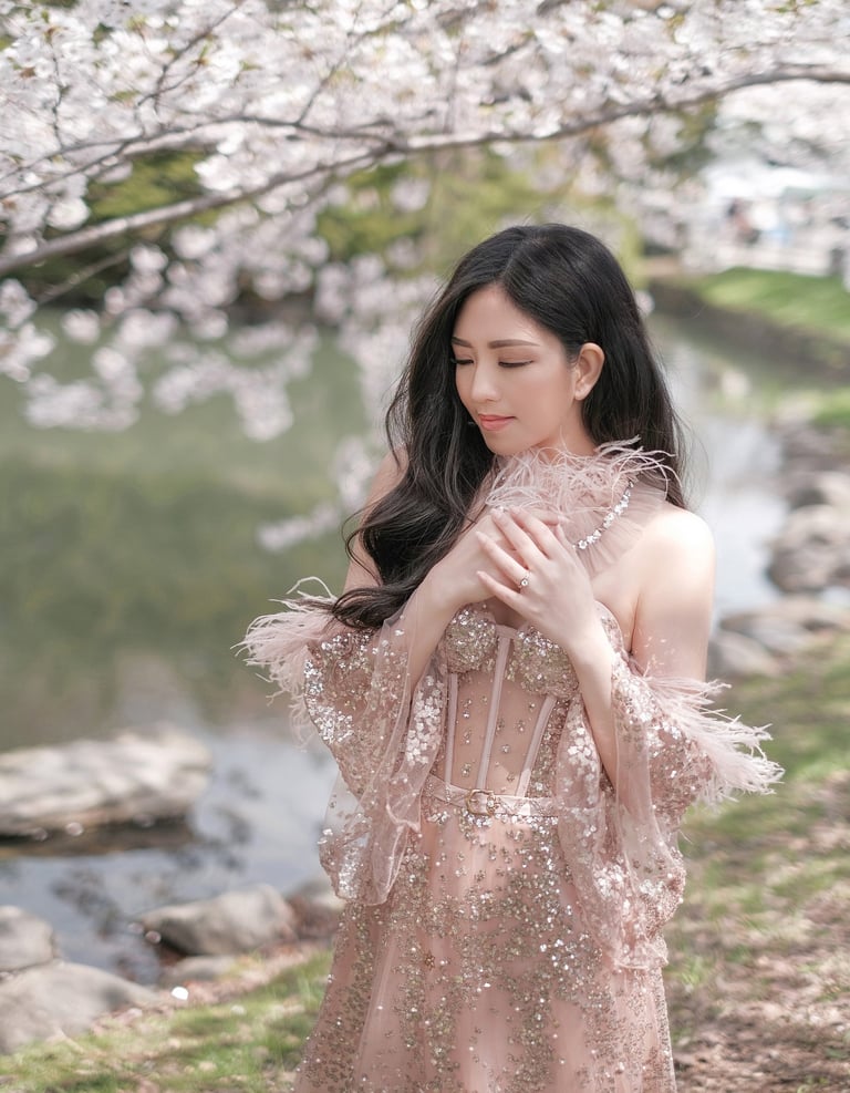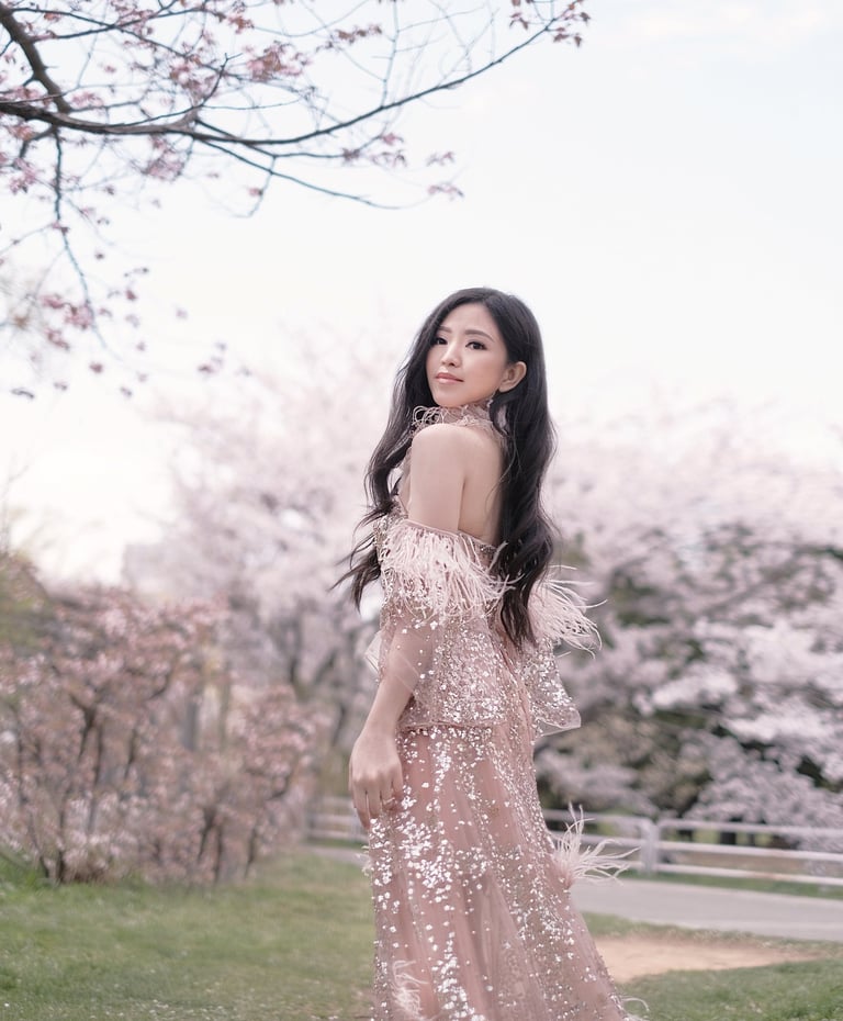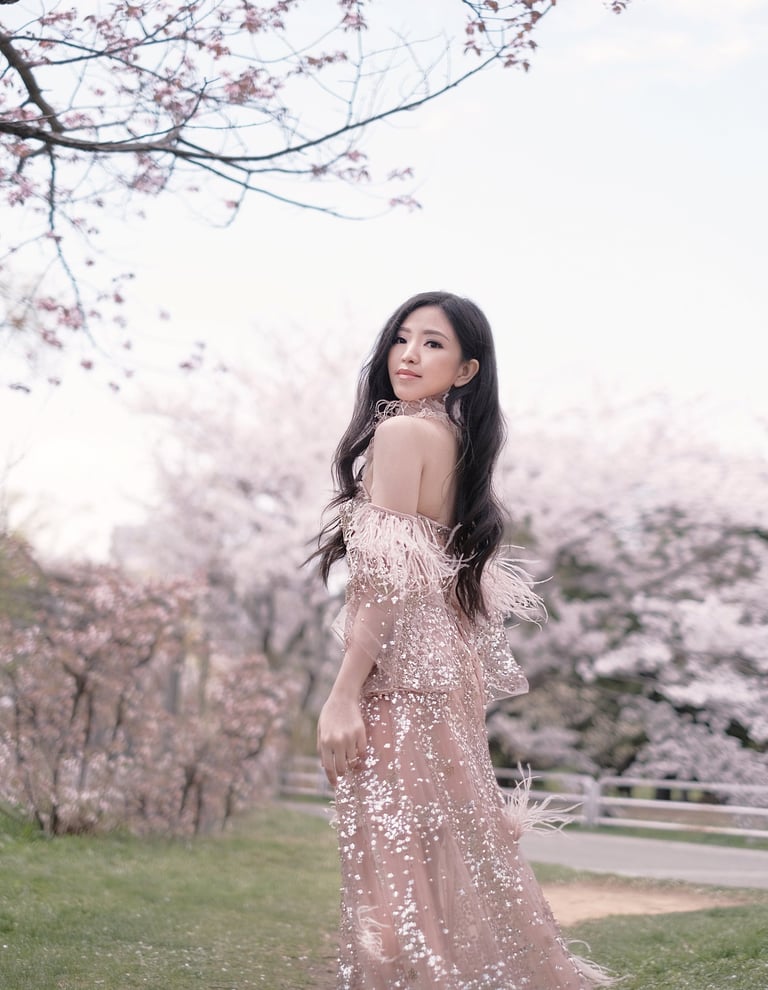 Shimmering sakura peach dress drapes effortlessly in flowing feathers and translucent fabric.