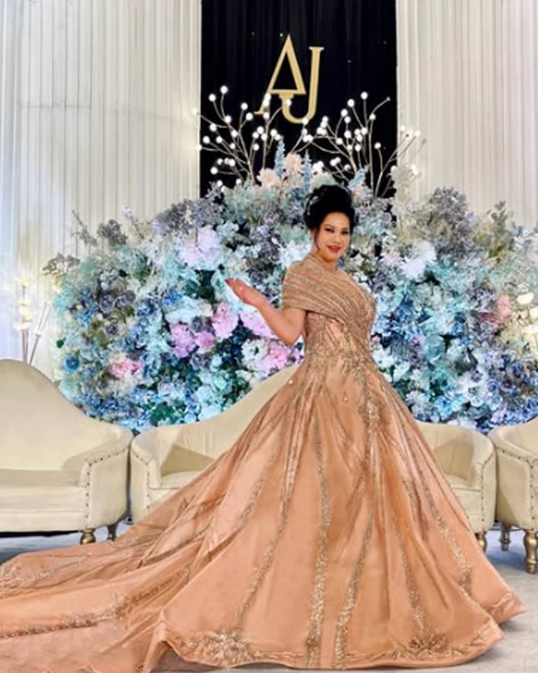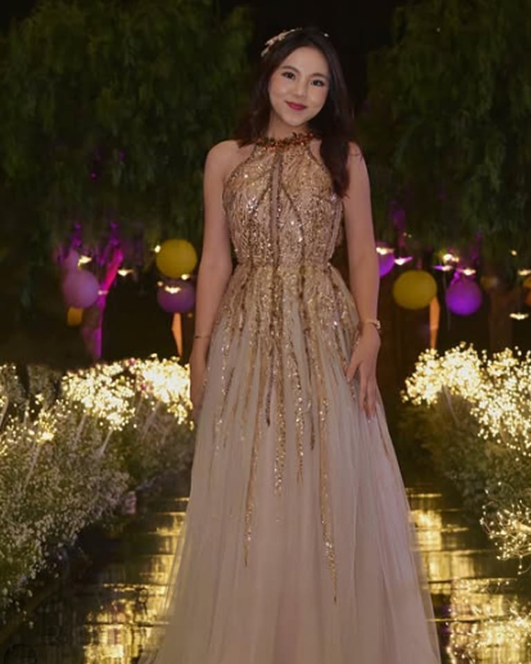 A-line gown in pale gold, blossoms with peach 3D floral appliqués, adding romantic texture to its luminous silhouette.