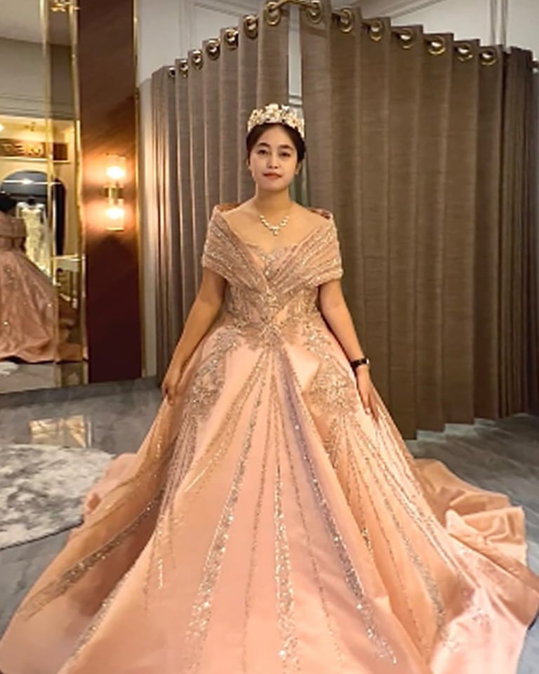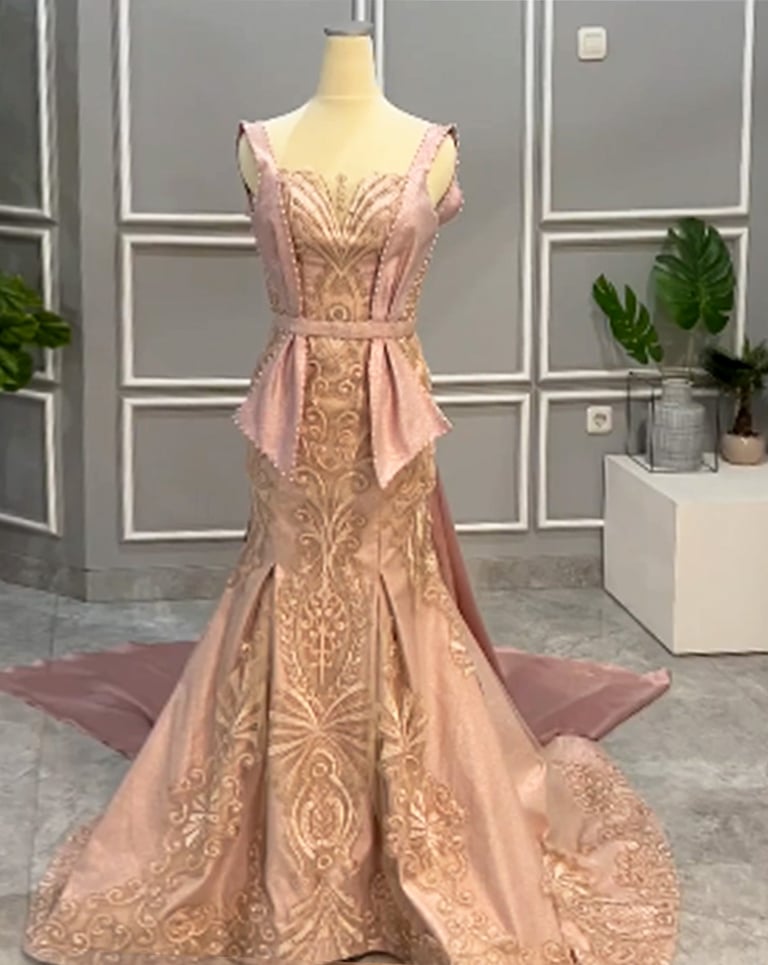 Soft as a sunset and elegant as a sigh — this champagne pink gown flows with quiet allure. Its unique split tail adds a modern touch to a timeless silhouette,