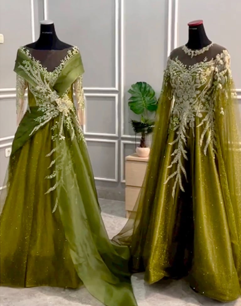 Elegant Olive Green Evening Gown with Detachable Glitter Cape