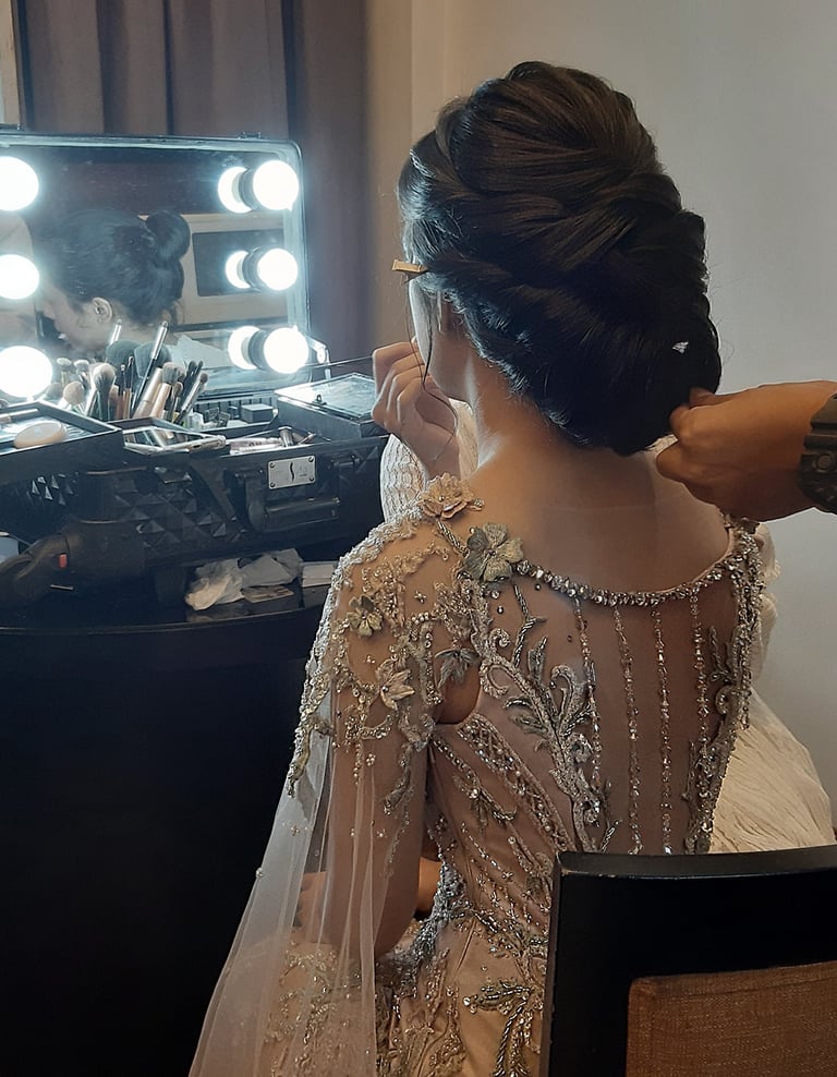 An exquisite blend of intricate leaf motif and dazzling fringed beadworks. The silver-gold sheen is beautifully complemented by a subtle blue-ish tone. Suitable fot photoshoot, party, and after party.