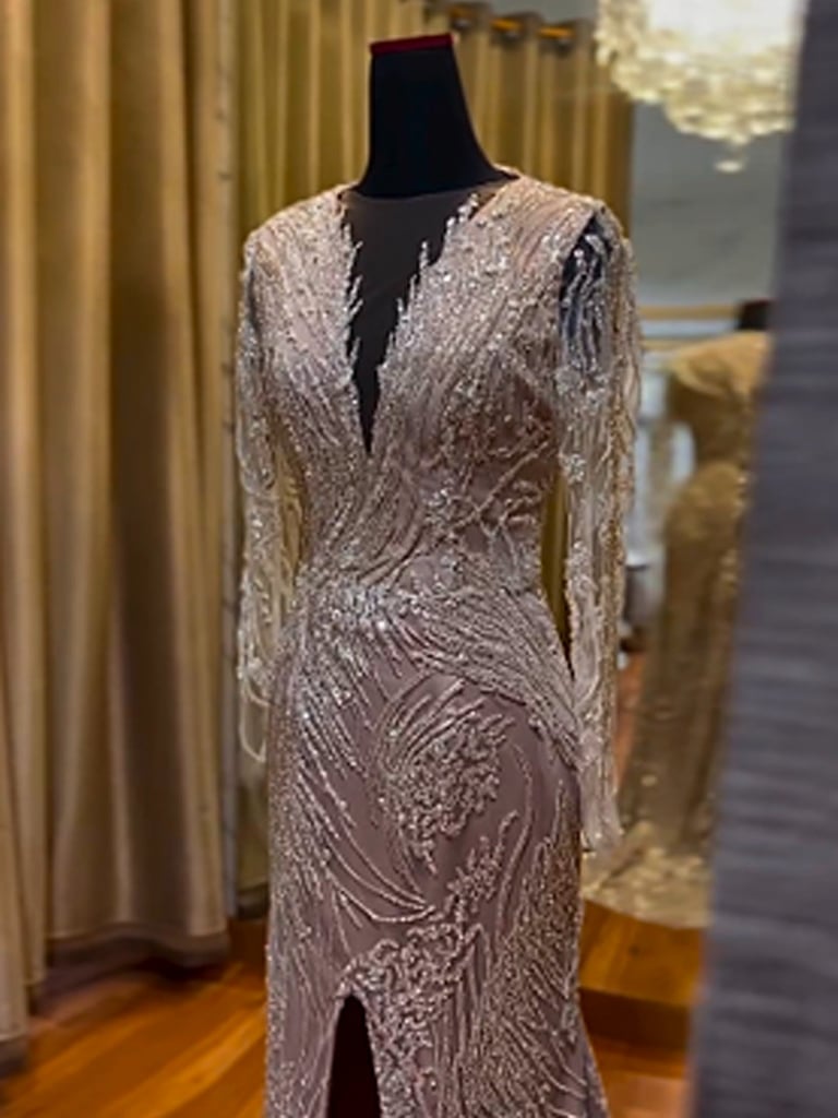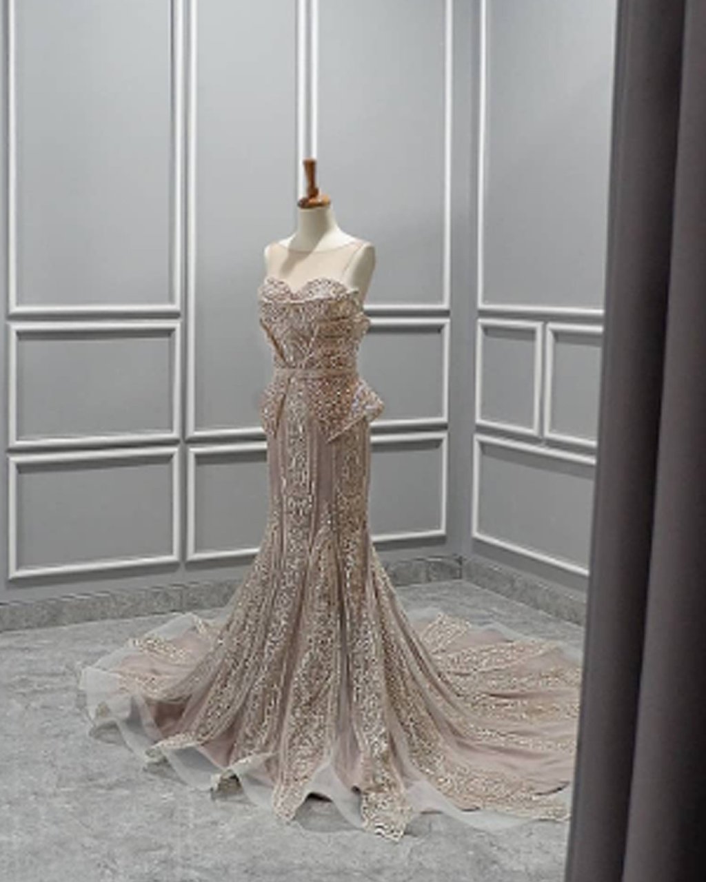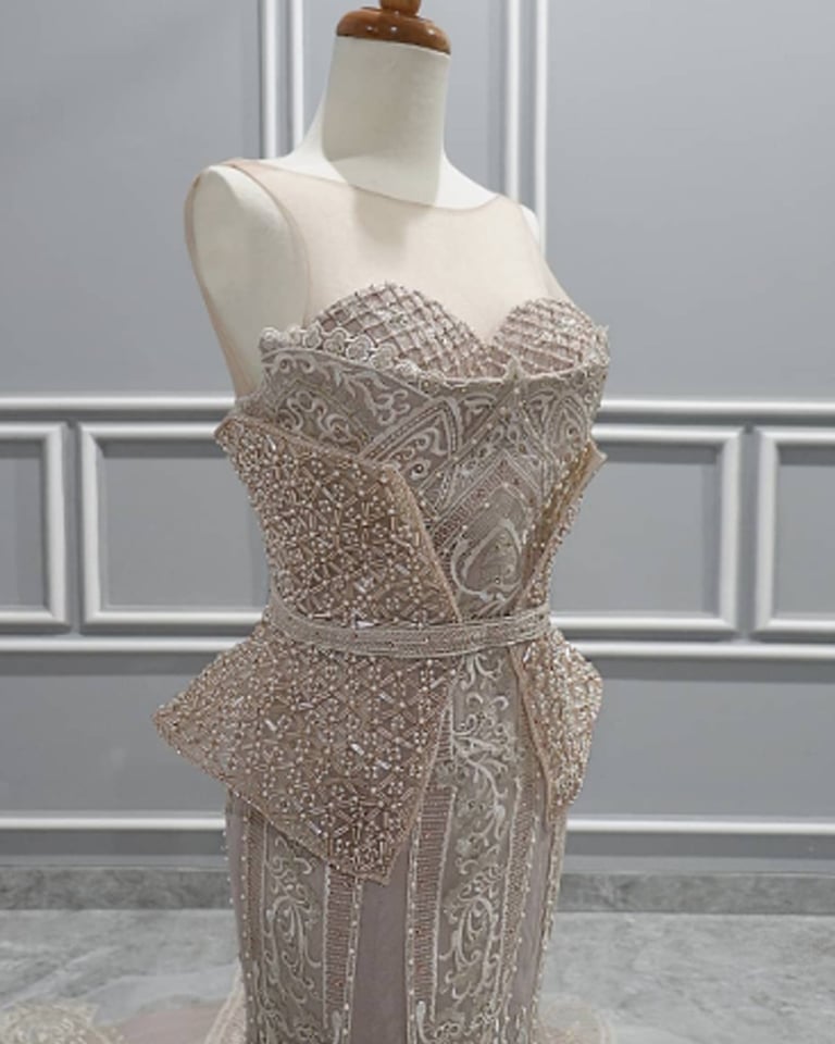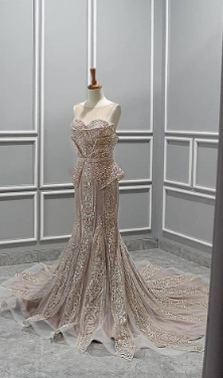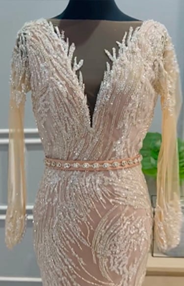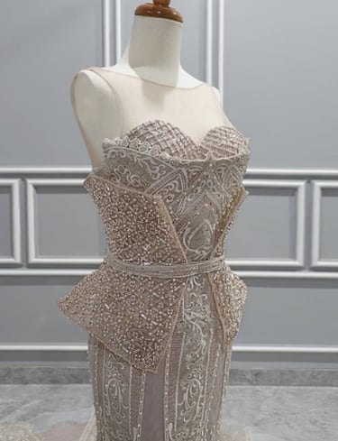 Unveil timeless elegance in this nude-based, body-fitted mermaid gown adorned with fully beaded modern lace, front slit create a stunning balance of sophistication and charm, perfectly versatile for weddings, red carpets, or any occasion.
