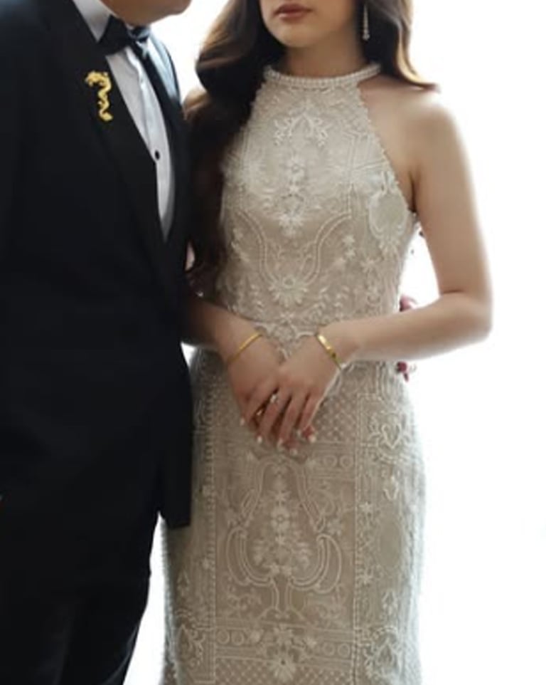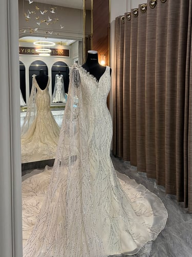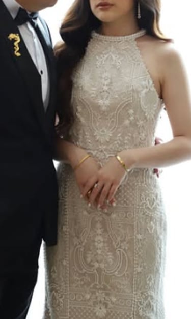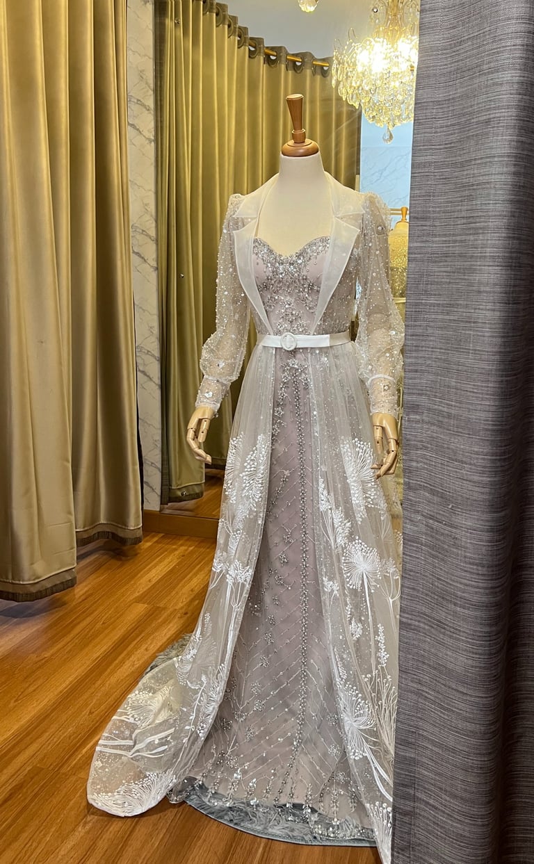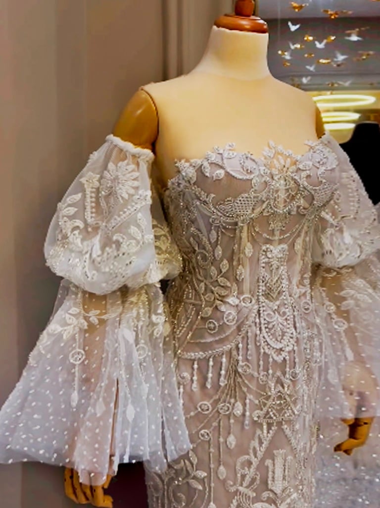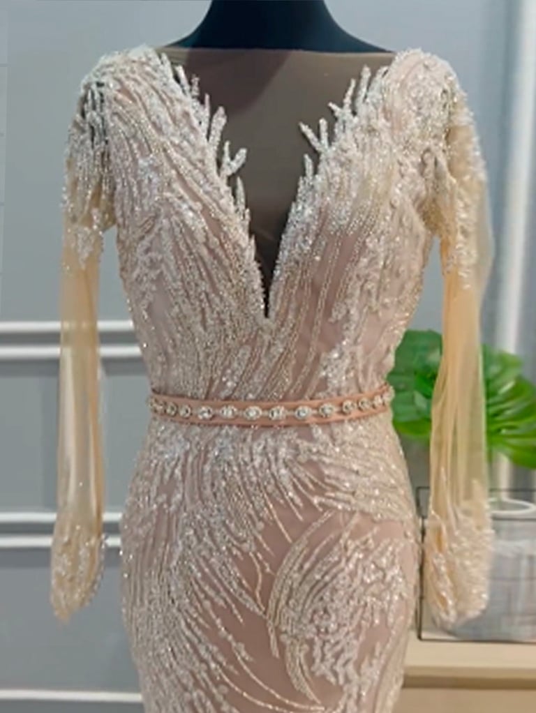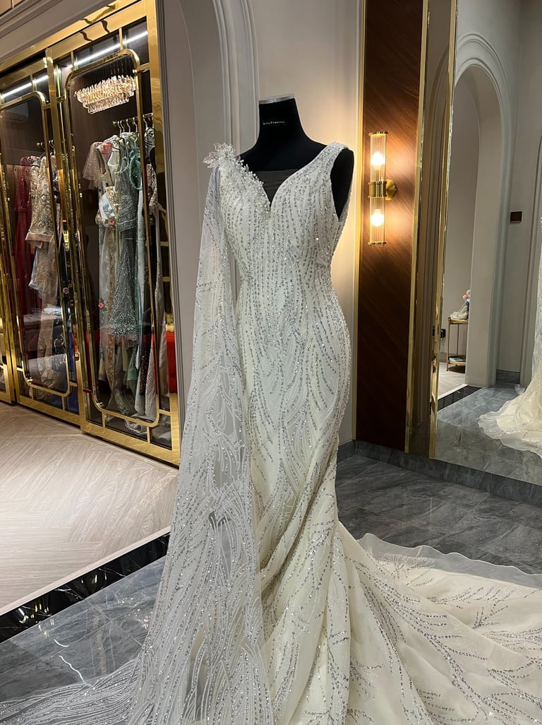 Unveil timeless elegance in this nude-based, body-fitted mermaid gown adorned with fully beaded modern lace, front slit create a stunning balance of sophistication and charm, perfectly versatile for weddings, red carpets, or any occasion.