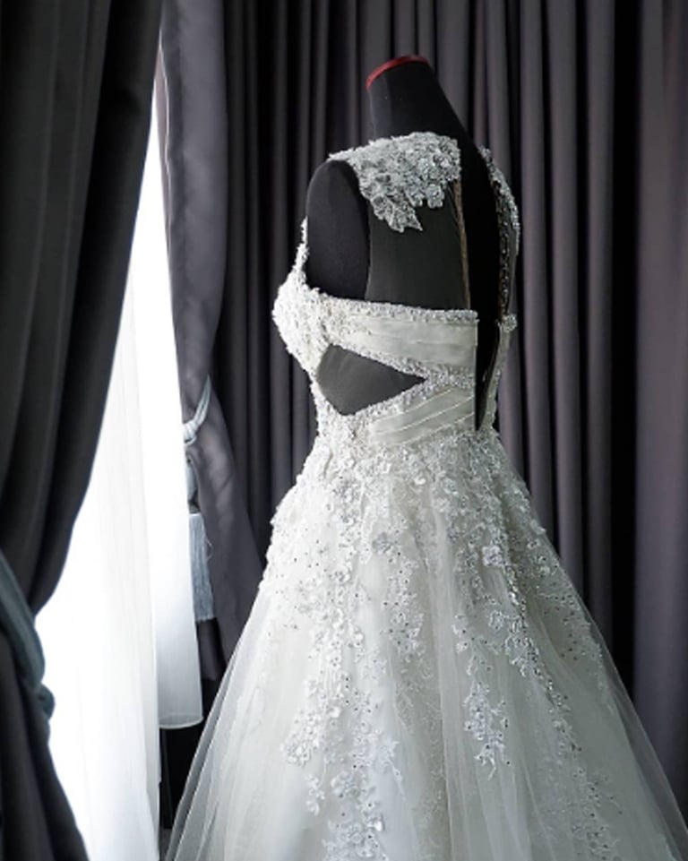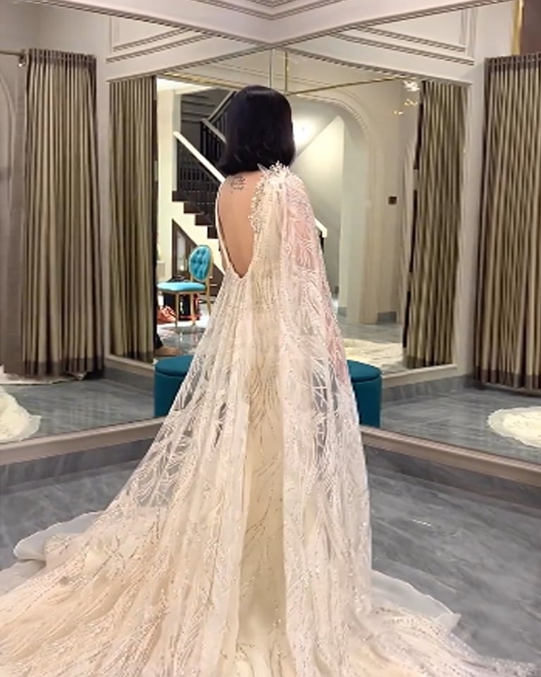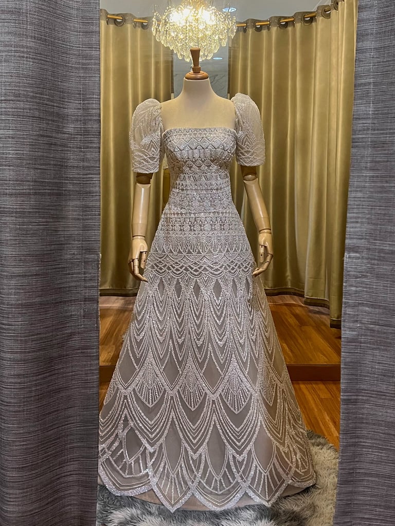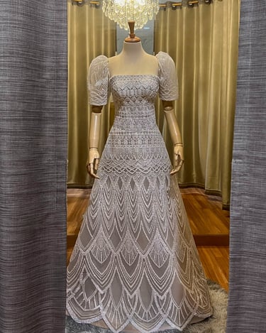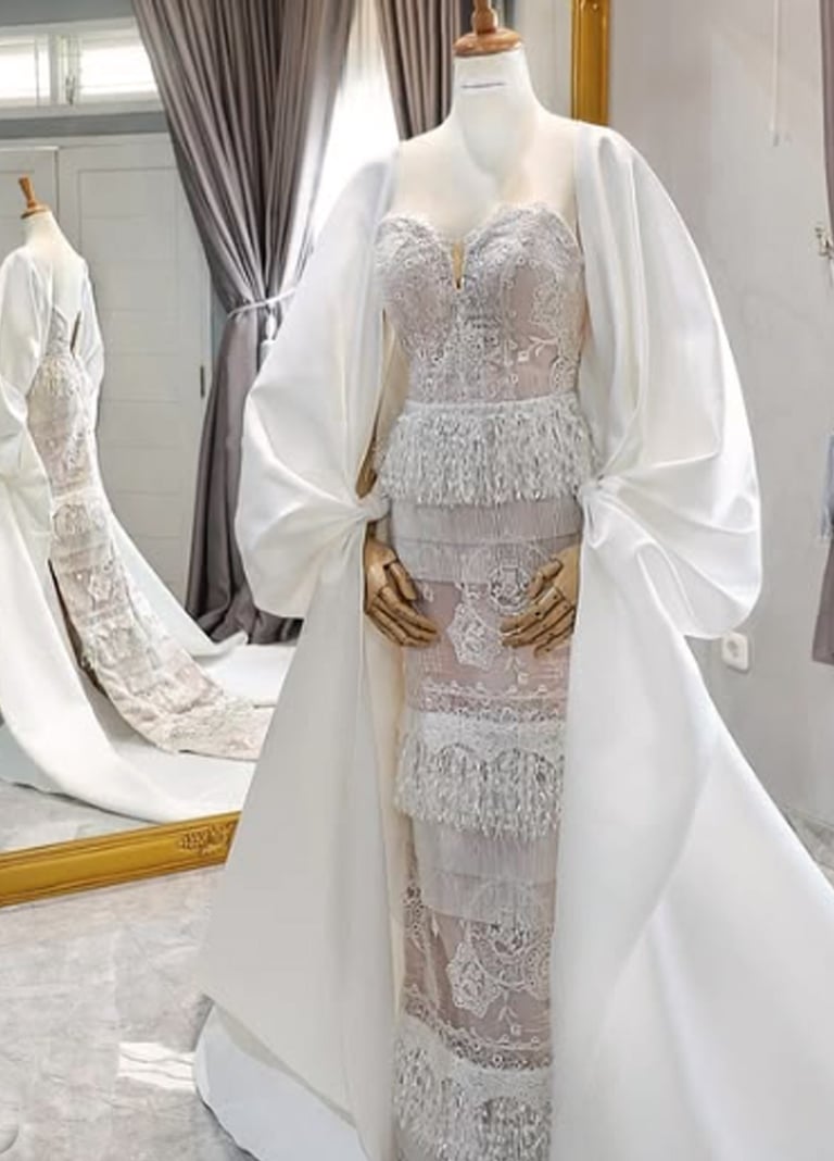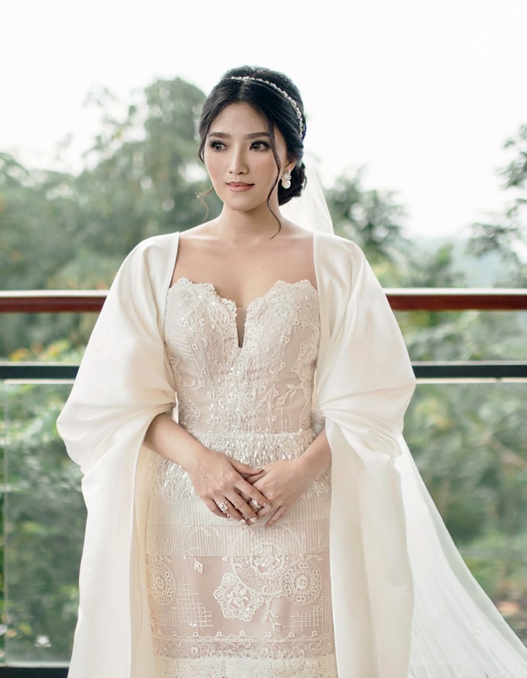 Nude-base A-line gown features intricate geometric lacework and a soft, flowing cape for a touch of ethereal grace. Its versatile elegance makes it perfect for both wedding and prewedding photoshoot.