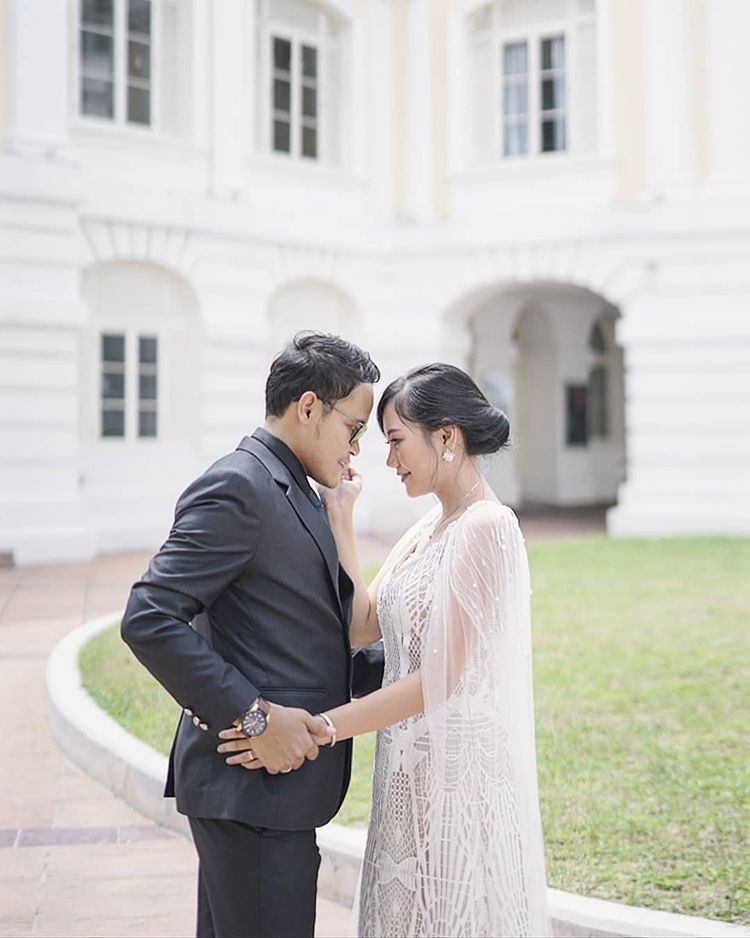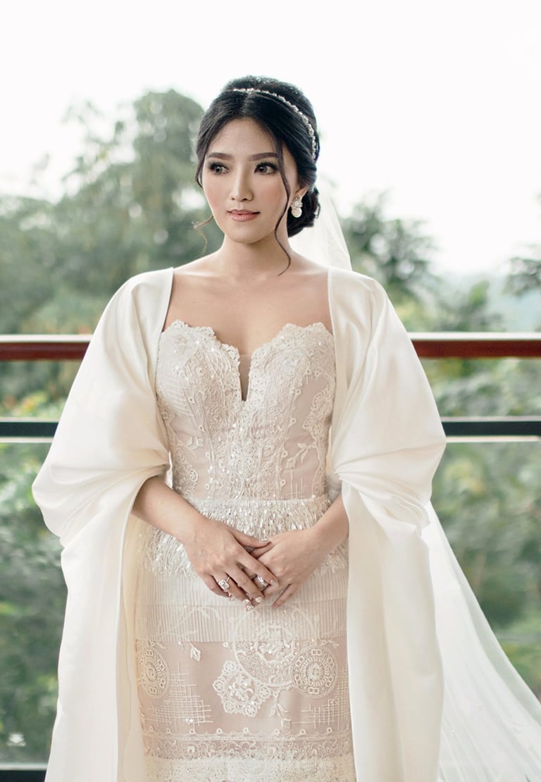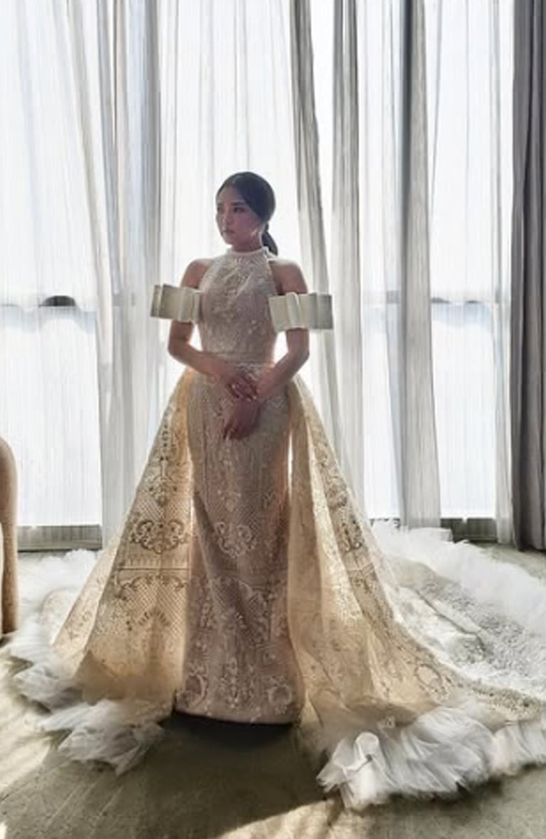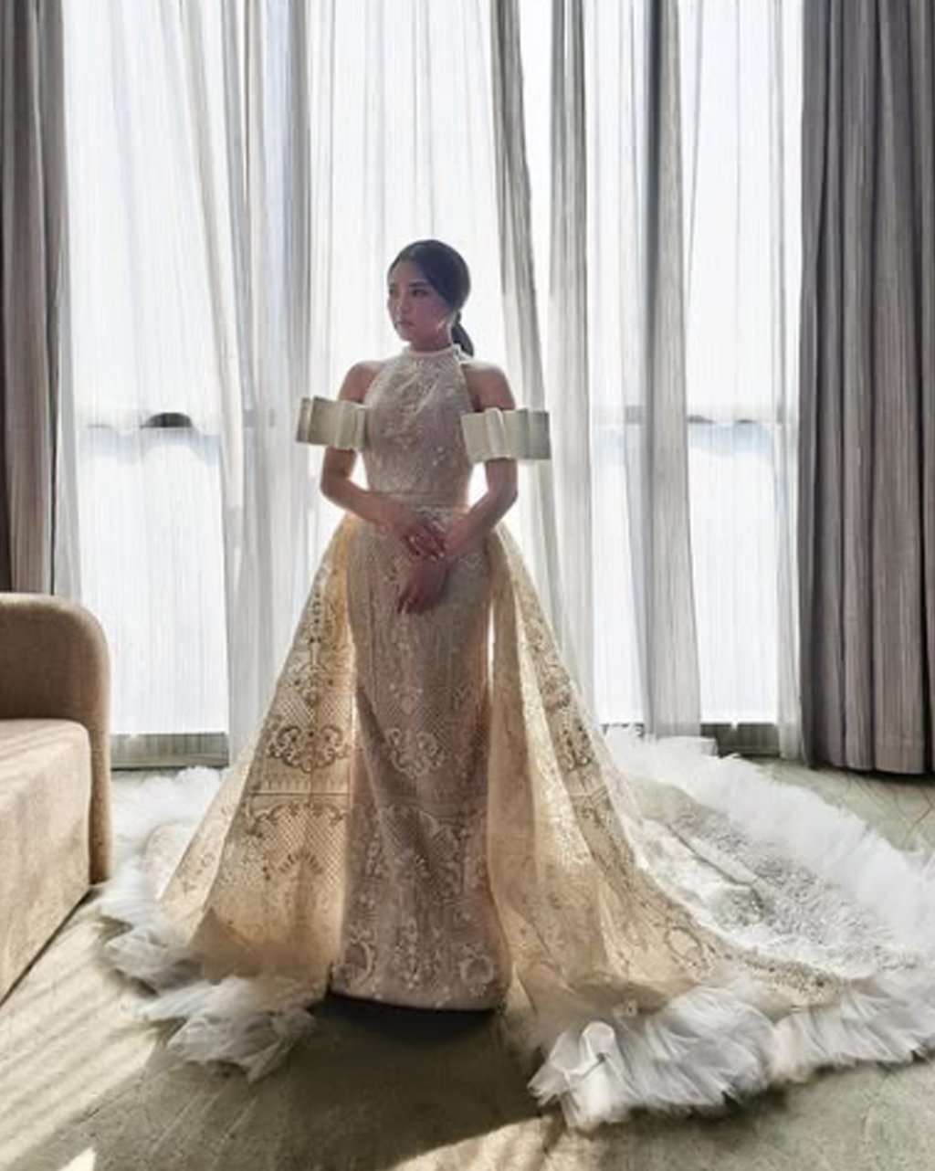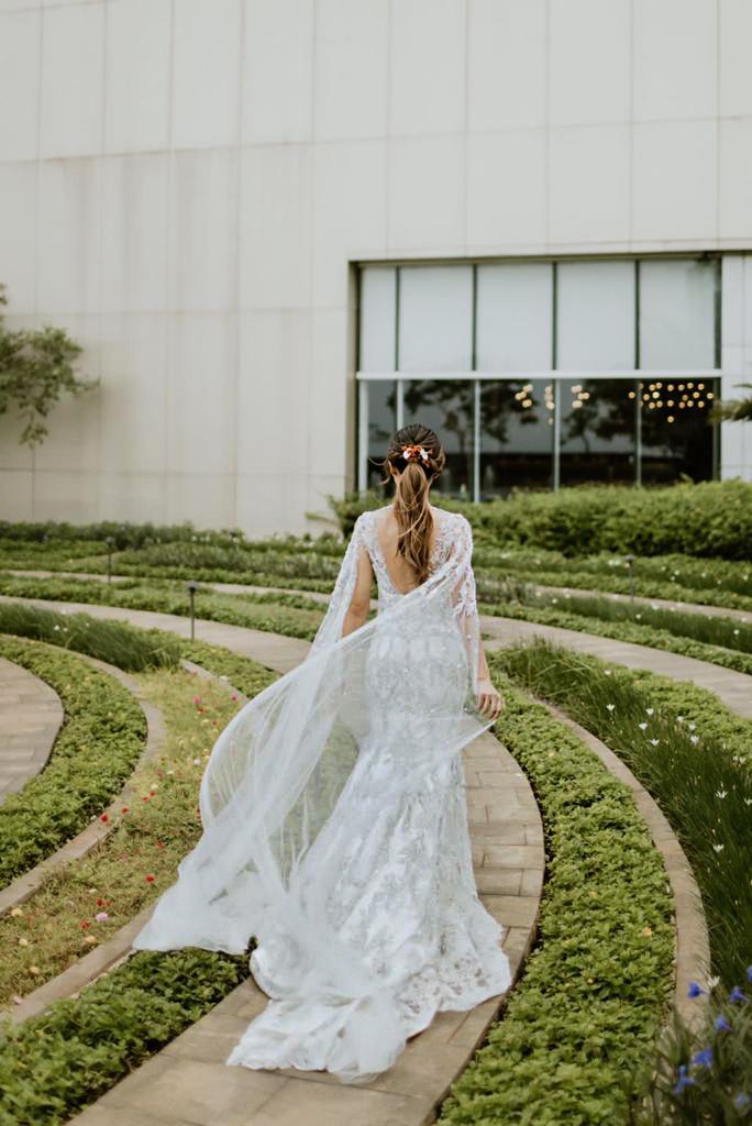 Nude-base A-line gown features intricate geometric lacework and a soft, flowing cape for a touch of ethereal grace. Its versatile elegance makes it perfect for both wedding and prewedding photoshoot.