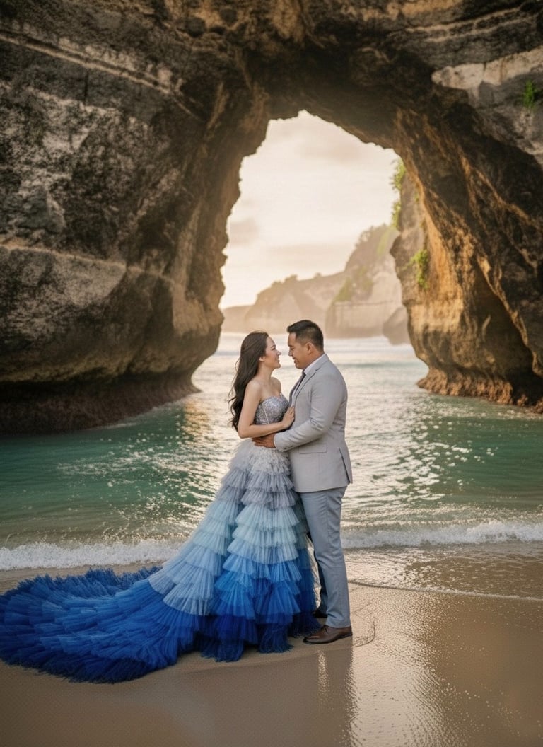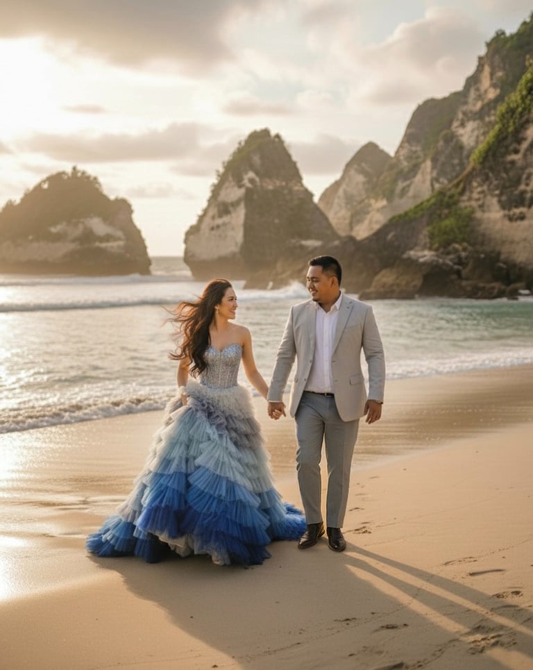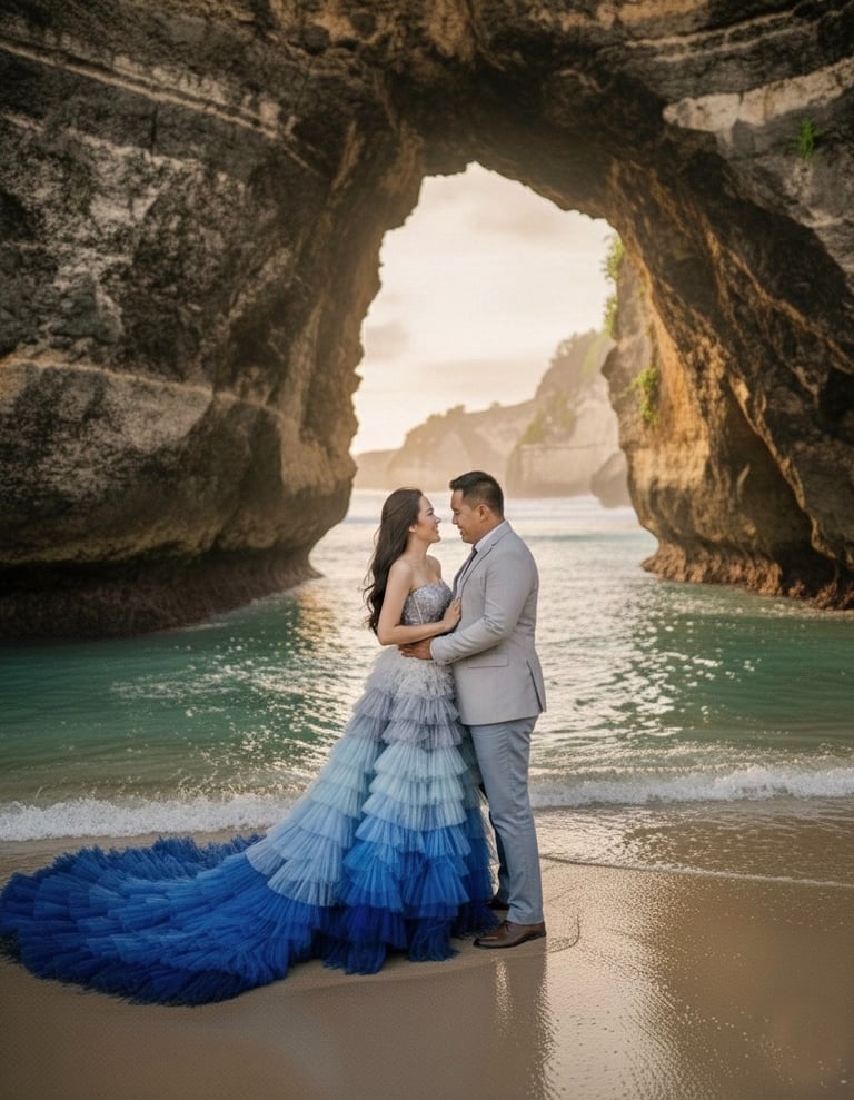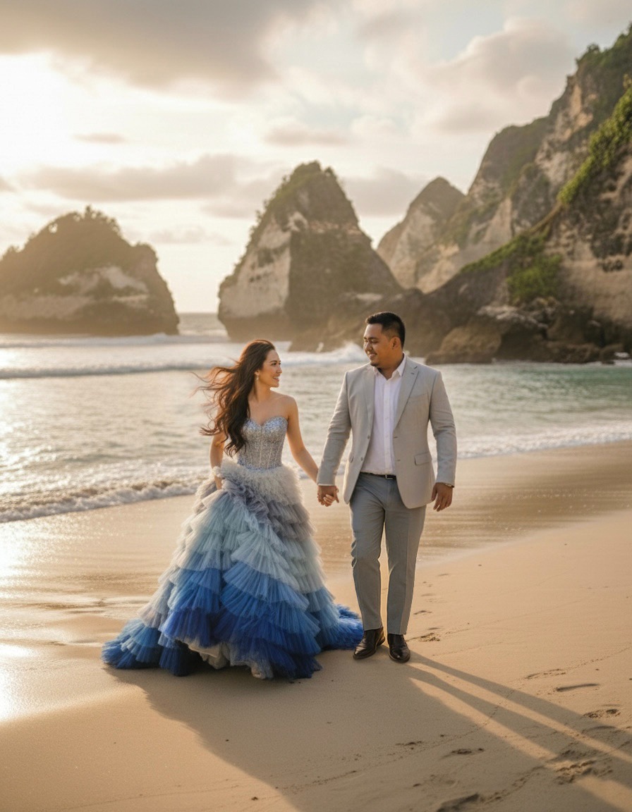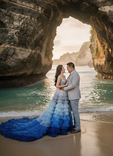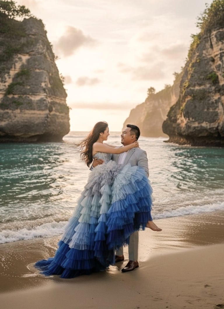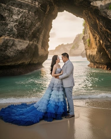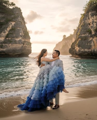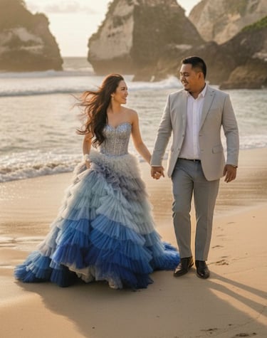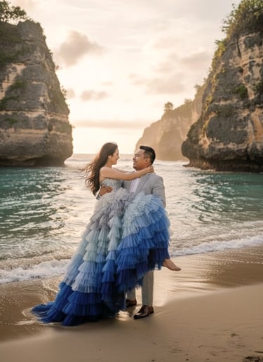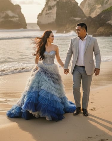 A stunning gown inspired by the meeting of ocean depth and icy elegance. Layers of soft tulle flow in gradient hues from silver frost to deep sapphire, creating a modern yet timeless look. Perfect for pre-wedding or wedding portraits, this piece captures the serenity of water and the brilliance of ice in one graceful silhouette.