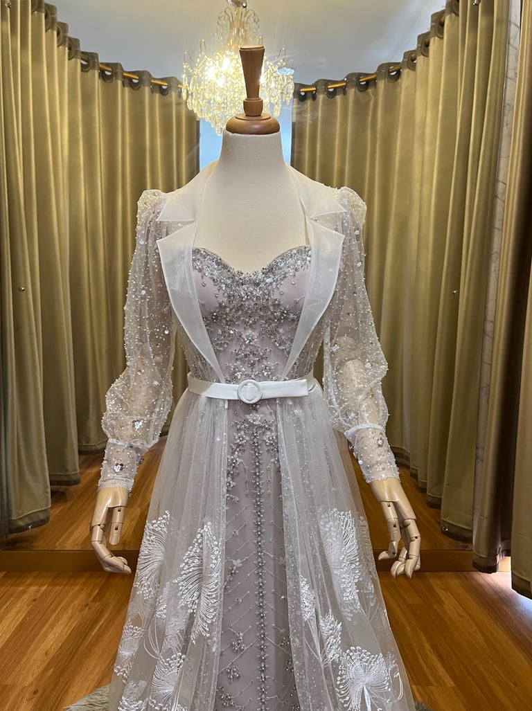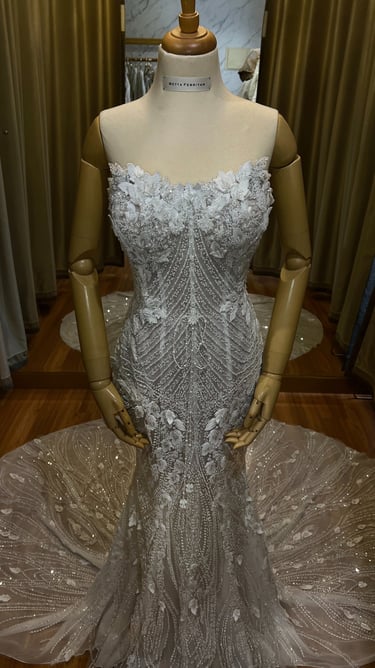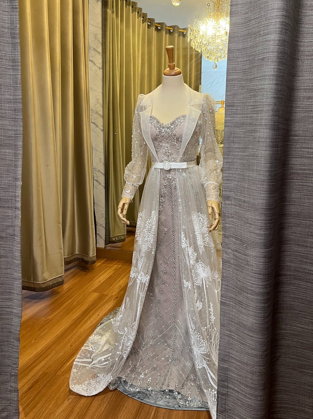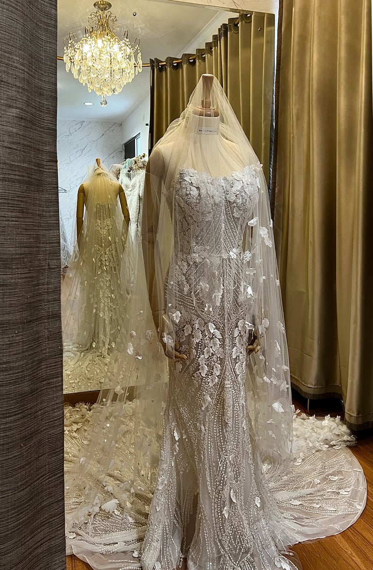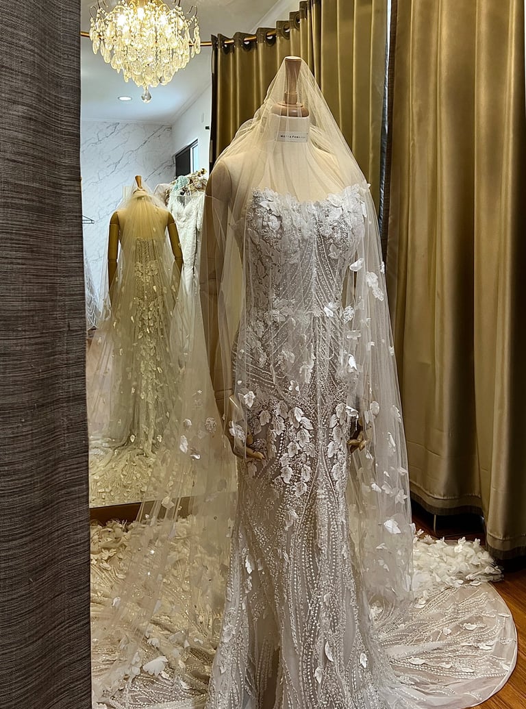 Modern charm that embodies timeless glamour with its fully hand-beaded details, intricate patterns that features a fit-and-flare/mermaid silhouette, contouring the body, adorned with petal leaves applique that creates 3D effect. Perfect for both luxury and intimate celebration. Come with 3D Flower Veil and detachable long sleeve.