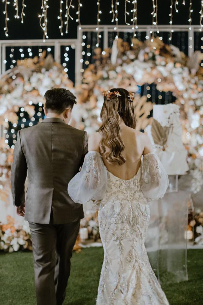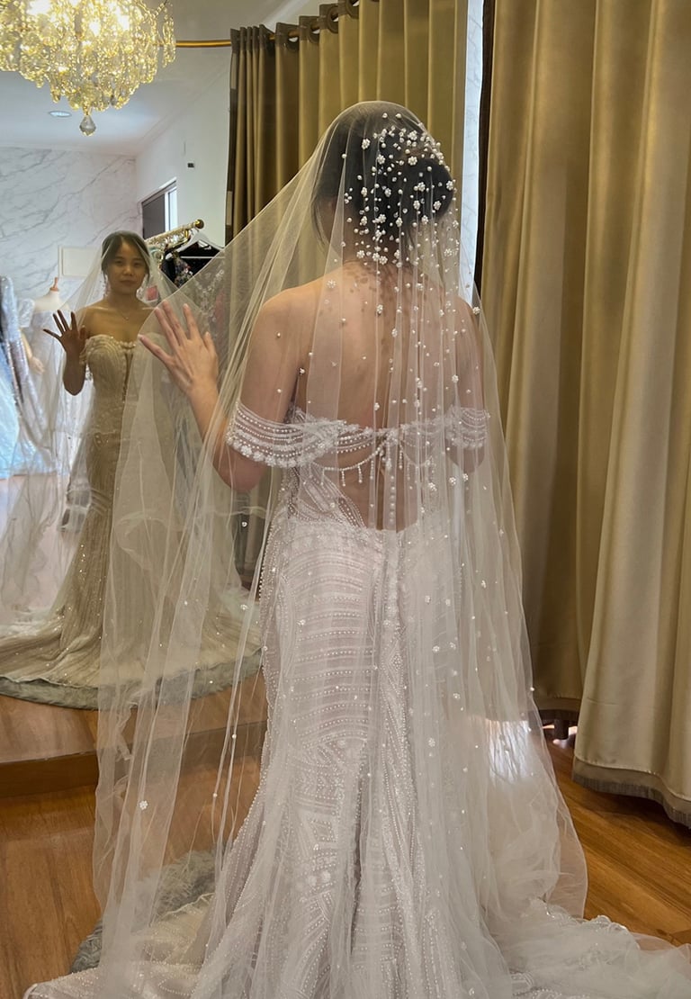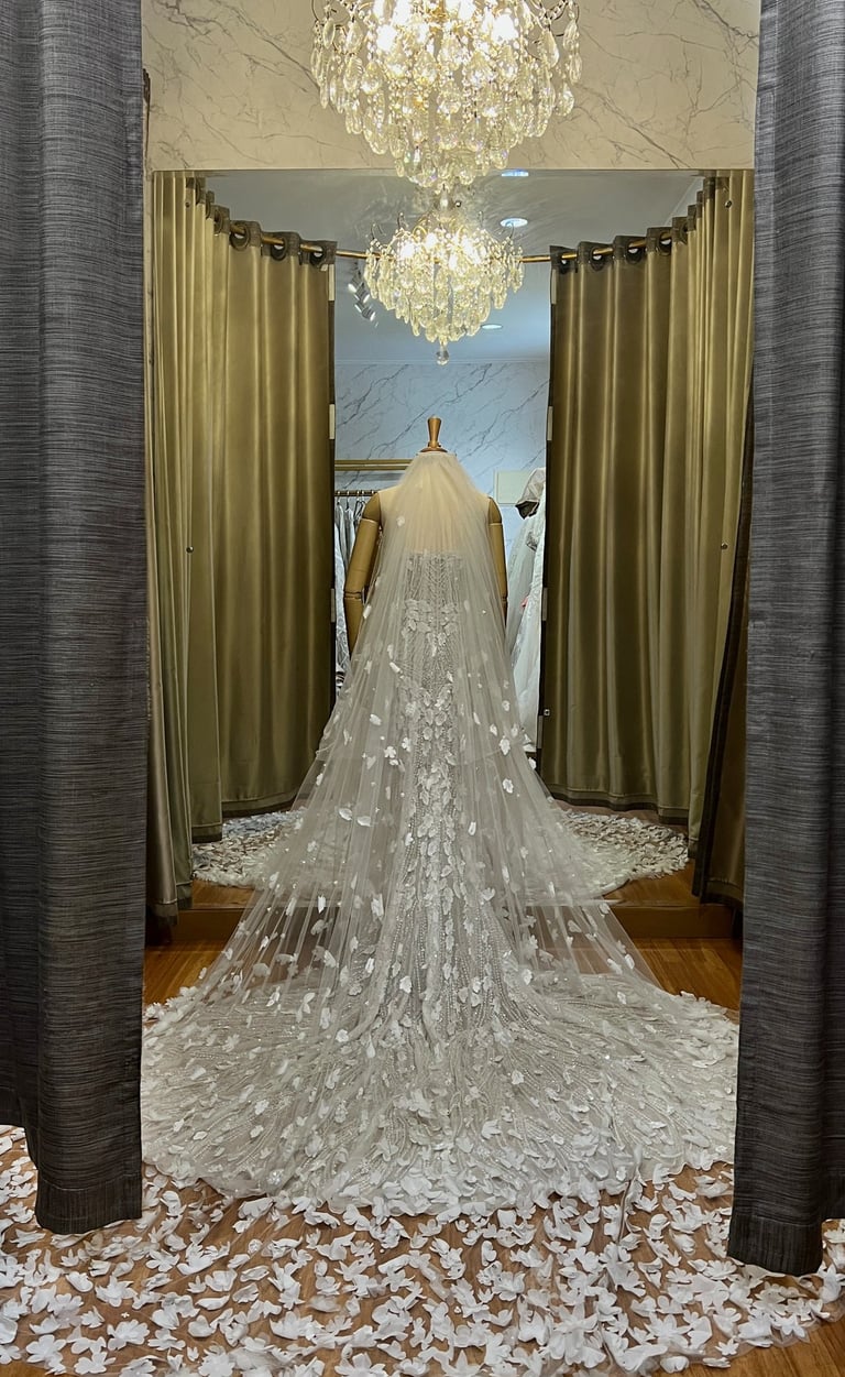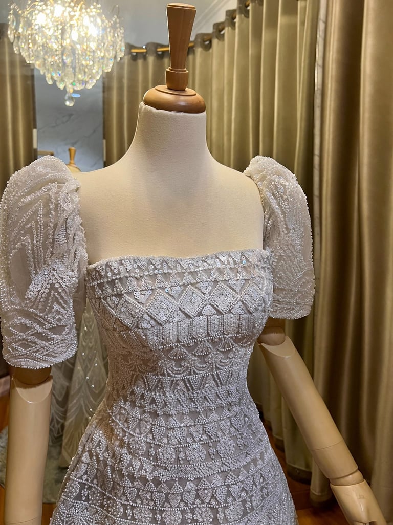 Modern charm that embodies timeless glamour with its fully hand-beaded details, intricate patterns that features a fit-and-flare/mermaid silhouette, contouring the body, adorned with petal leaves applique that creates 3D effect. Perfect for both luxury and intimate celebration. Come with 3D Flower Veil and detachable long sleeve.