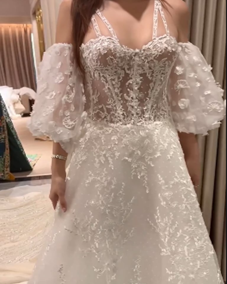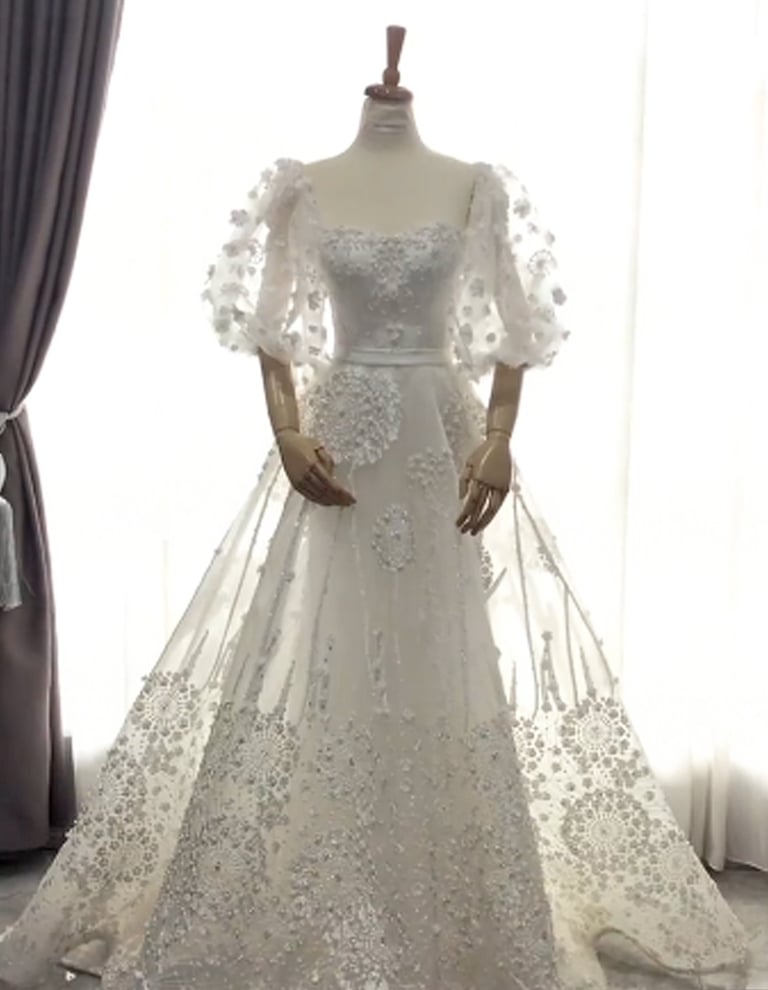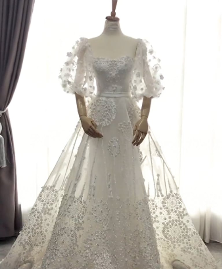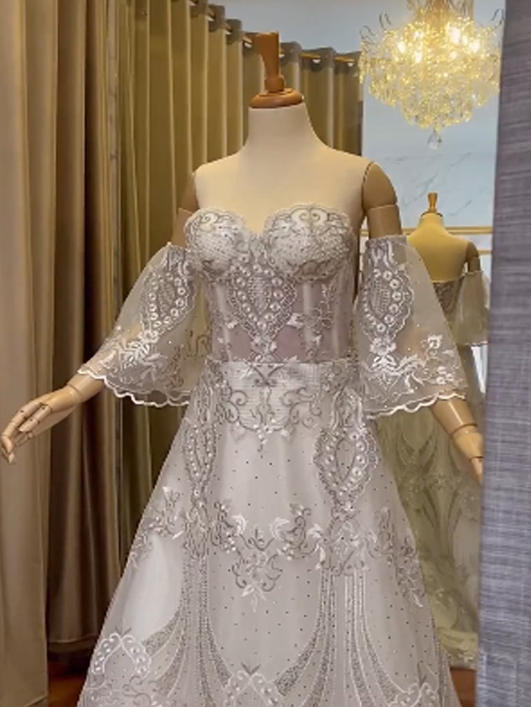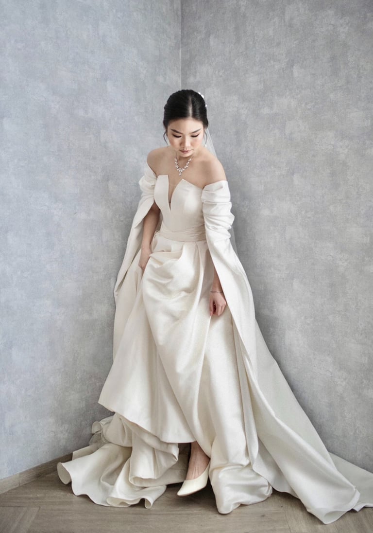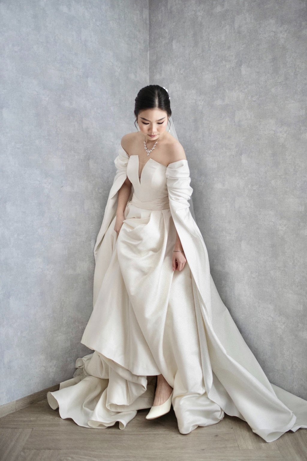 Effortlessly elegant in every stitch, fully plain A-line wedding gown features a minimalist silhouette with a modern twist. Complete with detachable long balloon sleeves, it offers a dreamy balance of romance and versatility.