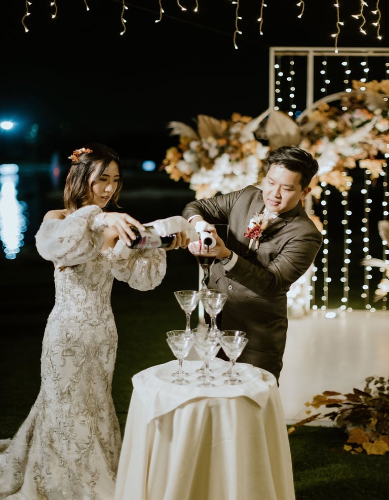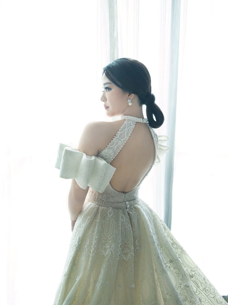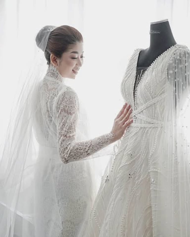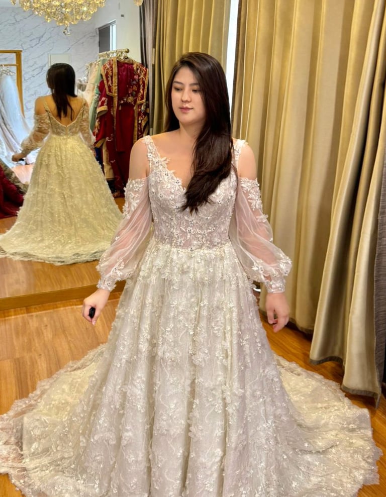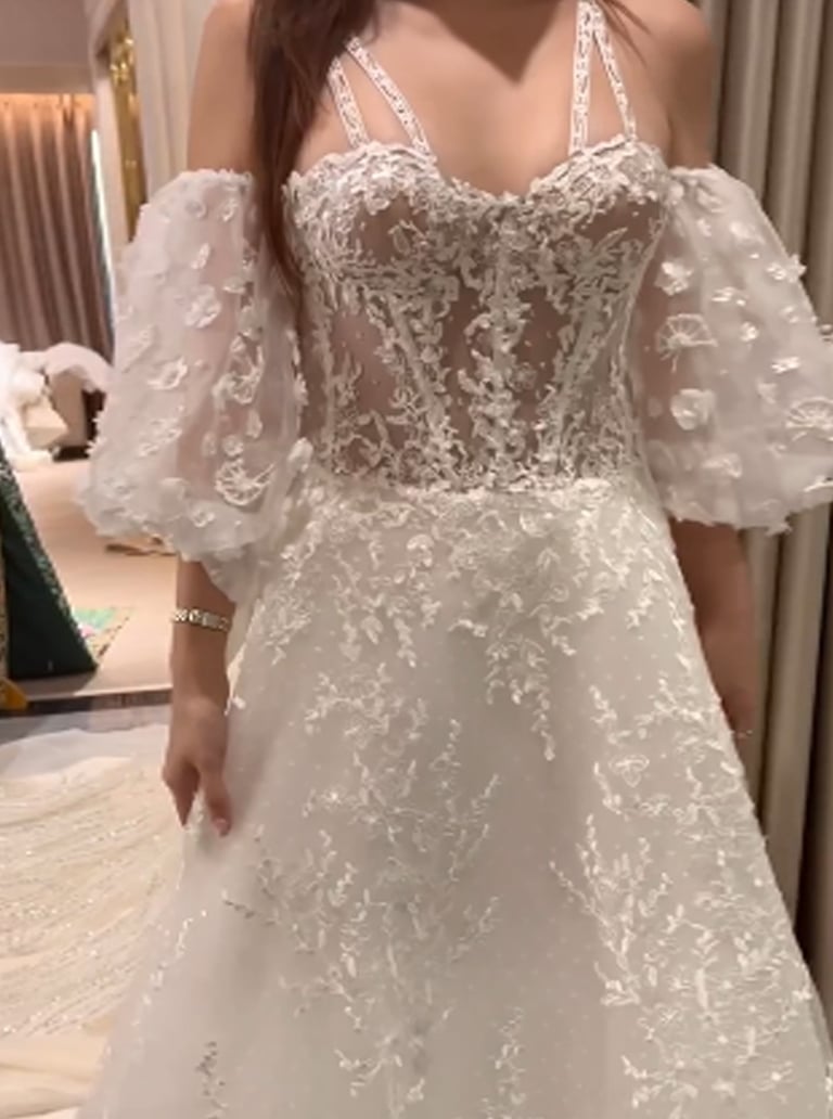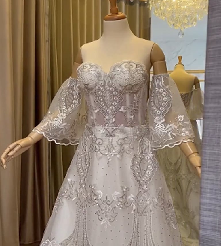 Effortlessly elegant in every stitch, fully plain A-line wedding gown features a minimalist silhouette with a modern twist. Complete with detachable long balloon sleeves, it offers a dreamy balance of romance and versatility.