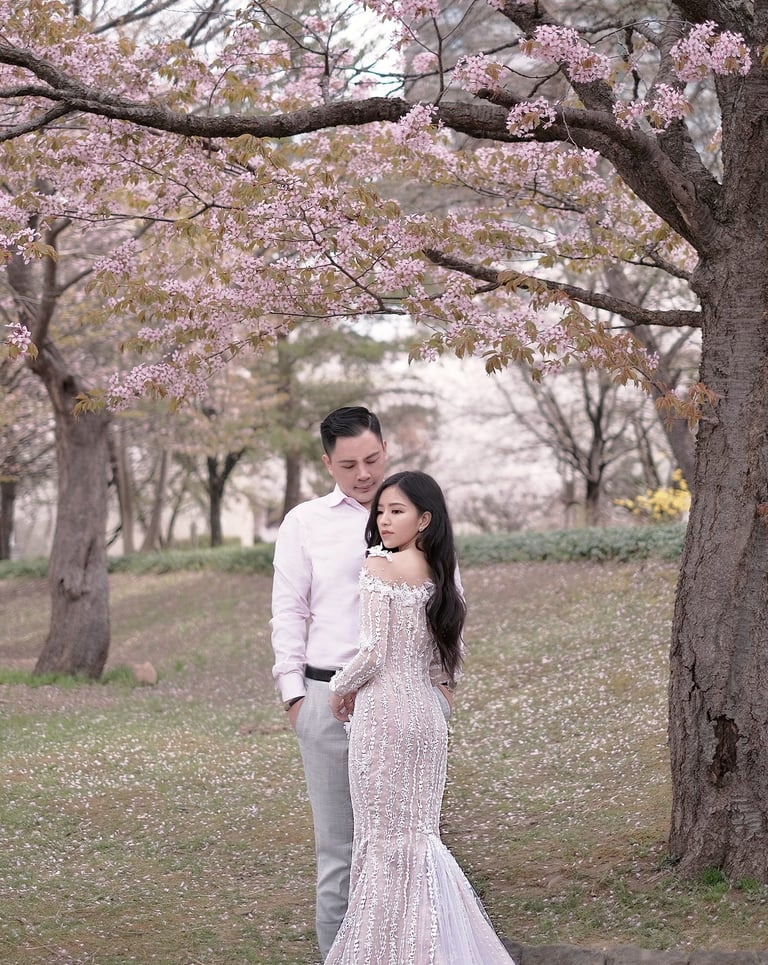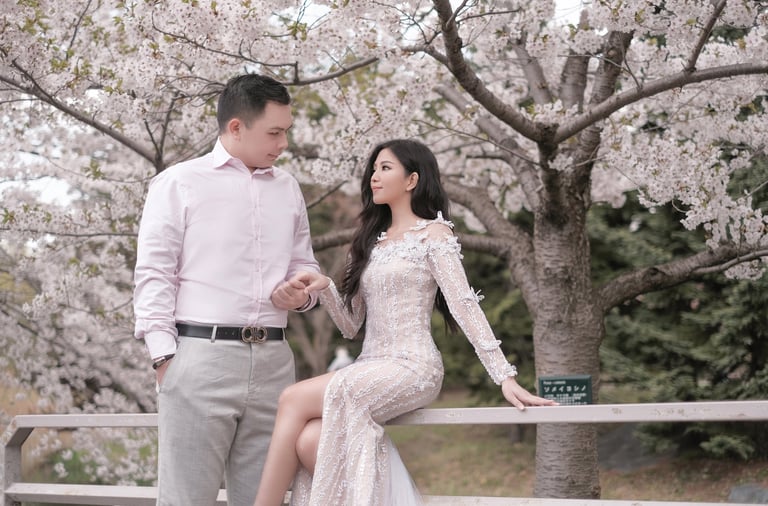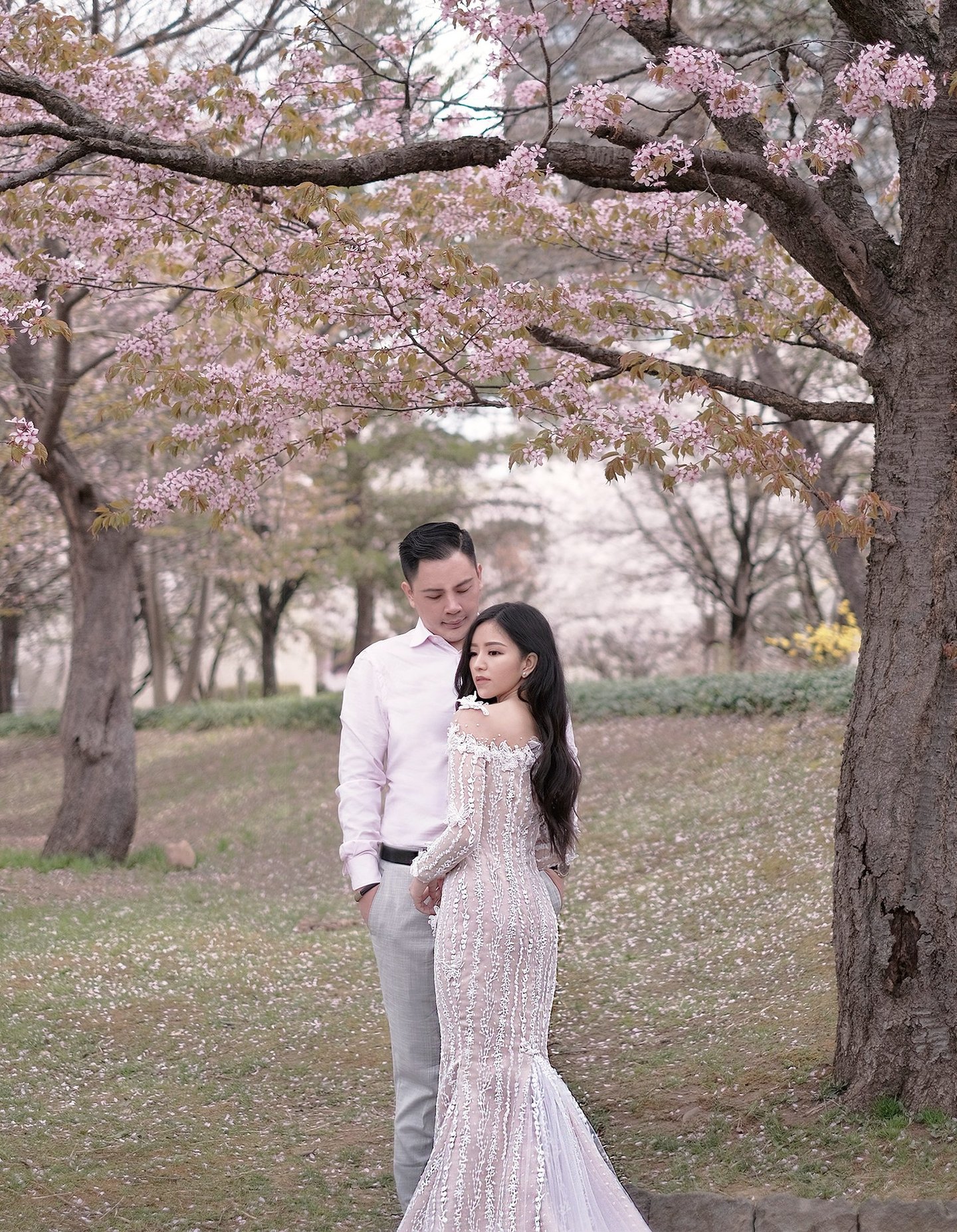 Weightless and full of wonder, this A-line wedding gown flutters with 3D sakura flower appliqué — each petal blooming across soft layers of light fabric. Cinched at the waist for a graceful silhouette, it moves like spring in motion