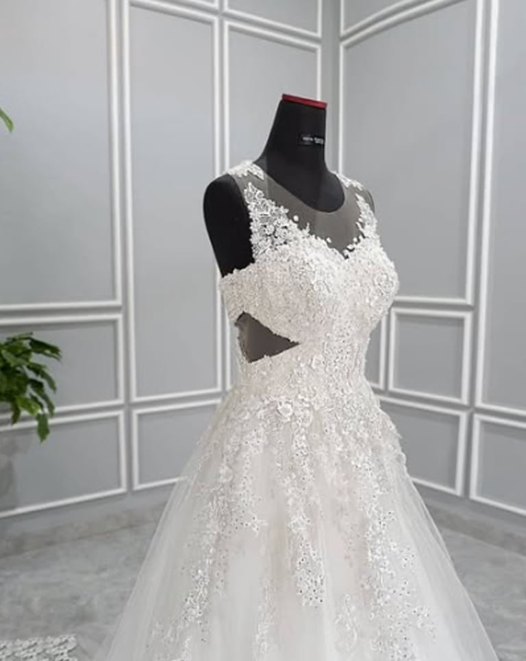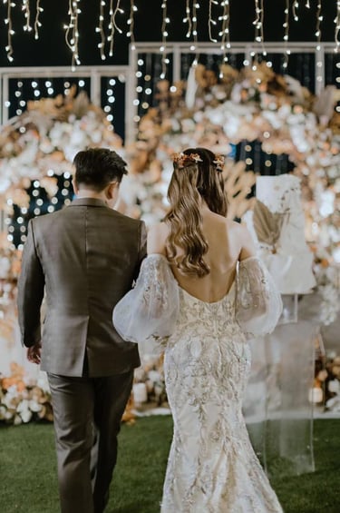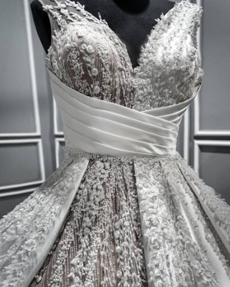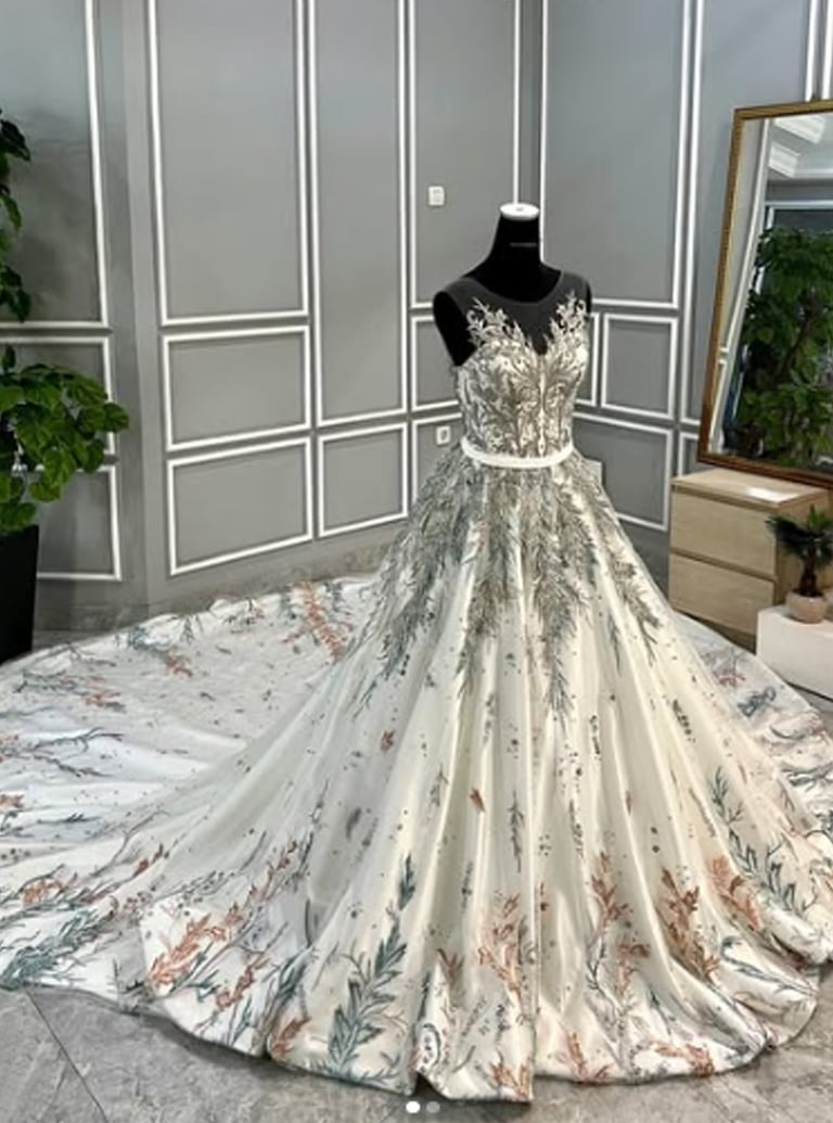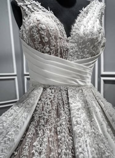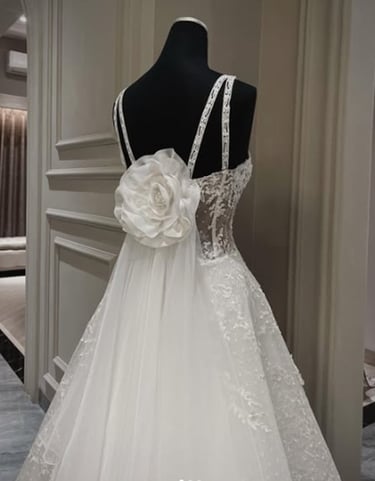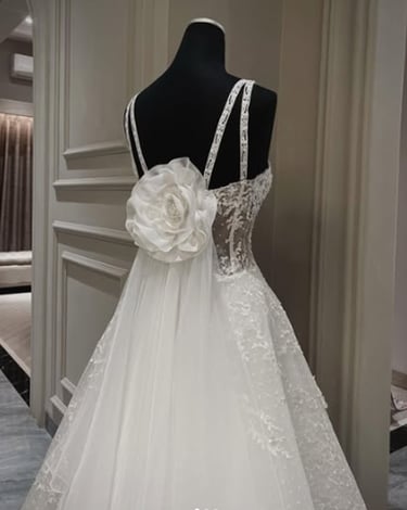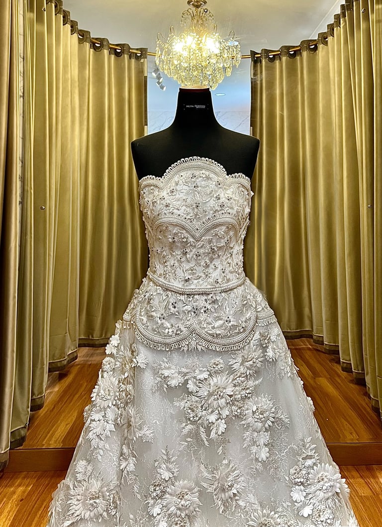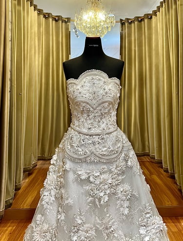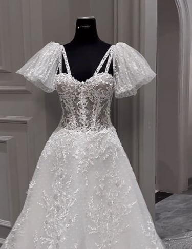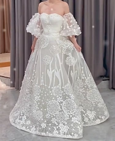 Ballgown blooms with intricate 3D floral appliqués, creating depth, romance, and movement in every step. Soft yet statement-making, it’s a perfect balance of whimsy and elegance for the bride who blossoms in her own way.