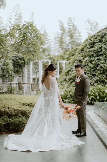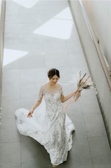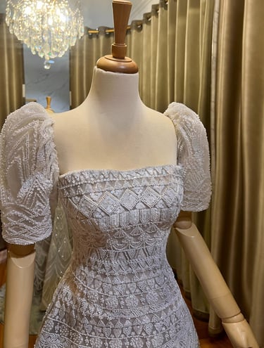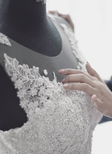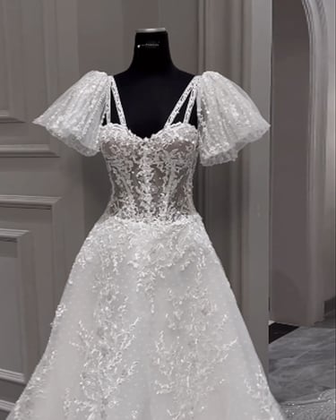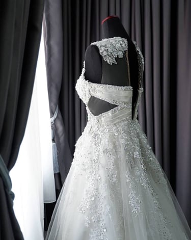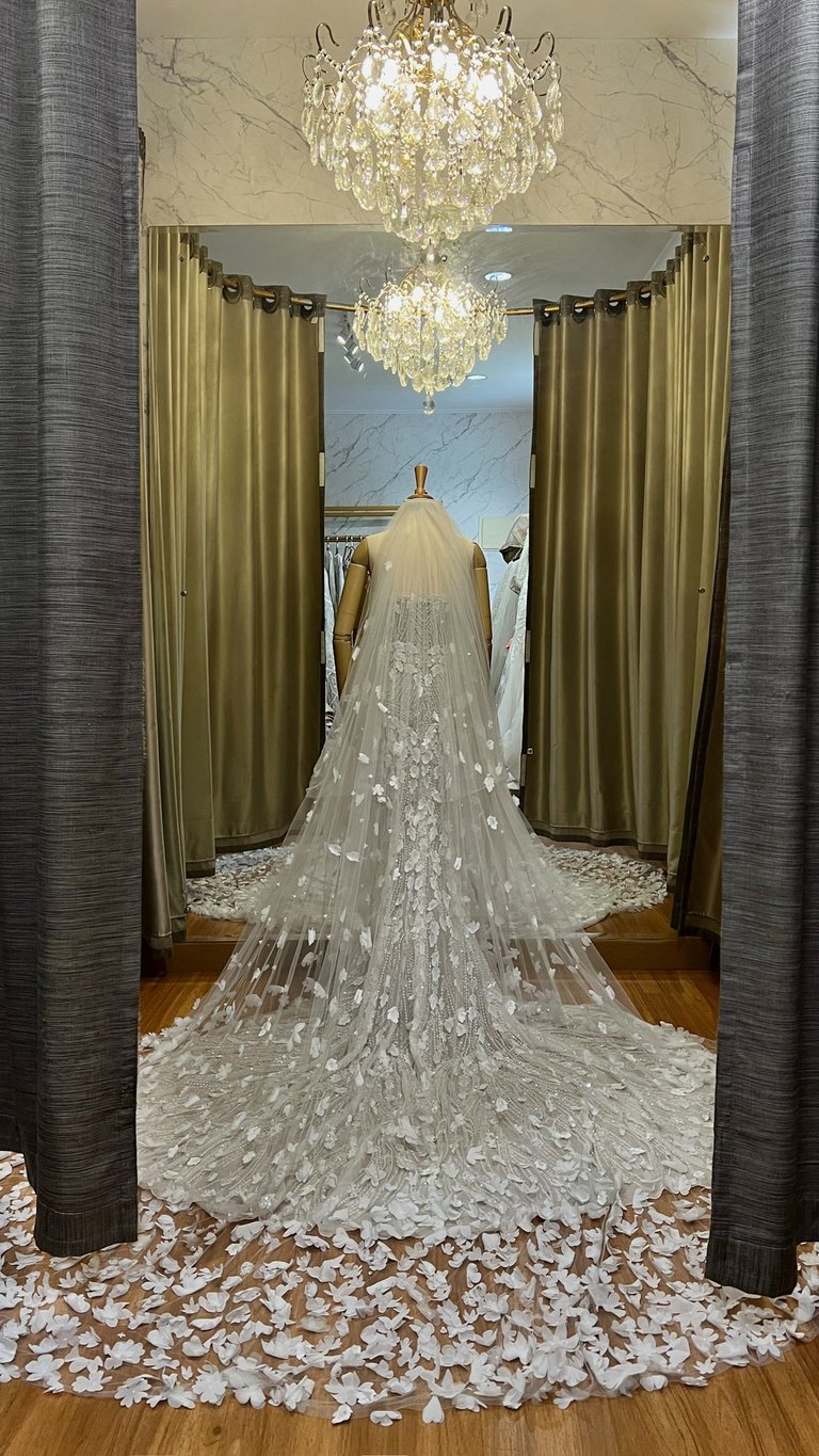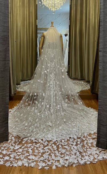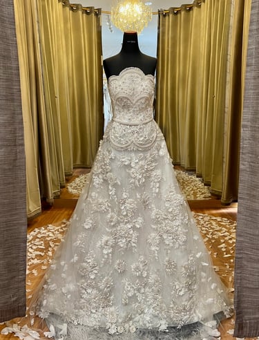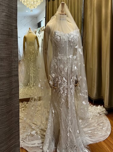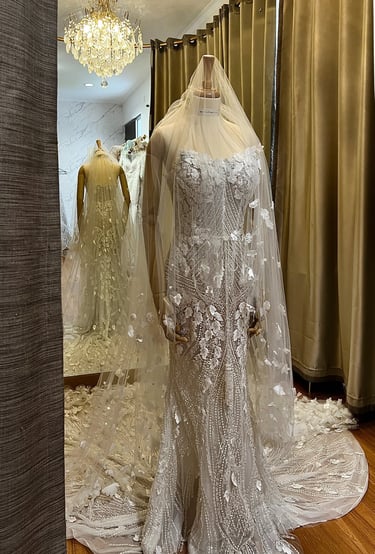Our ready-to-rent wedding gown collection is thoughtfully crafted to allow for easy adjustments and resizing, ensuring a flawless, tailored fit that celebrates every client's unique silhouette. Each rental includes a matching hairpiece, veil, and mannequin.