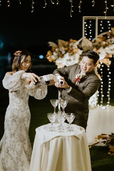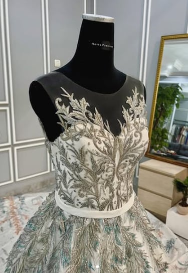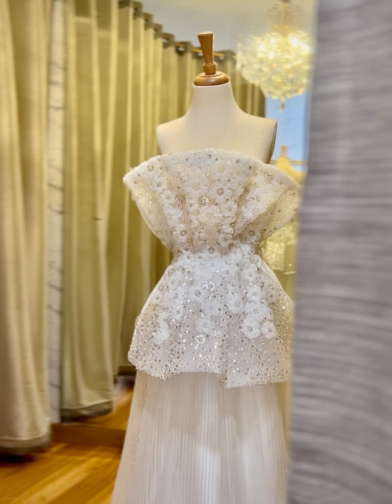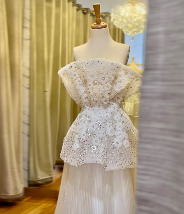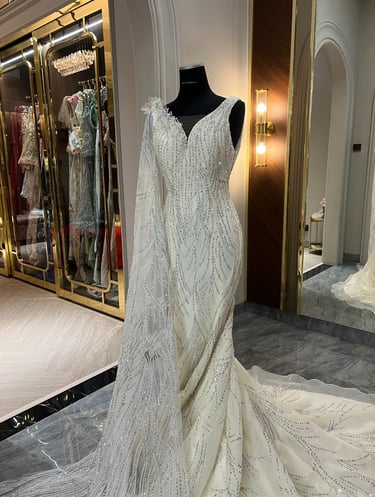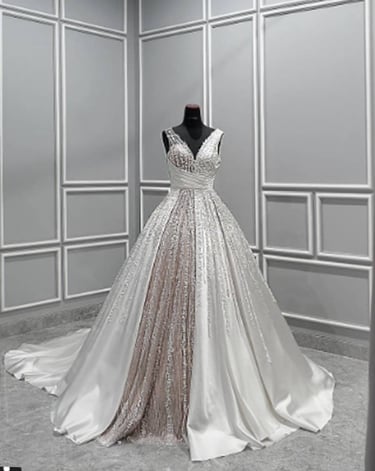 A striking balance of softness and edge ,this asymmetrical ballgown pairs nude and white in a sculptural two-tone design. With flowing volume and modern lines, it redefines bridal elegance for the bride who walks between tradition and innovation.