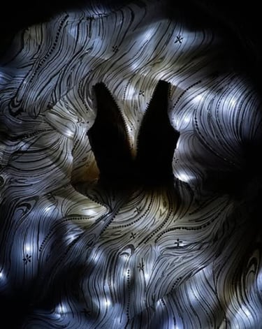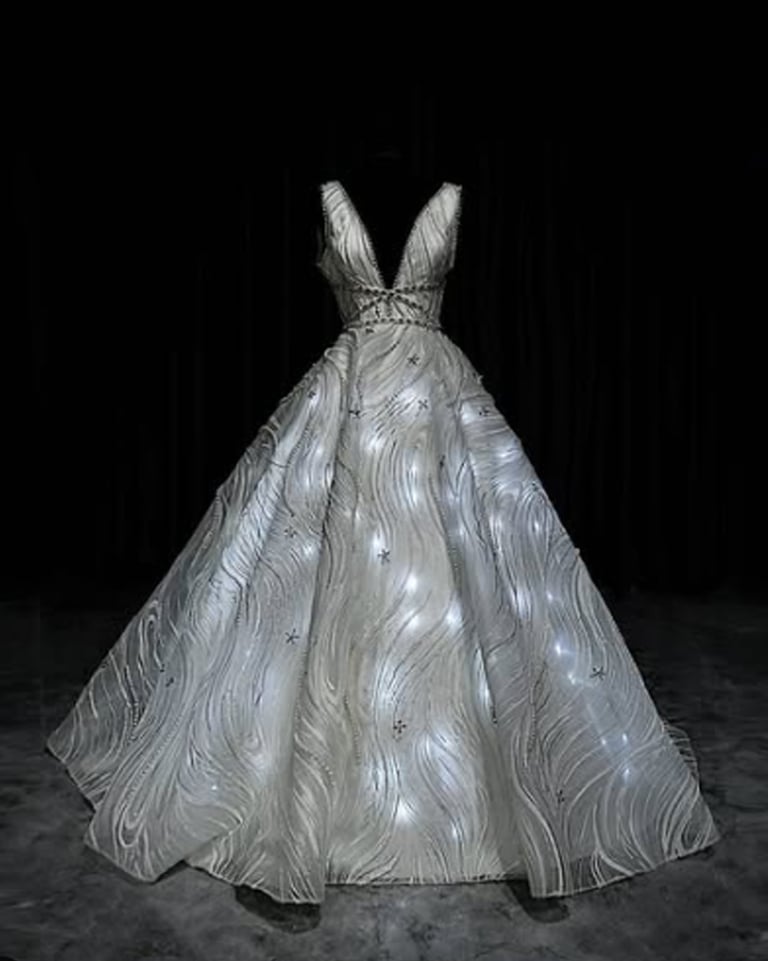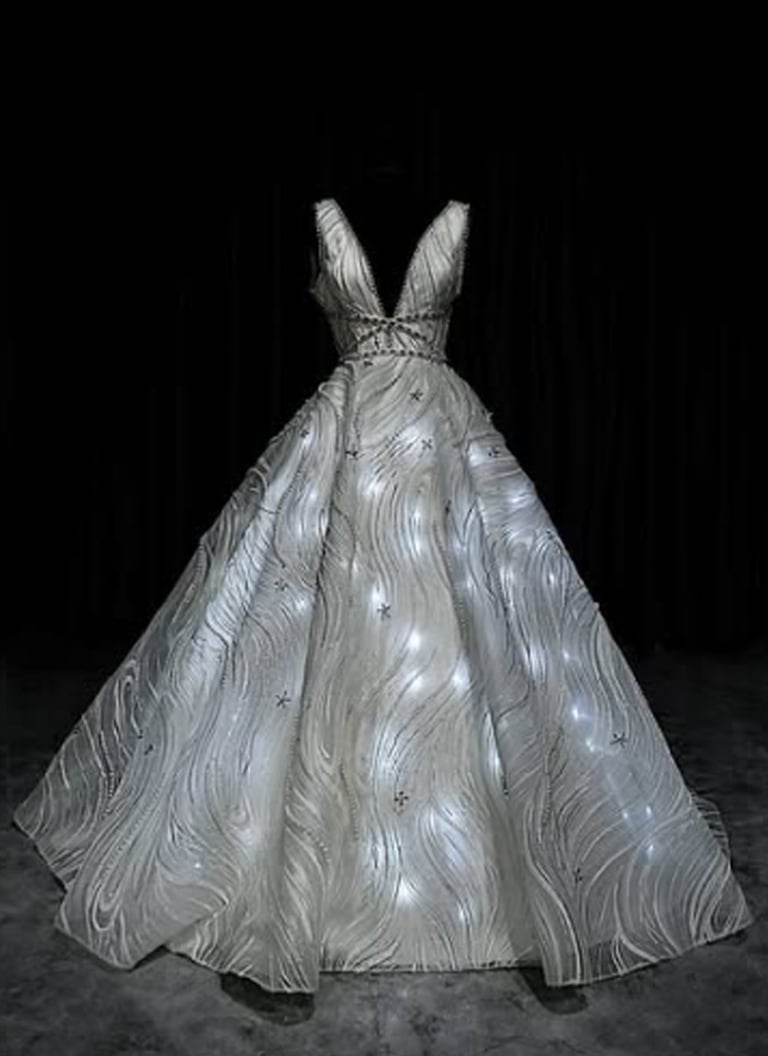 Ballgown dazzles with intricate pearl detailing and glow-in-the-dark flexible lighting accents, intricate pearl detailing, sheer tulle cape that flows from long sleeves like stardust. The deep V neckline adds bold elegance